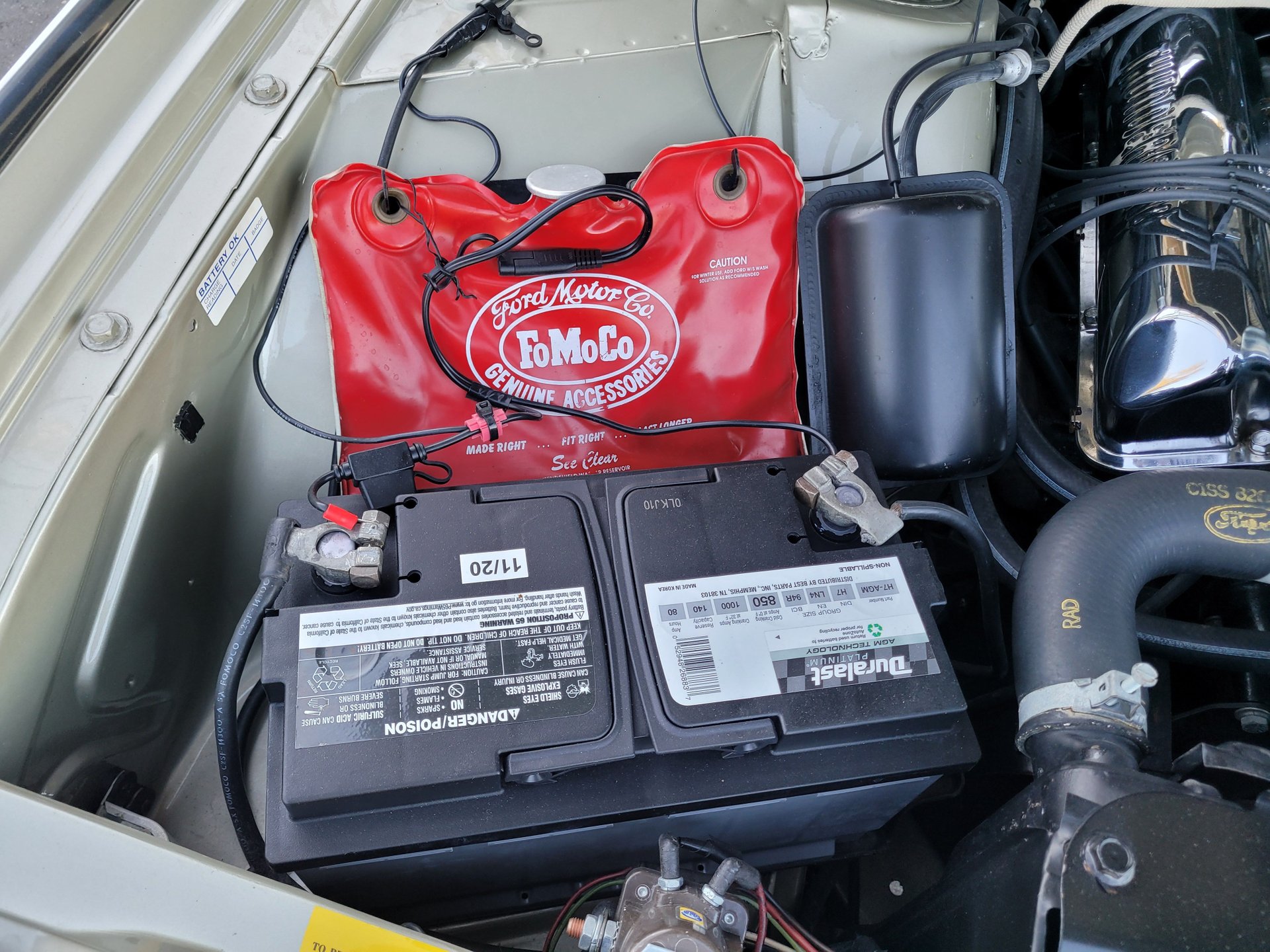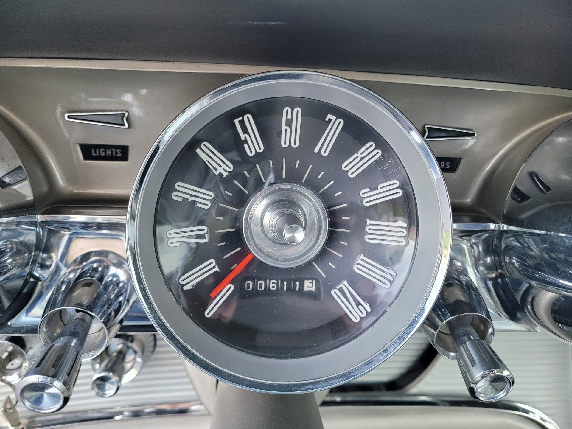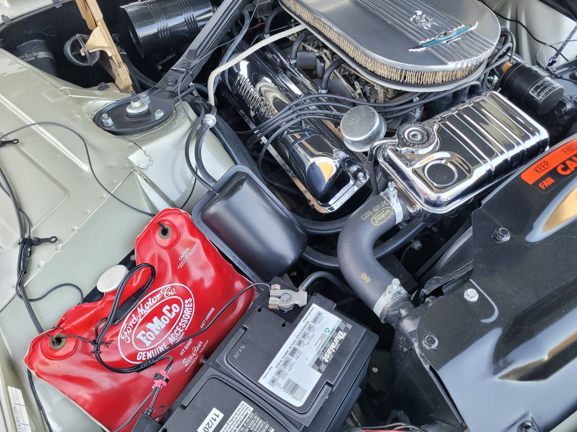 A big chrome bumper wraps up around the edges of quad headlights and grill and it has a hood mean looking scoop. The fins on the rear make and the two round taillights look similar to airplane jet afterburners to complete the Ford design statement.