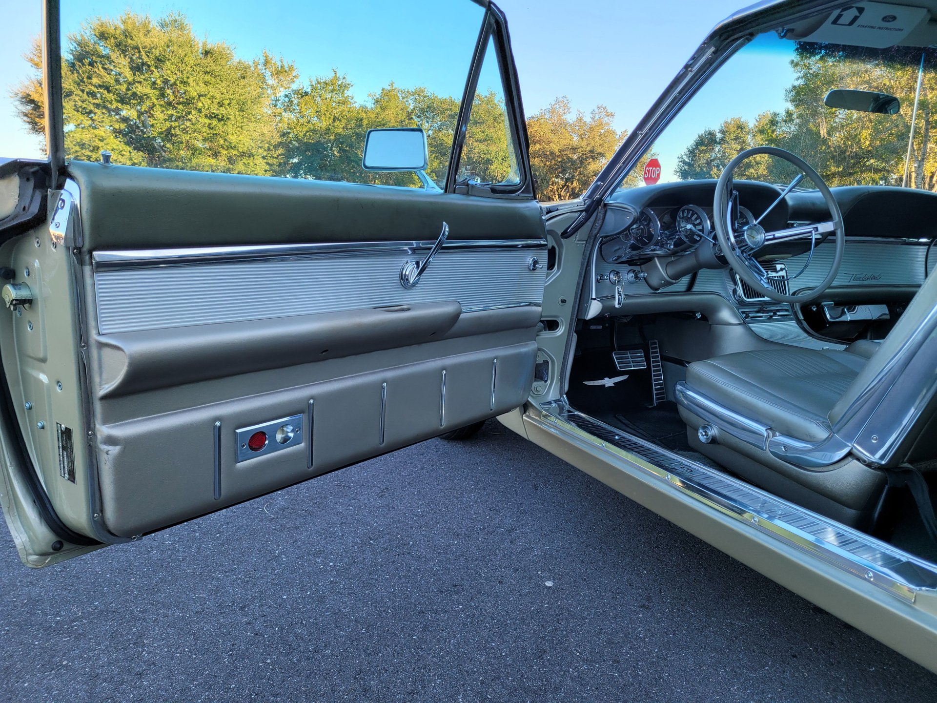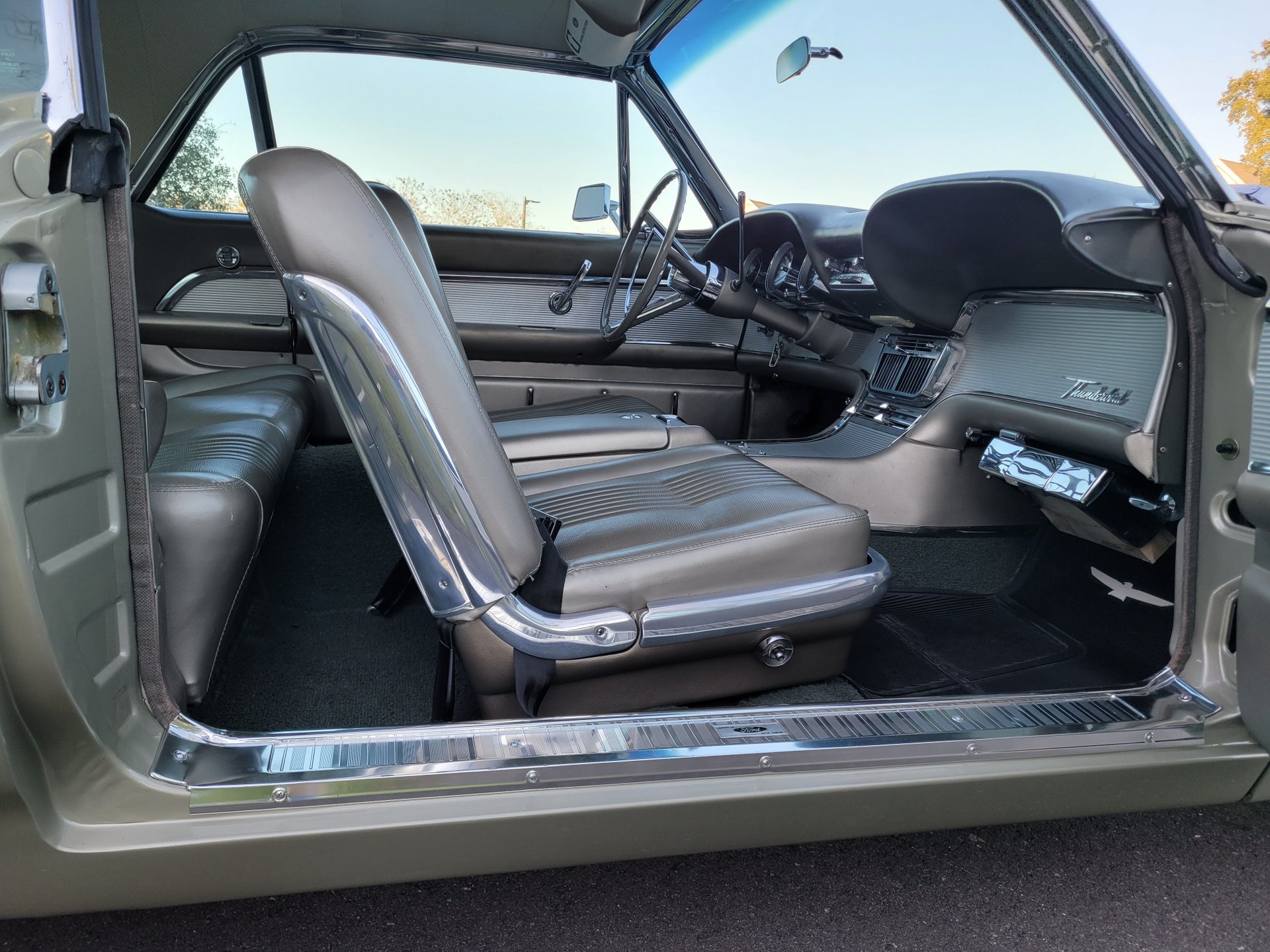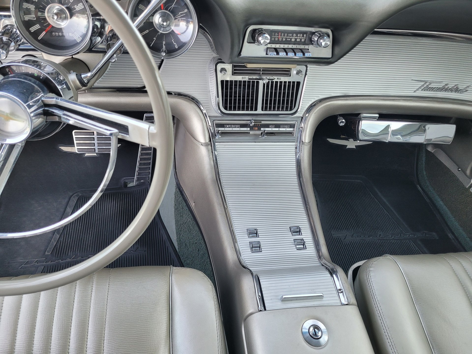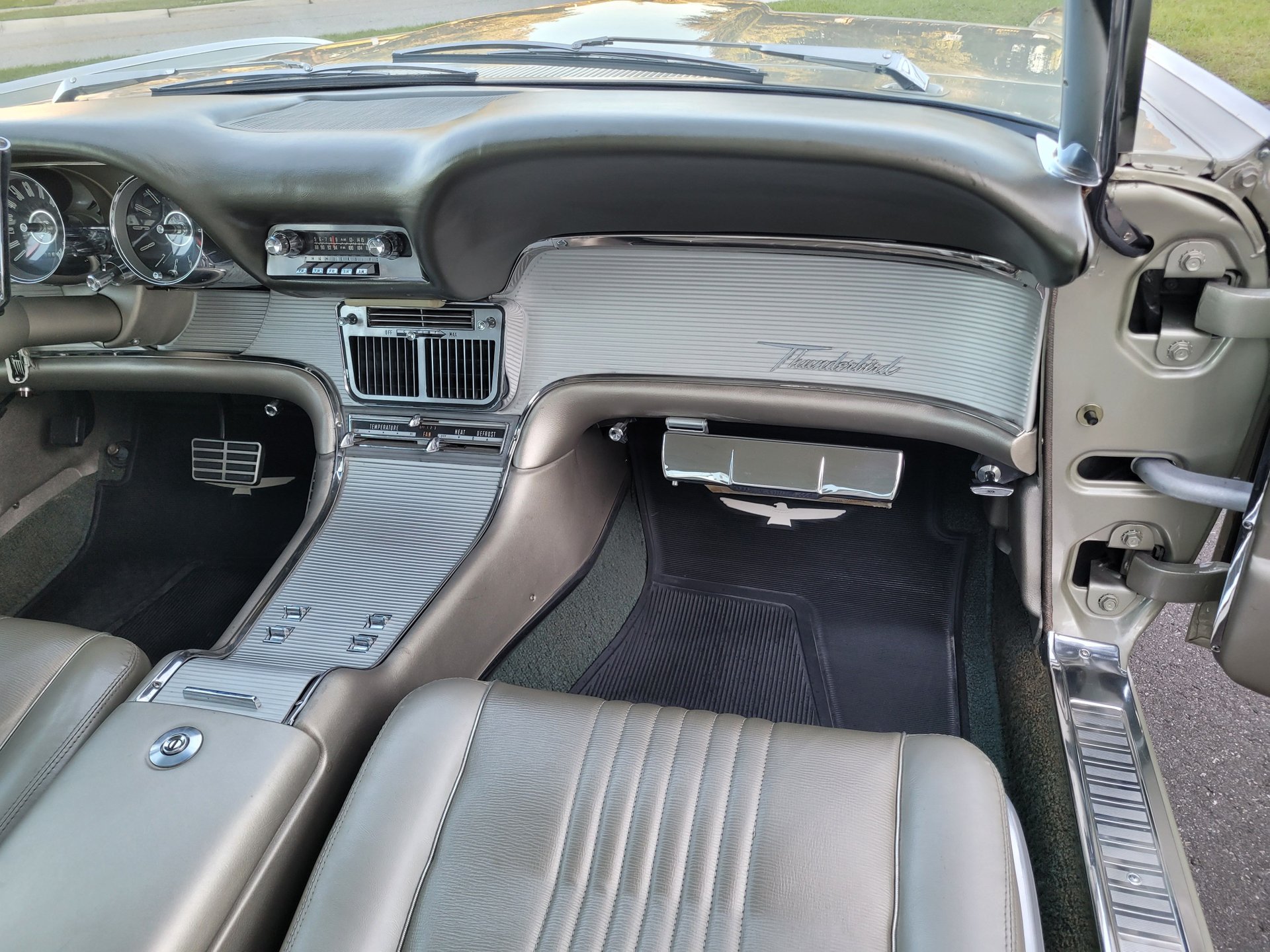 Our Thunderbird comes with the totally stock looking new gold matching interior that was outfitted with a number of desirable options, including power windows, factory air conditioning, the “space age” influenced instrument pod in front of the operator, remote sideview mirror, factory Thunderbird-labelled AM/FM pushbutton radio, tissue dispenser, distinctive center console and an inviting interior layout that instantly reminds you that this is a special car.