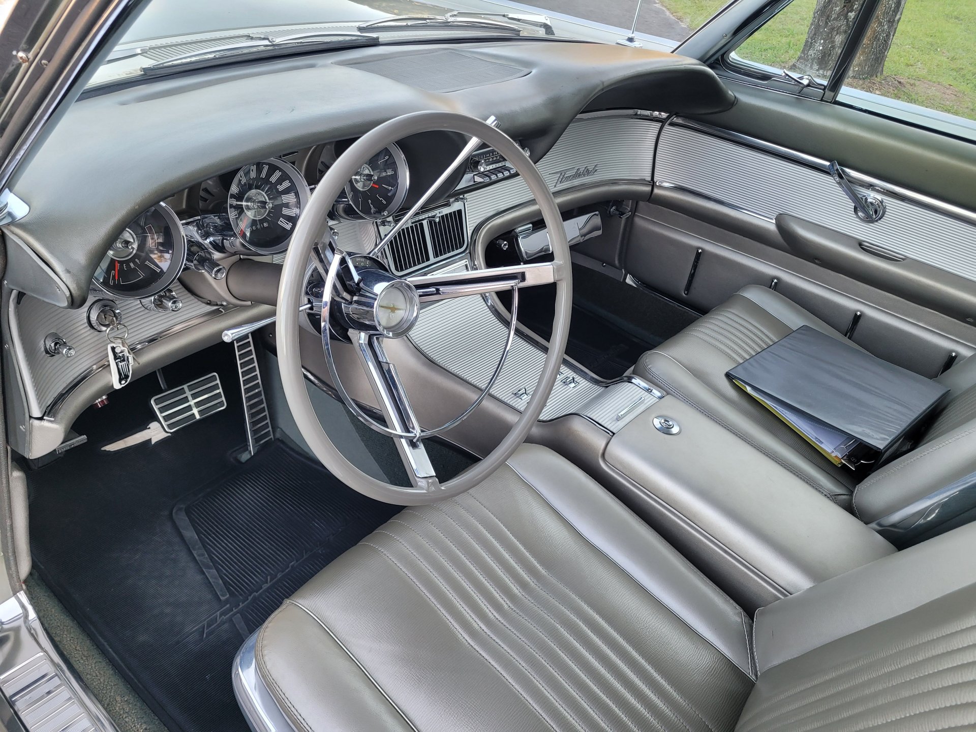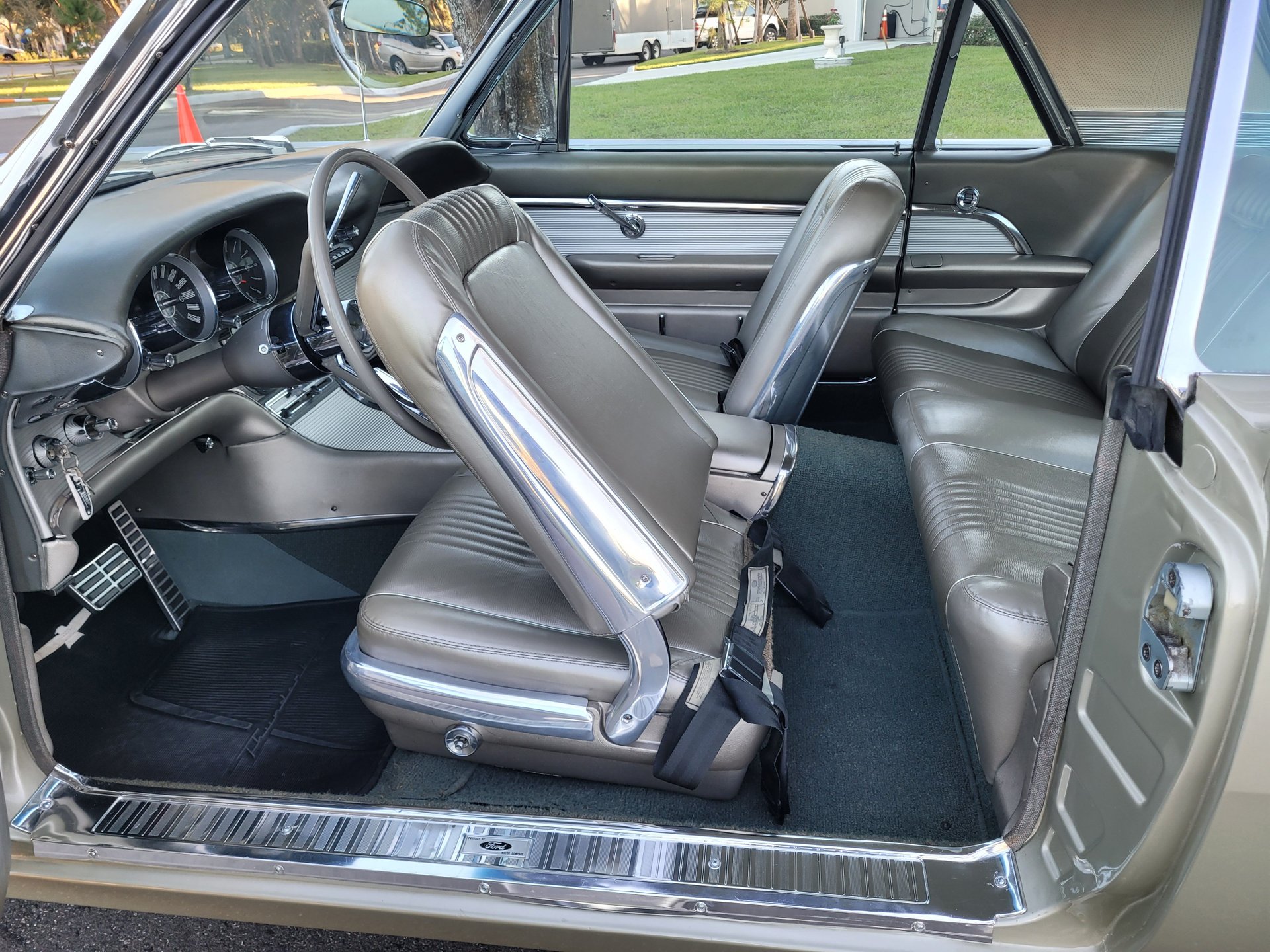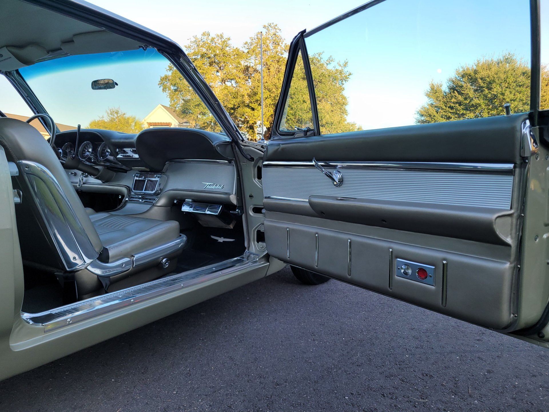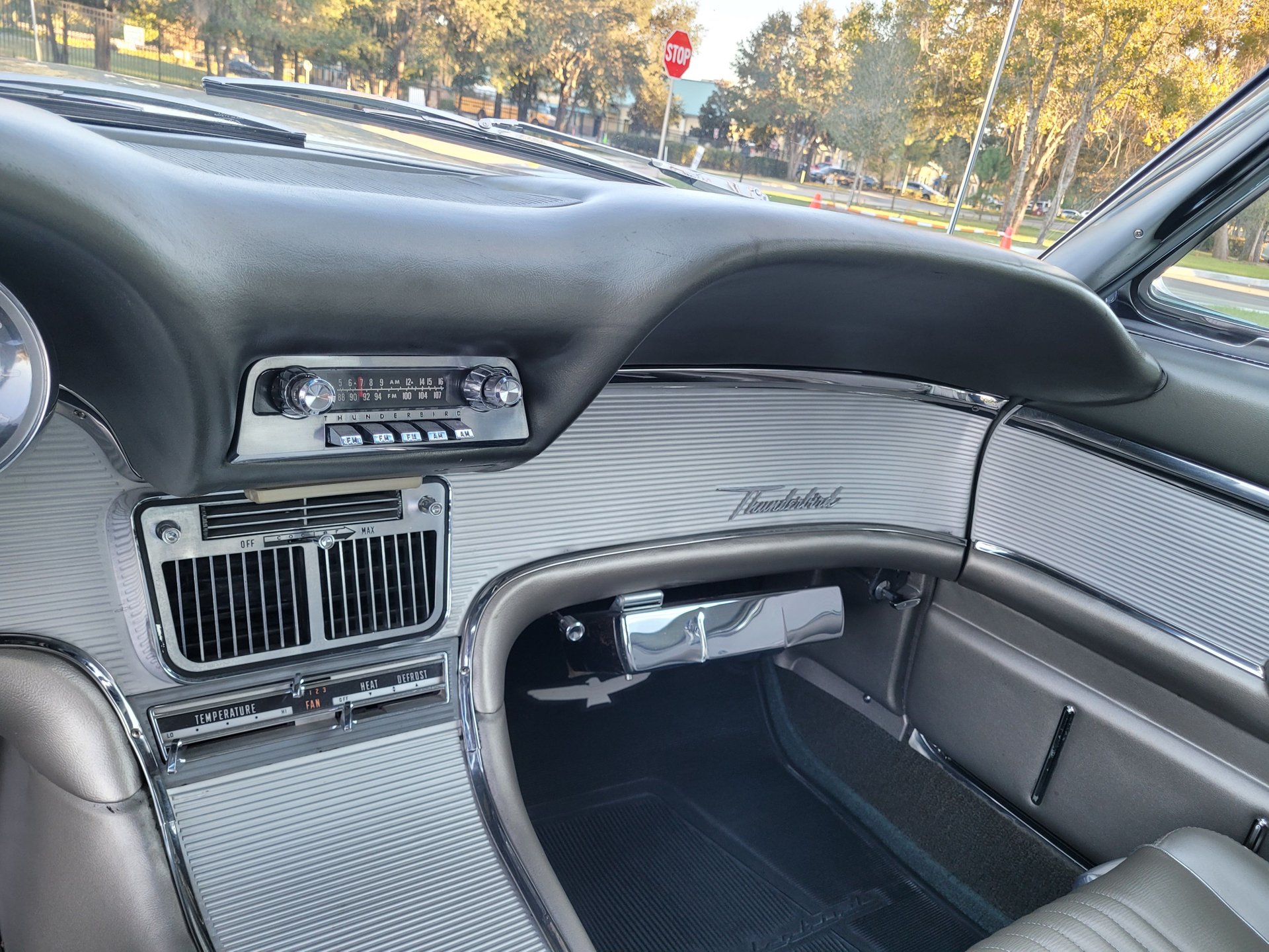 Our Thunderbird comes with the totally stock looking new gold matching interior that was outfitted with a number of desirable options, including power windows, factory air conditioning, the “space age” influenced instrument pod in front of the operator, remote sideview mirror, factory Thunderbird-labelled AM/FM pushbutton radio, tissue dispenser, distinctive center console and an inviting interior layout that instantly reminds you that this is a special car.