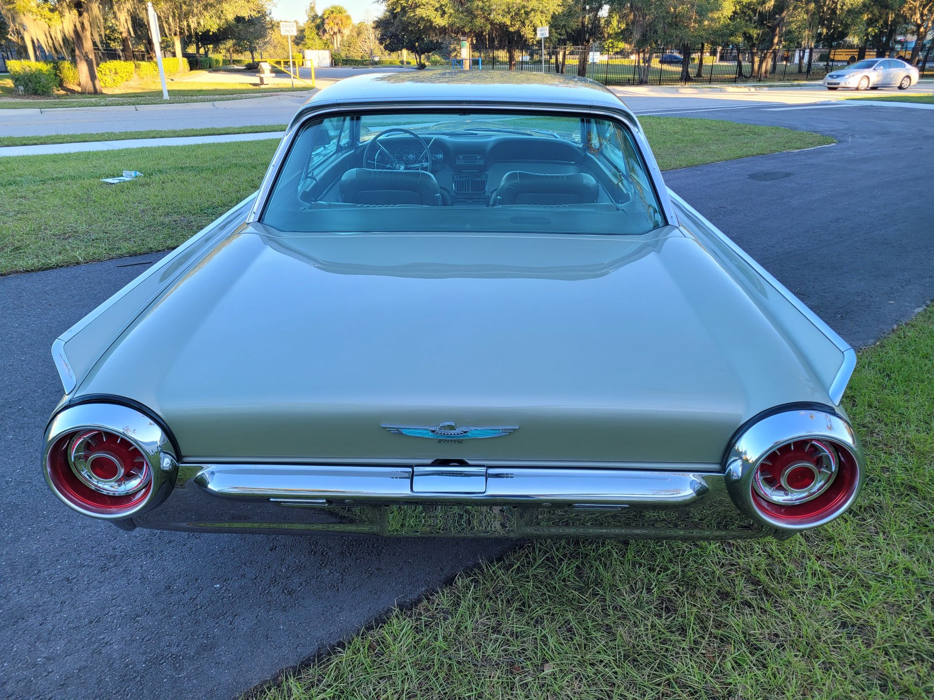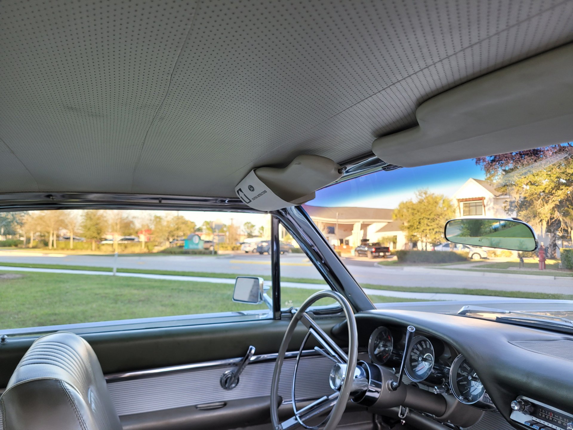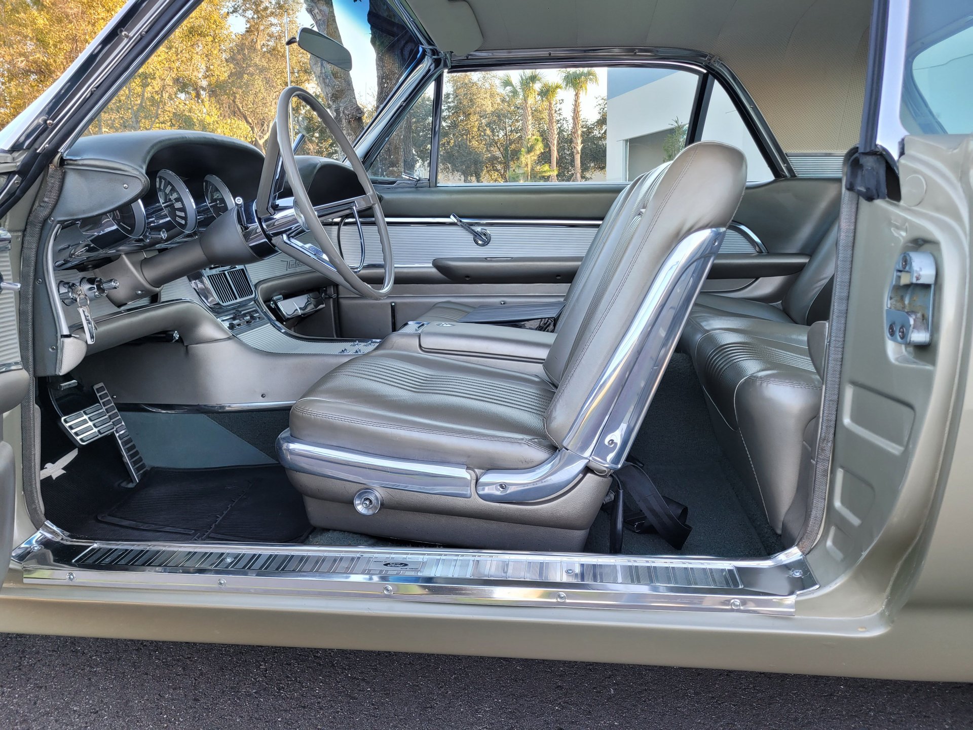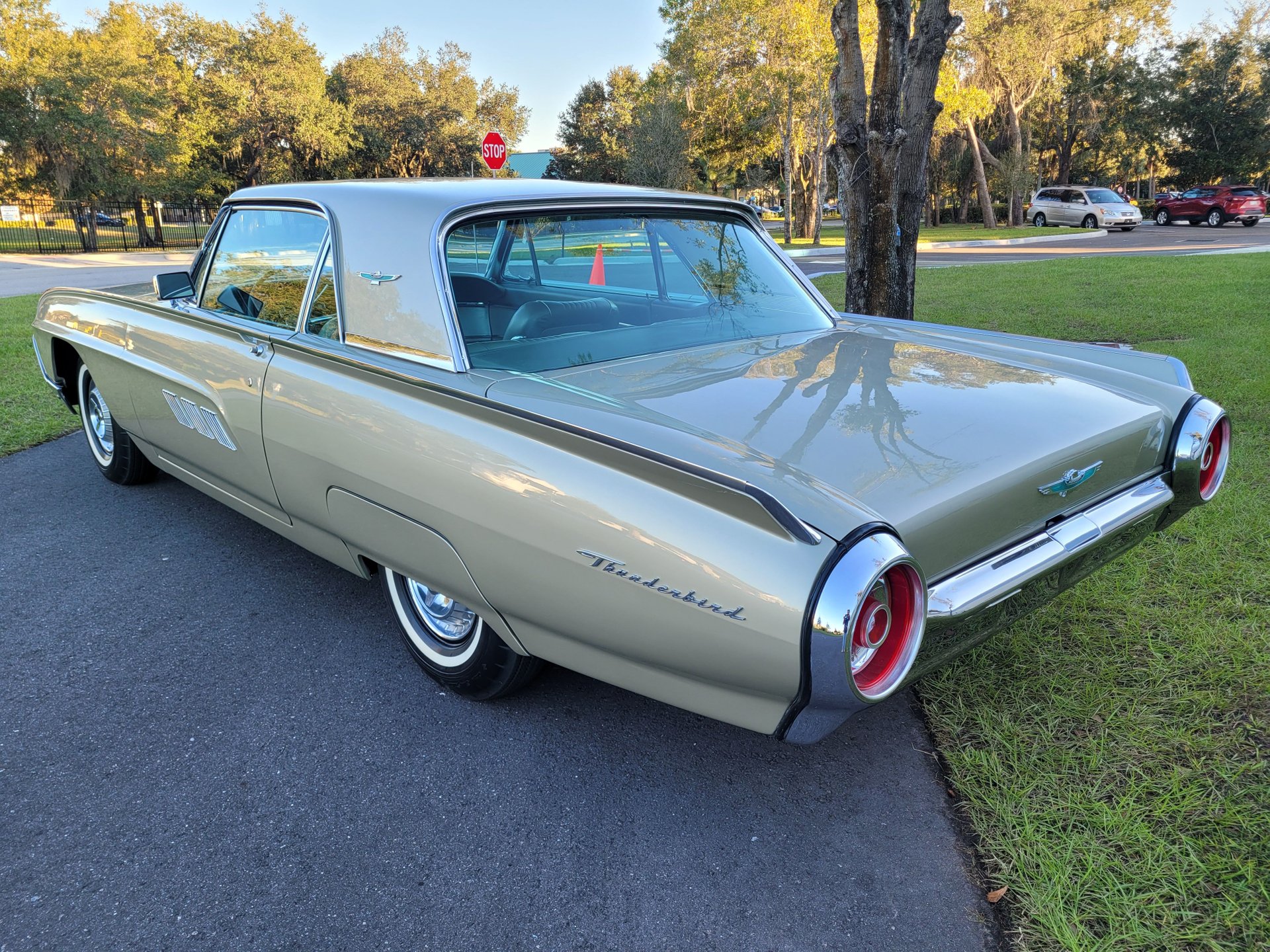Our Thunderbird comes with the totally stock looking new gold matching interior that was outfitted with a number of desirable options, including power windows, factory air conditioning, the “space age” influenced instrument pod in front of the operator, remote sideview mirror, factory Thunderbird-labelled AM/FM pushbutton radio, tissue dispenser, distinctive center console and an inviting interior layout that instantly reminds you that this is a special car.