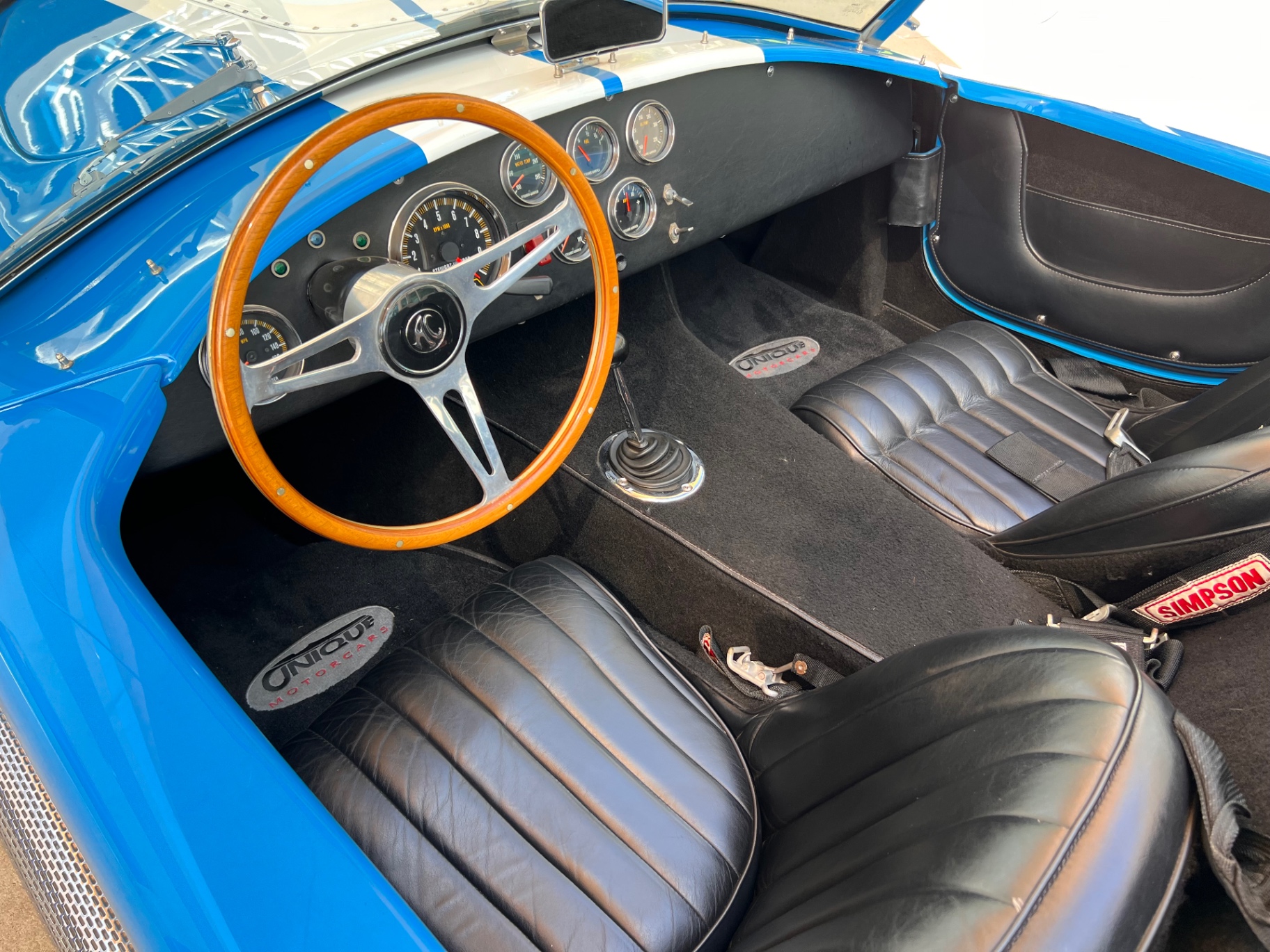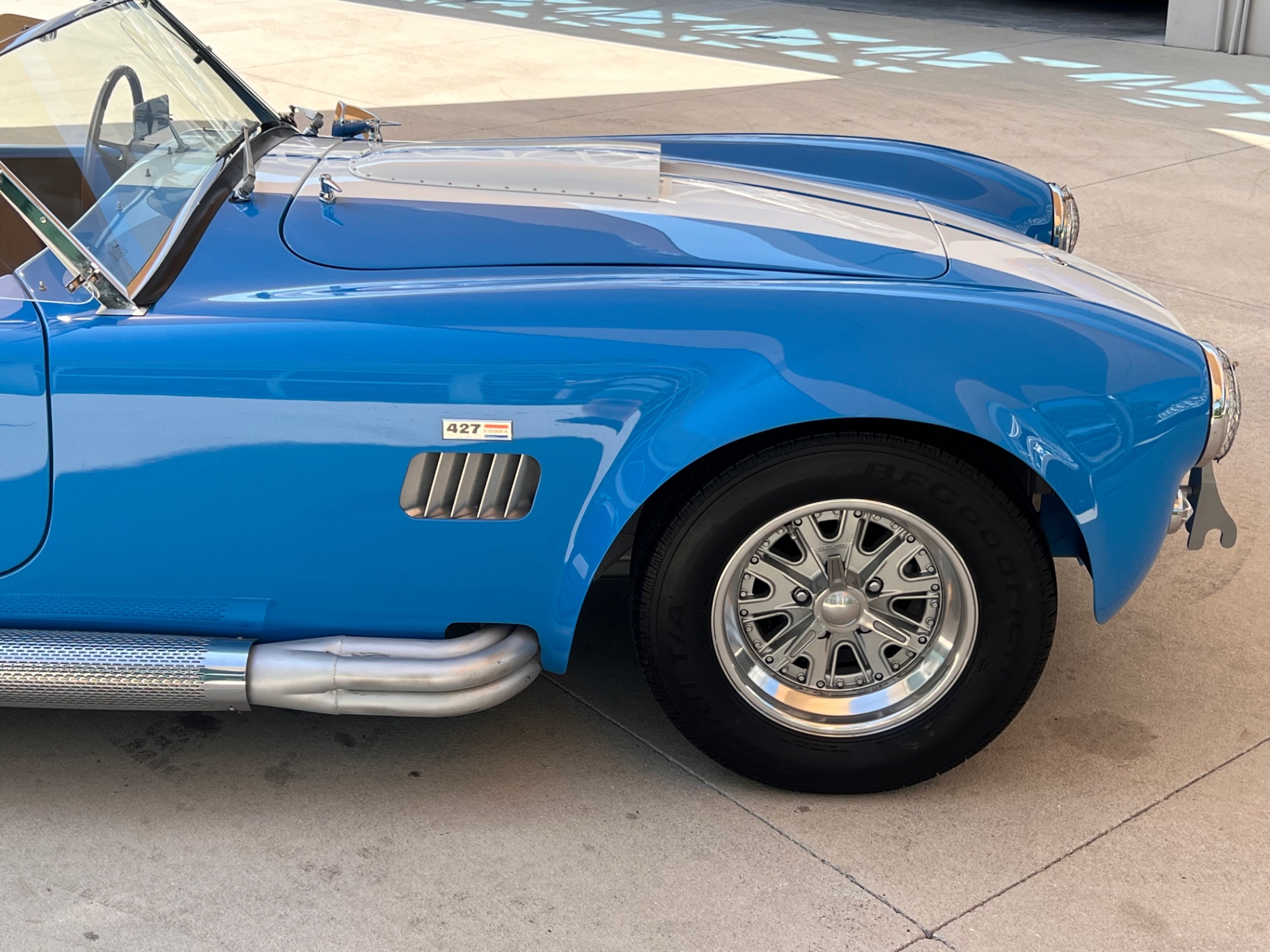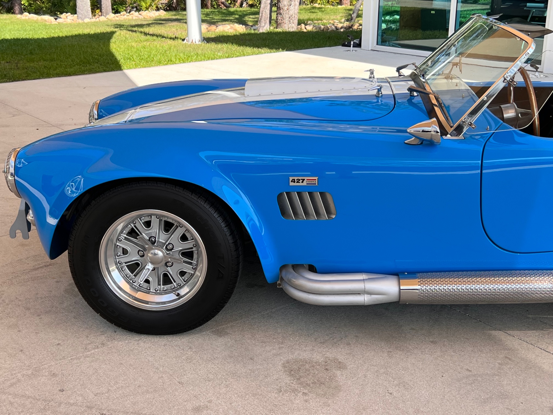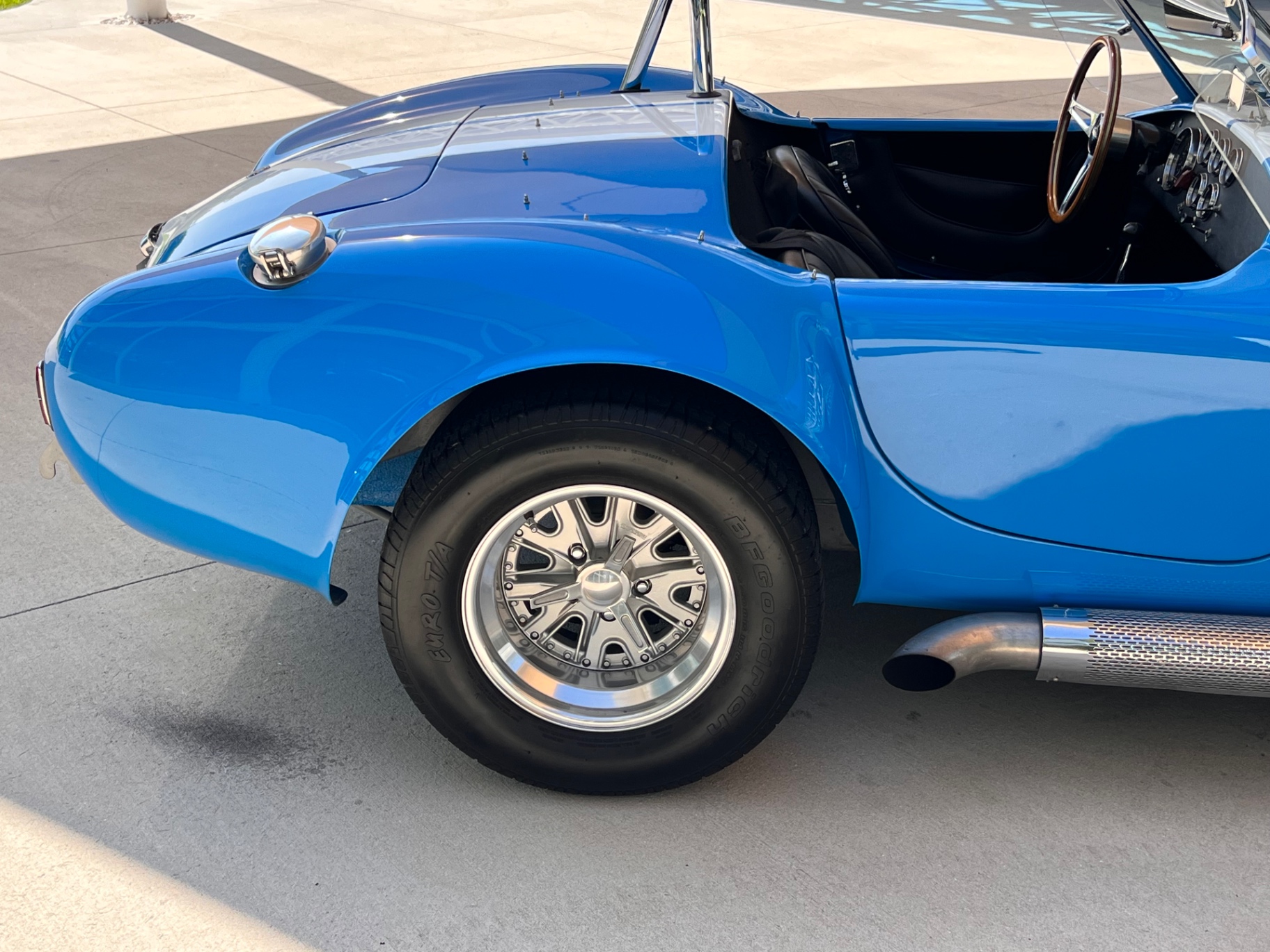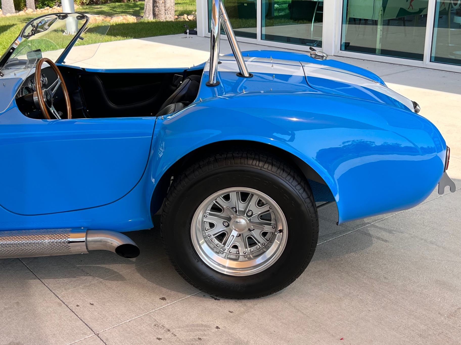 Titled as a 1965 Ford Shelby Cobra 427 cubic inch stroked to a 462 cubic inch performance engine Aluminum intake Performance carb Ford Cobra aluminum valve covers Aftermarket spark plug wires Open element air cleaner Exhaust headers leading out to side-pipes External Oil Filters Ford T-10 4 speed transmission 3.55 posi rear end. Wilwood Disc Brakes Jaguar Independent Rear suspension Custom Frame Tubular A-Arms External Oil Filters Carrera adjustable coil overs Black Leather bucket seats Center tunnel Black door panels Full compliment of Stewart Warner gauges Wood/polished sport steering wheel Simpson Racing seat belts Single loop chrome roll bar Floor shifter Black carpet Unique Cobra floor mats. Ford Grabber Blue paint with painted white stripes covering the iconic Cobra body Flared fenders Shelby hood scoop, side vents, chrome trim Chrome front and rear racing bumper/hooks 427 Shelby Cobra badging LED Tail Lights Correct Cobra Windshield with correct Wing Glass’ Snap On Cockpit Cover Moroso kill switch Compumotive Wheels Black sidewall fat tires all around