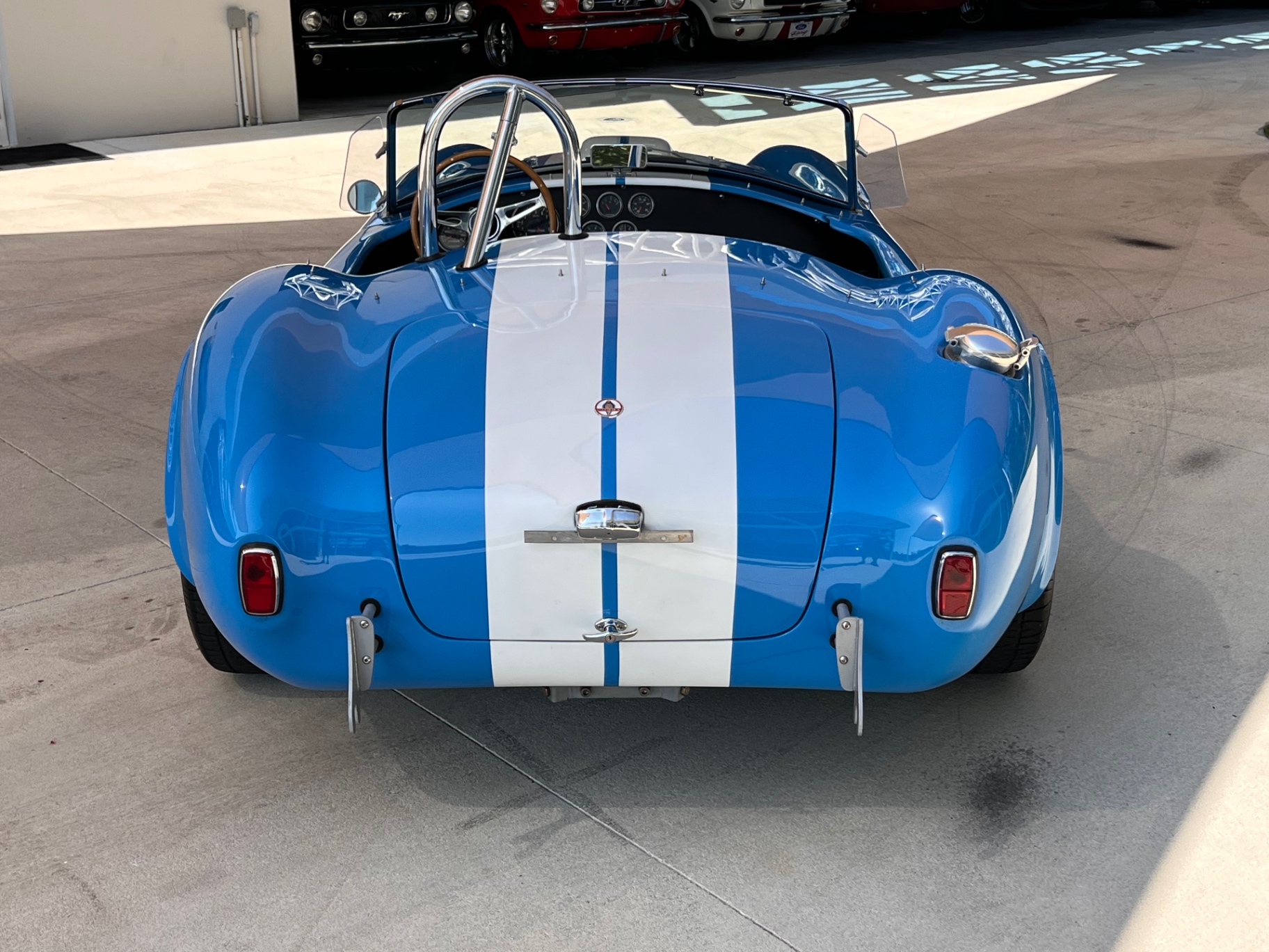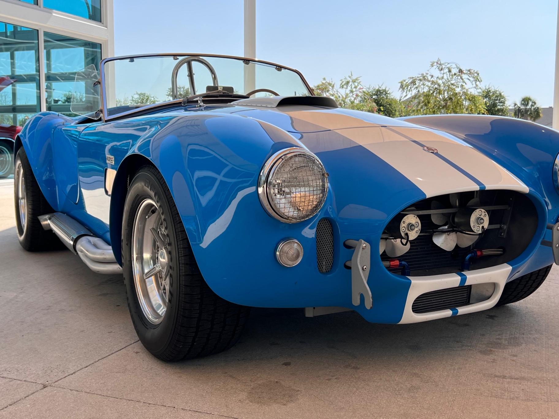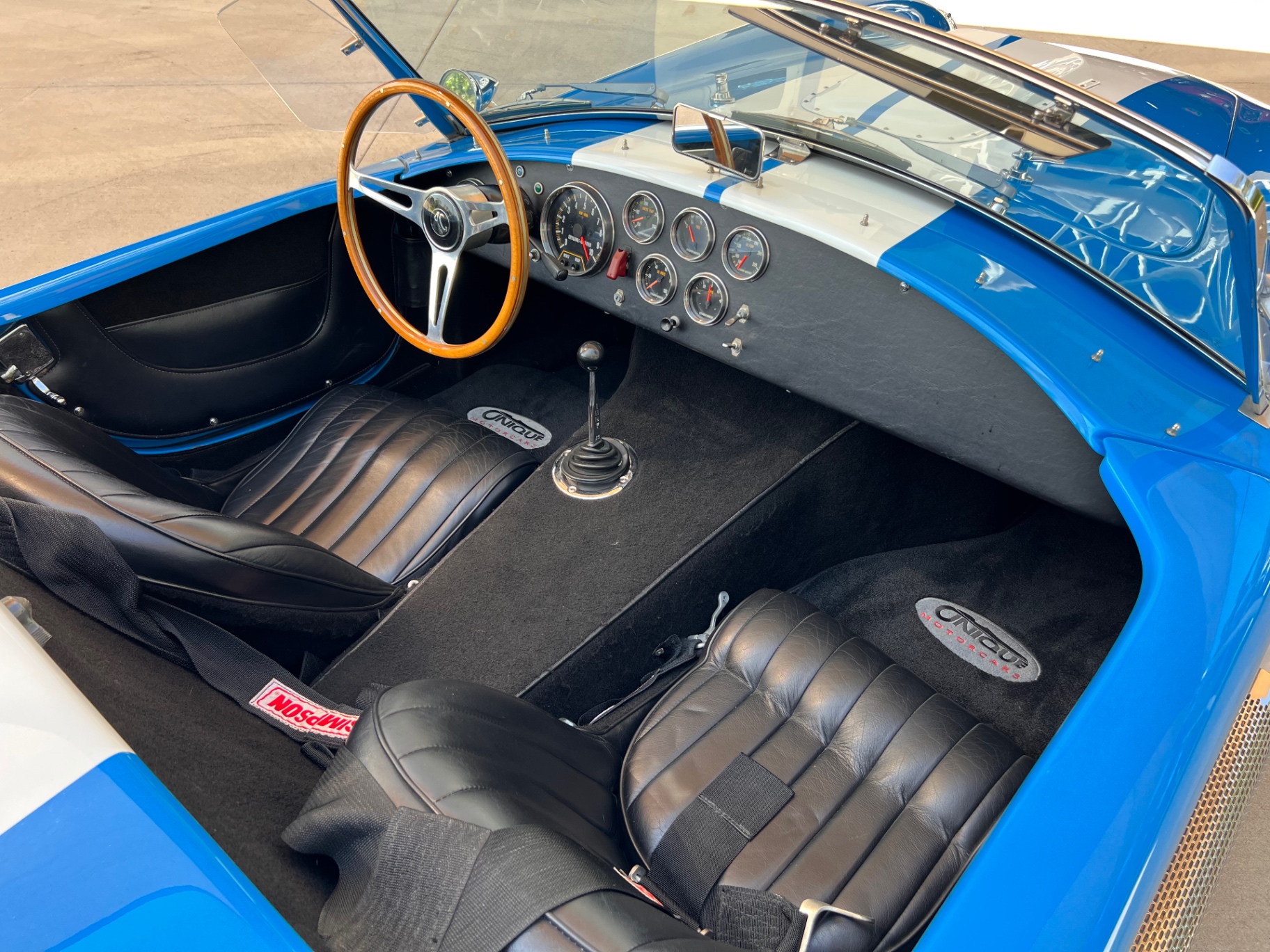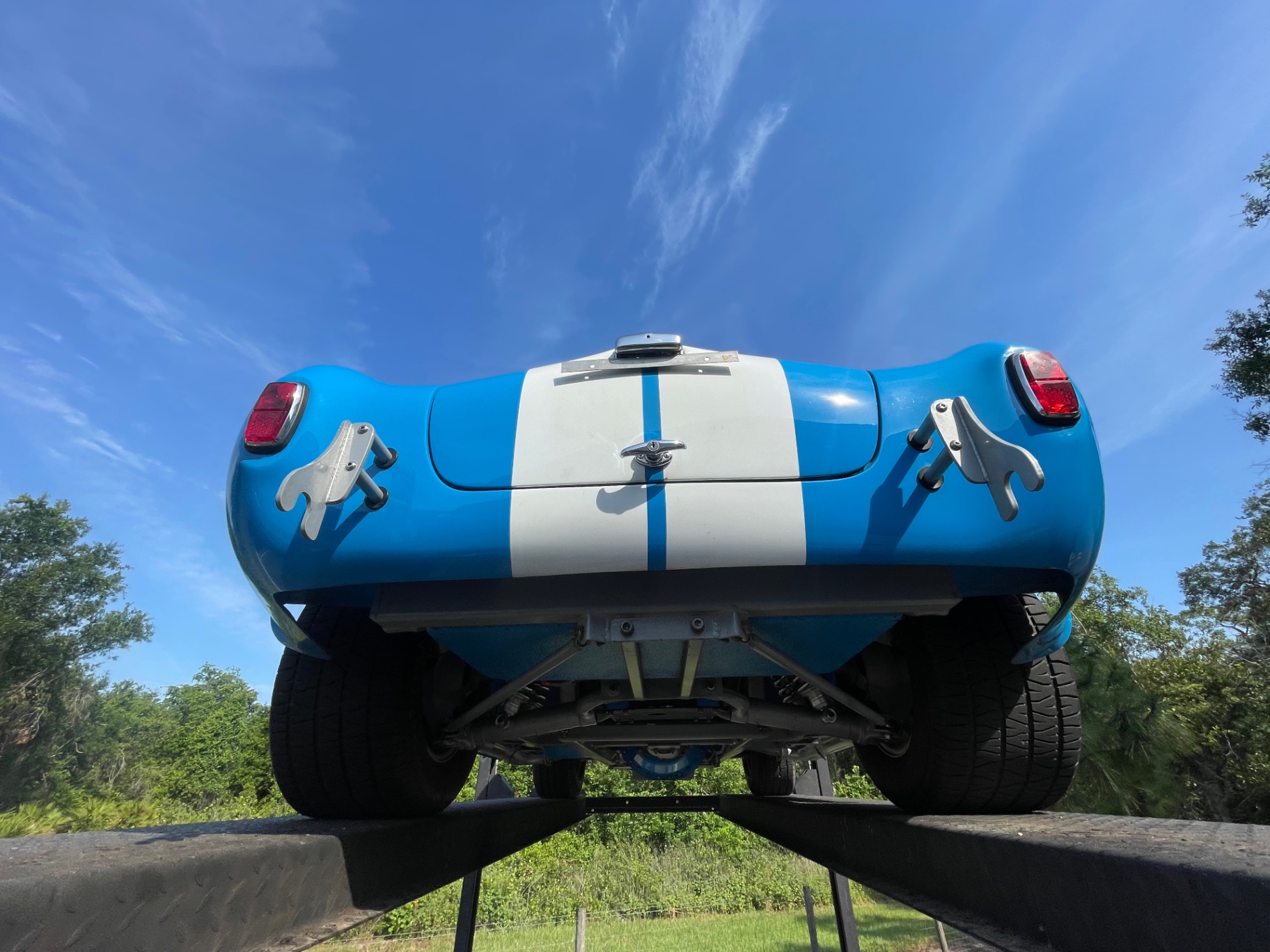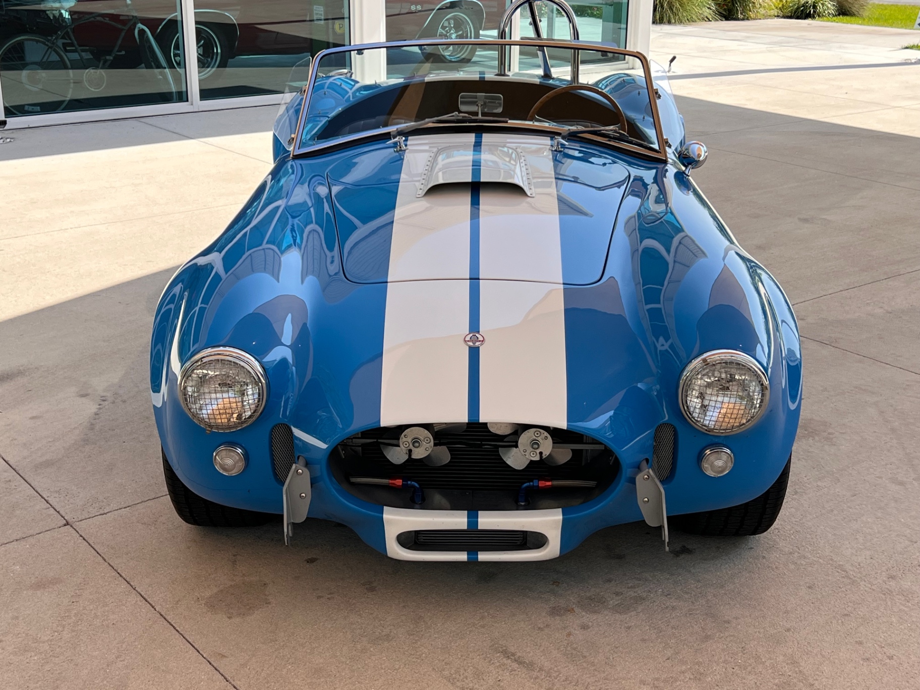 Titled as a 1965 Ford Shelby Cobra 427 cubic inch stroked to a 462 cubic inch performance engine Aluminum intake Performance carb Ford Cobra aluminum valve covers Aftermarket spark plug wires Open element air cleaner Exhaust headers leading out to side-pipes External Oil Filters Ford T-10 4 speed transmission 3.55 posi rear end. Wilwood Disc Brakes Jaguar Independent Rear suspension Custom Frame Tubular A-Arms External Oil Filters Carrera adjustable coil overs Black Leather bucket seats Center tunnel Black door panels Full compliment of Stewart Warner gauges Wood/polished sport steering wheel Simpson Racing seat belts Single loop chrome roll bar Floor shifter Black carpet Unique Cobra floor mats. Ford Grabber Blue paint with painted white stripes covering the iconic Cobra body Flared fenders Shelby hood scoop, side vents, chrome trim Chrome front and rear racing bumper/hooks 427 Shelby Cobra badging LED Tail Lights Correct Cobra Windshield with correct Wing Glass’ Snap On Cockpit Cover Moroso kill switch Compumotive Wheels Black sidewall fat tires all around