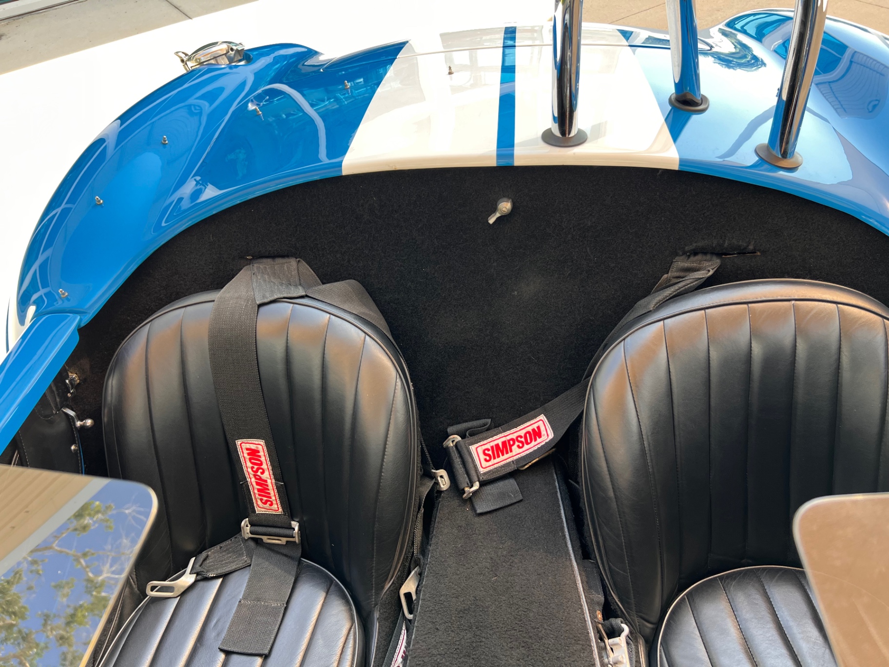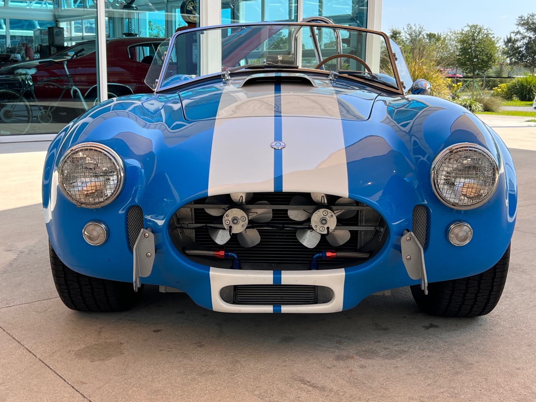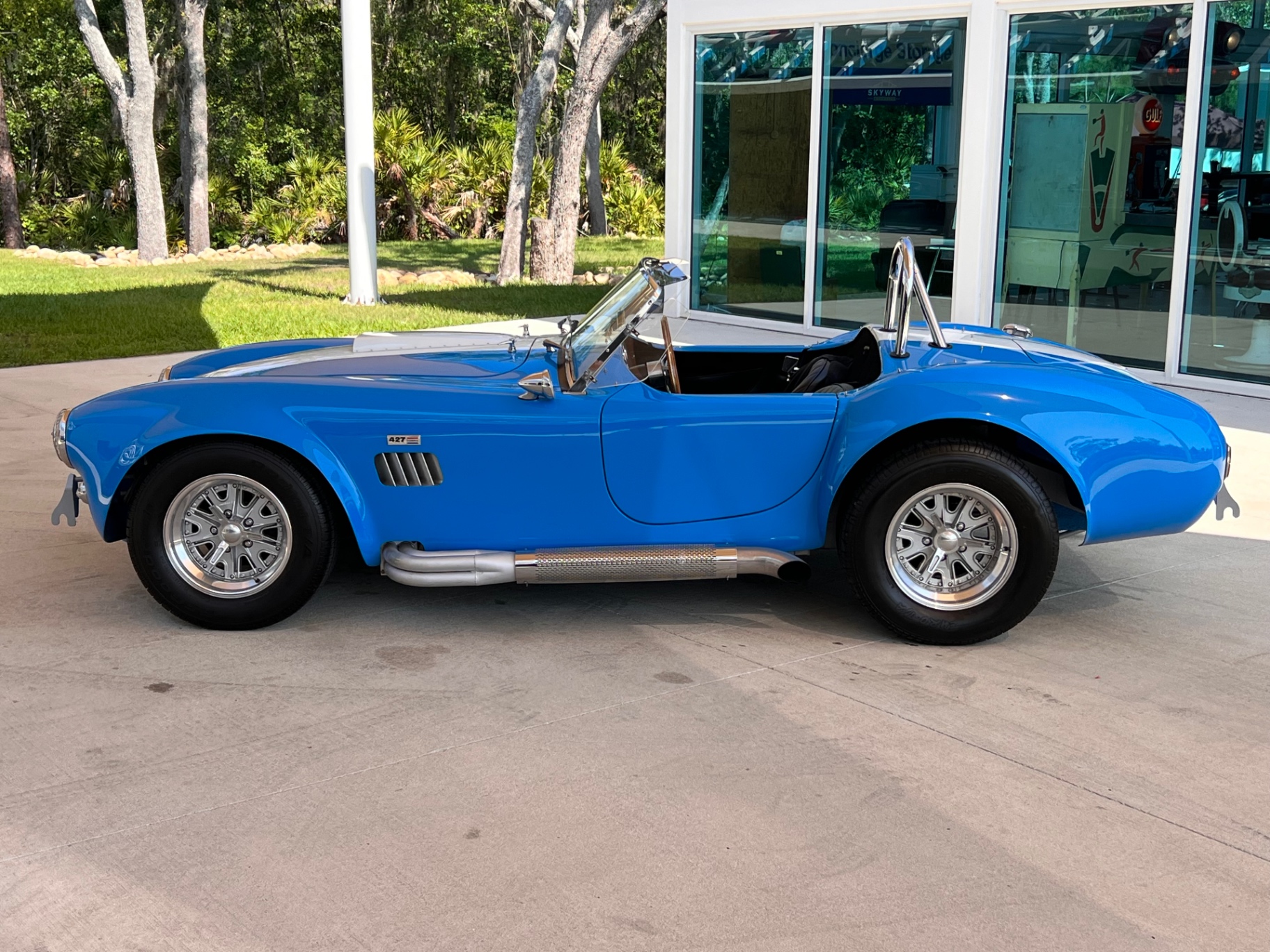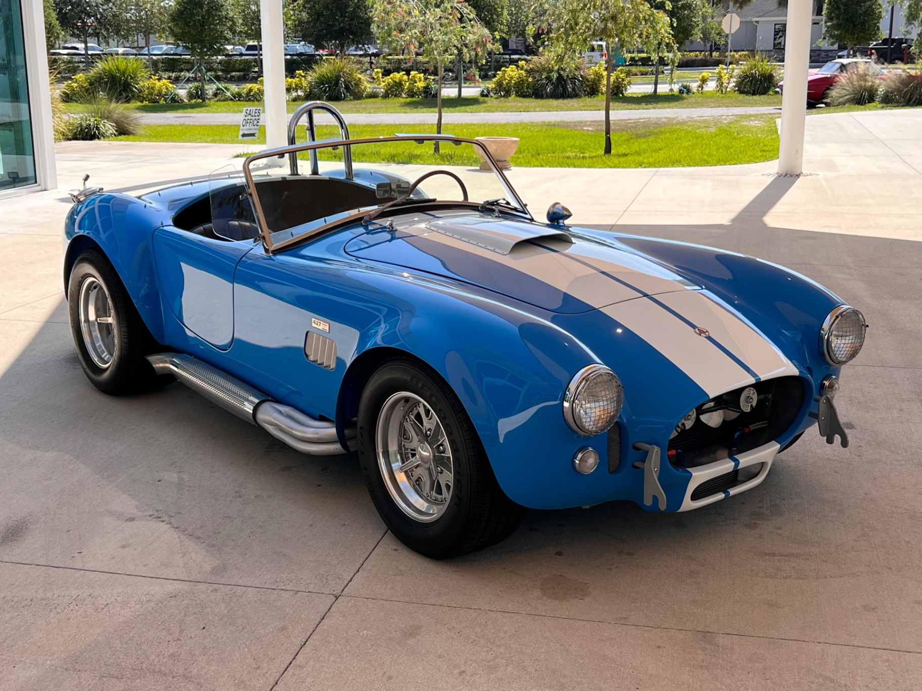 Titled as a 1965 Ford Shelby Cobra 427 cubic inch stroked to a 462 cubic inch performance engine Aluminum intake Performance carb Ford Cobra aluminum valve covers Aftermarket spark plug wires Open element air cleaner Exhaust headers leading out to side-pipes External Oil Filters Ford T-10 4 speed transmission 3.55 posi rear end. Wilwood Disc Brakes Jaguar Independent Rear suspension Custom Frame Tubular A-Arms External Oil Filters Carrera adjustable coil overs Black Leather bucket seats Center tunnel Black door panels Full compliment of Stewart Warner gauges Wood/polished sport steering wheel Simpson Racing seat belts Single loop chrome roll bar Floor shifter Black carpet Unique Cobra floor mats. Ford Grabber Blue paint with painted white stripes covering the iconic Cobra body Flared fenders Shelby hood scoop, side vents, chrome trim Chrome front and rear racing bumper/hooks 427 Shelby Cobra badging LED Tail Lights Correct Cobra Windshield with correct Wing Glass’ Snap On Cockpit Cover Moroso kill switch Compumotive Wheels Black sidewall fat tires all around