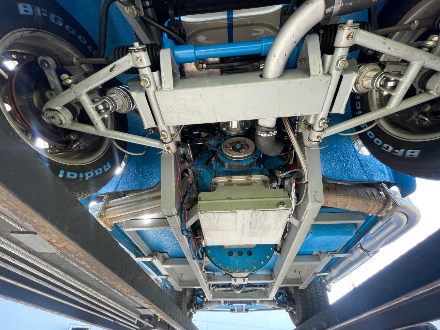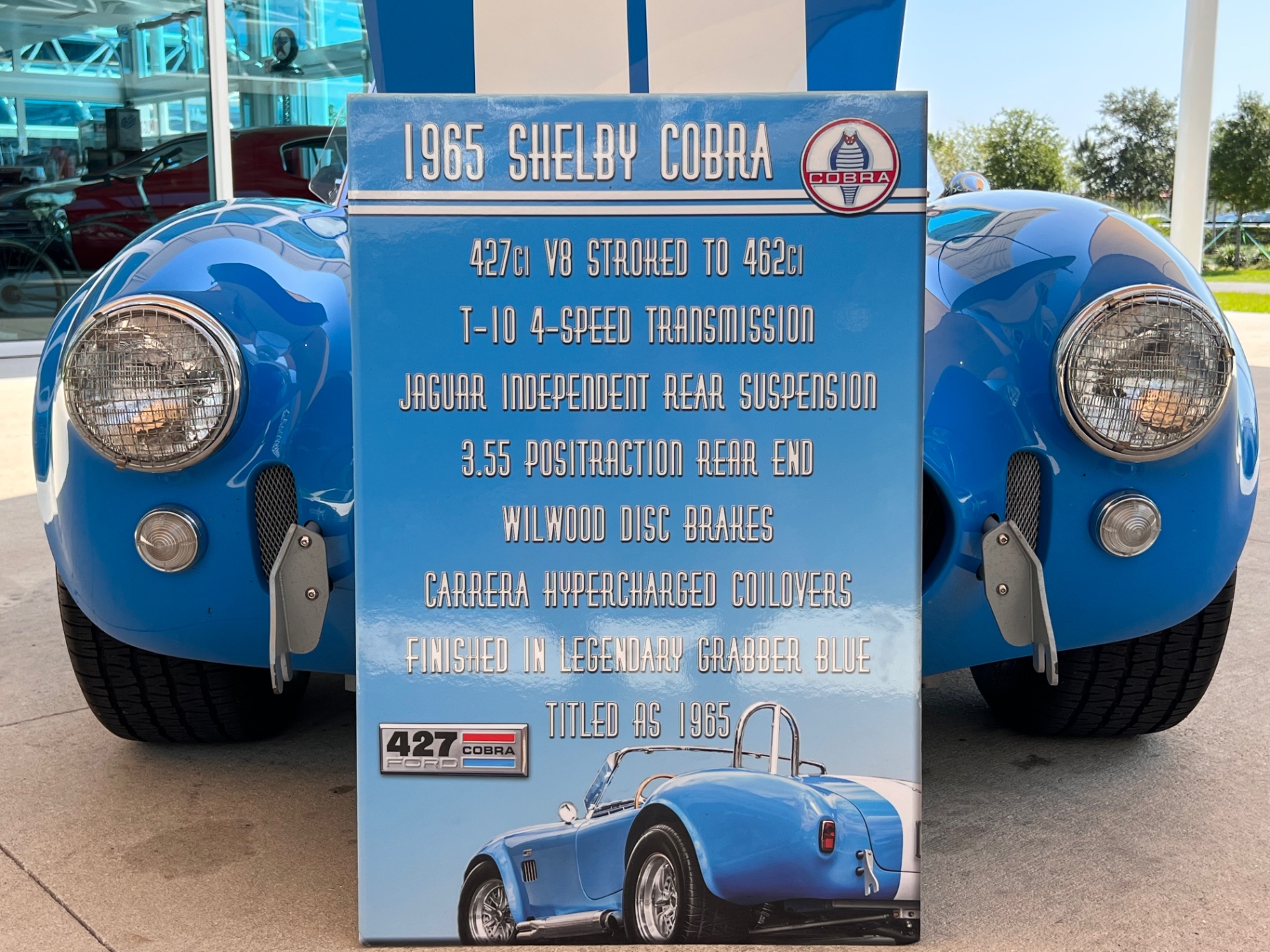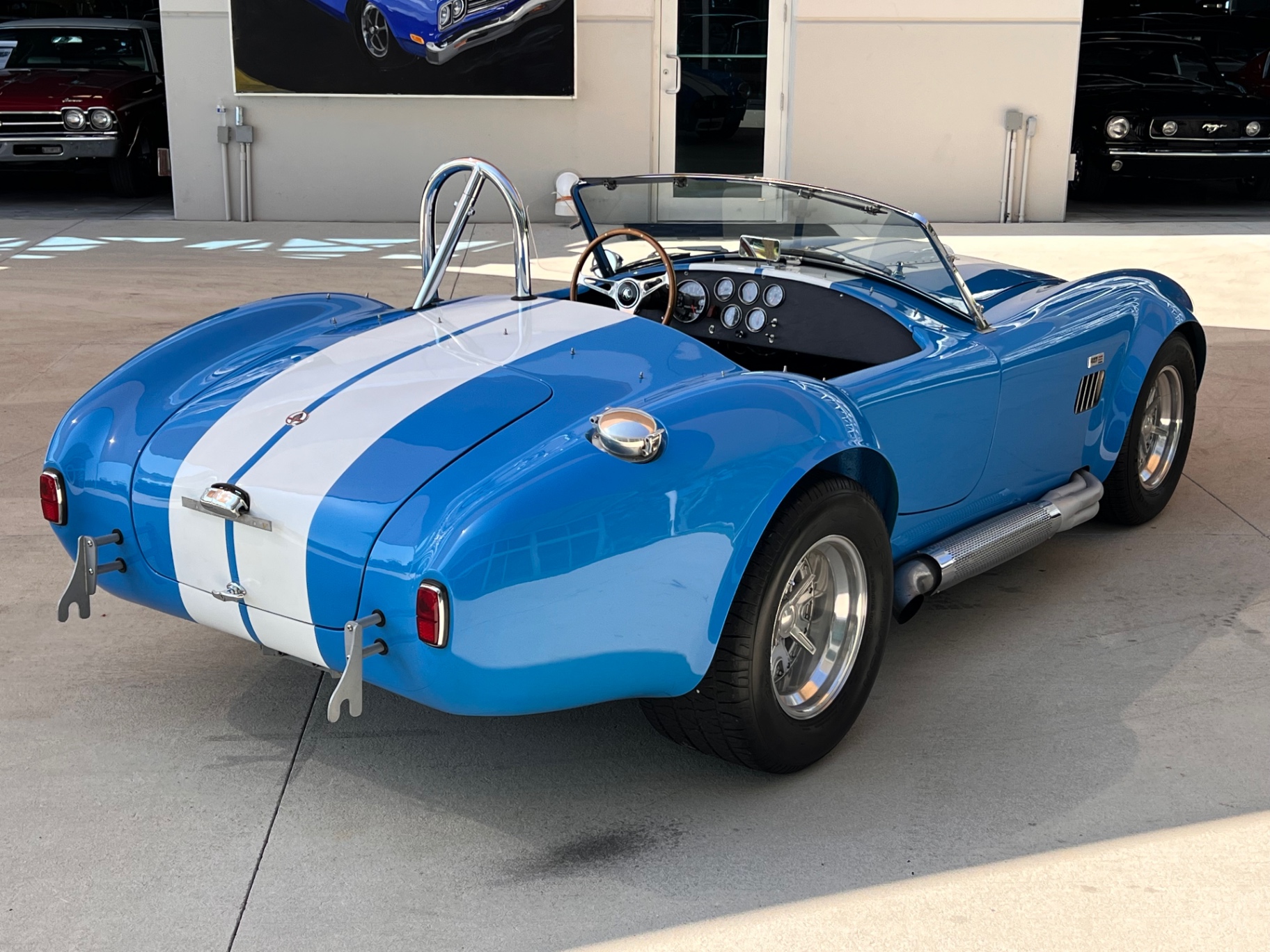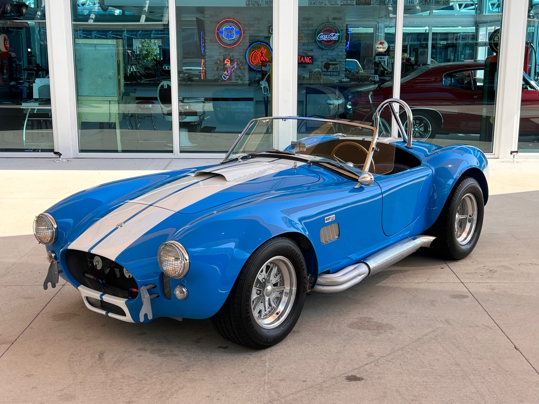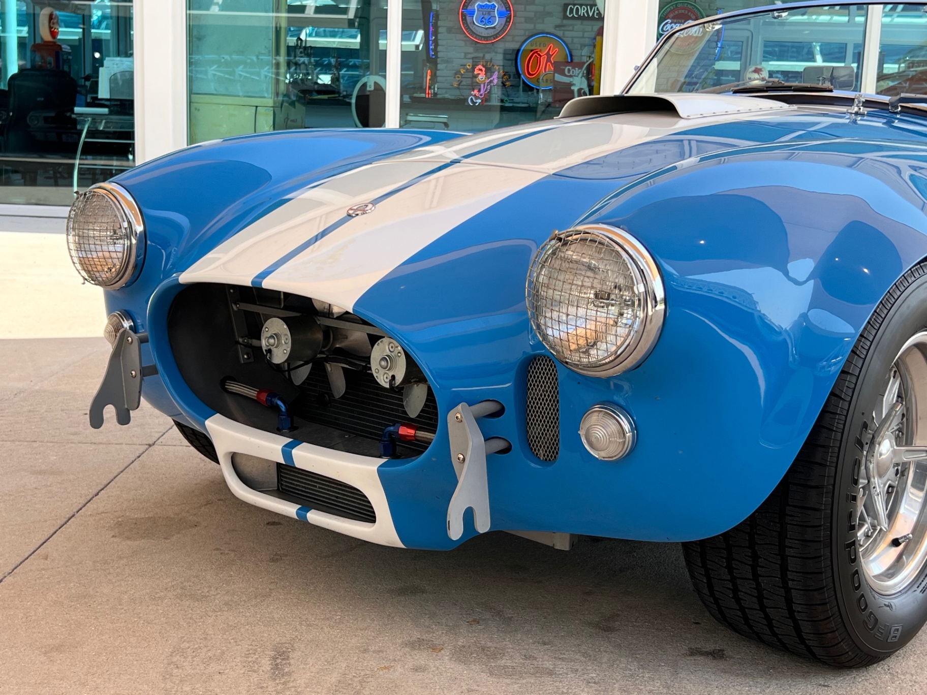Titled as a 1965 Ford Shelby Cobra 427 cubic inch stroked to a 462 cubic inch performance engine Aluminum intake Performance carb Ford Cobra aluminum valve covers Aftermarket spark plug wires Open element air cleaner Exhaust headers leading out to side-pipes External Oil Filters Ford T-10 4 speed transmission 3.55 posi rear end. Wilwood Disc Brakes Jaguar Independent Rear suspension Custom Frame Tubular A-Arms External Oil Filters Carrera adjustable coil overs Black Leather bucket seats Center tunnel Black door panels Full compliment of Stewart Warner gauges Wood/polished sport steering wheel Simpson Racing seat belts Single loop chrome roll bar Floor shifter Black carpet Unique Cobra floor mats. Ford Grabber Blue paint with painted white stripes covering the iconic Cobra body Flared fenders Shelby hood scoop, side vents, chrome trim Chrome front and rear racing bumper/hooks 427 Shelby Cobra badging LED Tail Lights Correct Cobra Windshield with correct Wing Glass’ Snap On Cockpit Cover Moroso kill switch Compumotive Wheels Black sidewall fat tires all around