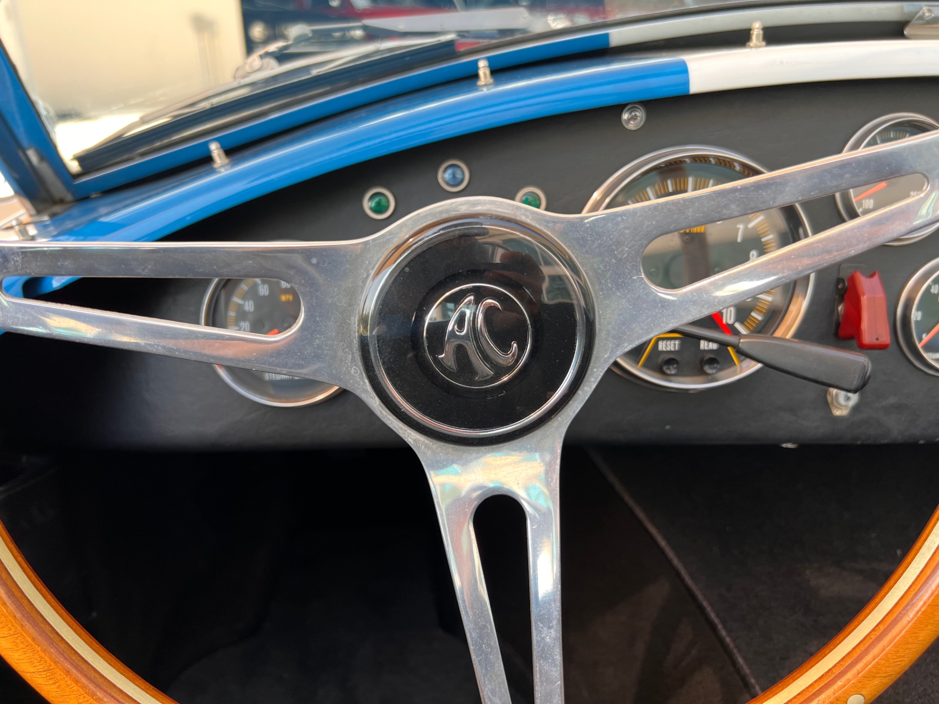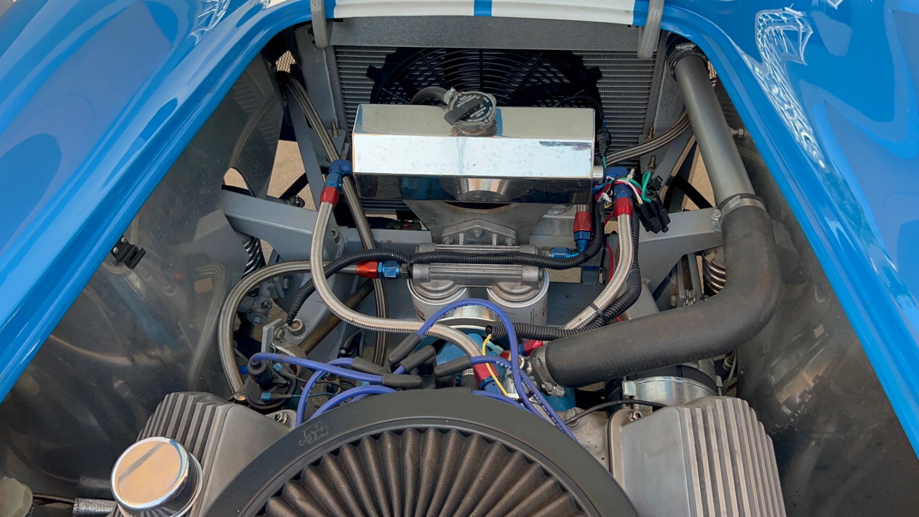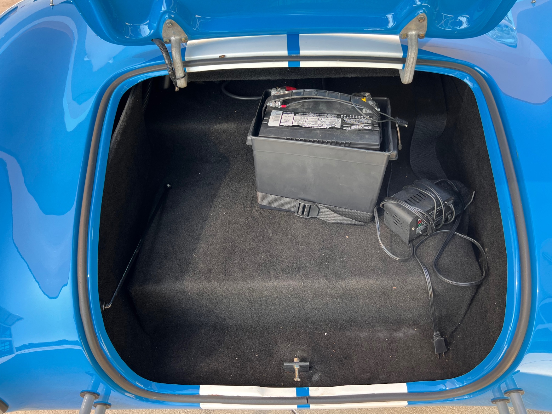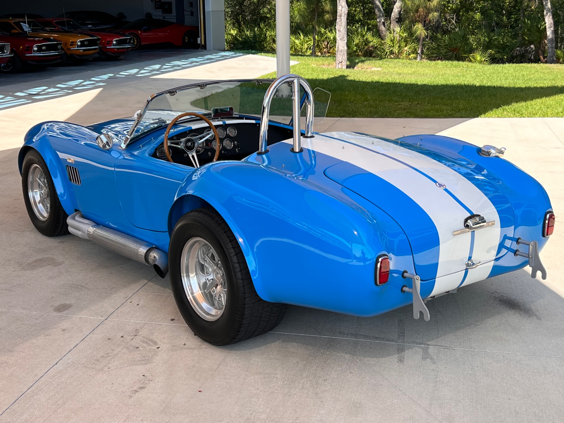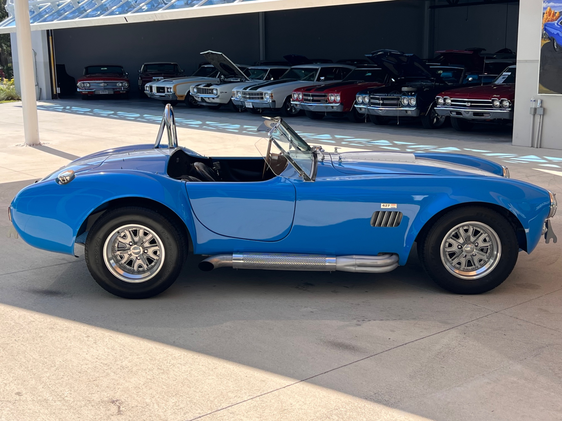Titled as a 1965 Ford Shelby Cobra 427 cubic inch stroked to a 462 cubic inch performance engine Aluminum intake Performance carb Ford Cobra aluminum valve covers Aftermarket spark plug wires Open element air cleaner Exhaust headers leading out to side-pipes External Oil Filters Ford T-10 4 speed transmission 3.55 posi rear end. Wilwood Disc Brakes Jaguar Independent Rear suspension Custom Frame Tubular A-Arms External Oil Filters Carrera adjustable coil overs Black Leather bucket seats Center tunnel Black door panels Full compliment of Stewart Warner gauges Wood/polished sport steering wheel Simpson Racing seat belts Single loop chrome roll bar Floor shifter Black carpet Unique Cobra floor mats. Ford Grabber Blue paint with painted white stripes covering the iconic Cobra body Flared fenders Shelby hood scoop, side vents, chrome trim Chrome front and rear racing bumper/hooks 427 Shelby Cobra badging LED Tail Lights Correct Cobra Windshield with correct Wing Glass’ Snap On Cockpit Cover Moroso kill switch Compumotive Wheels Black sidewall fat tires all around