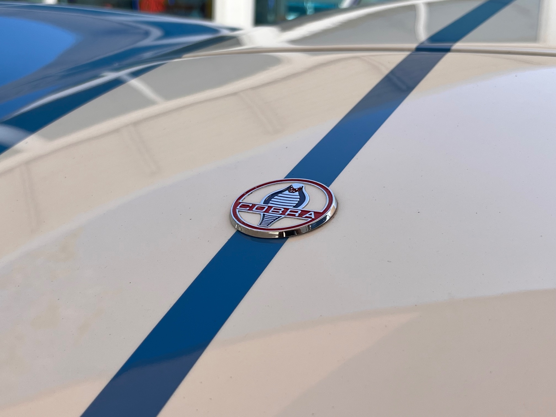 The beautiful Cobra has the new blue paint with painted white stripes covering the iconic Cobra body with flared fenders that give it that aggressive stance.
