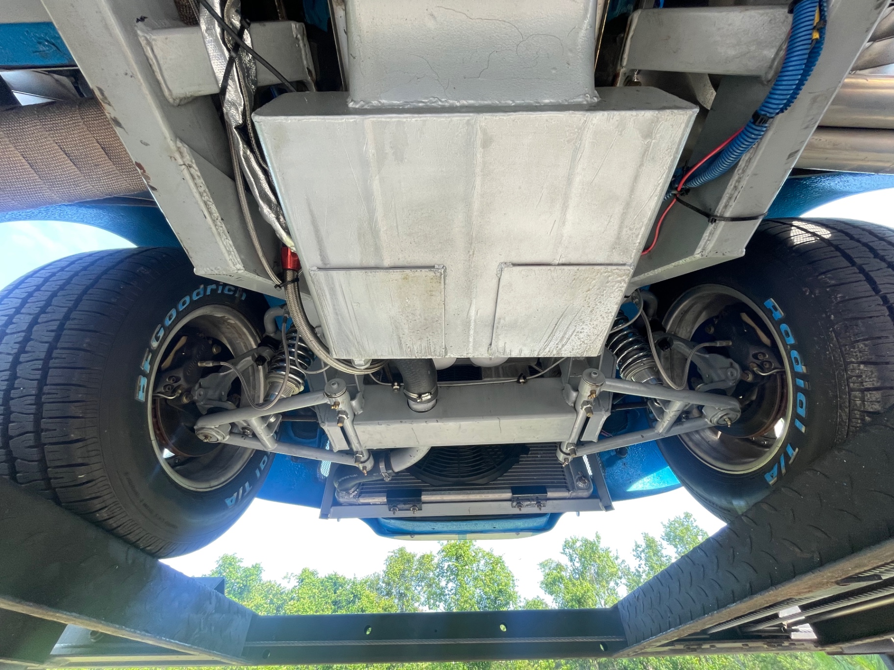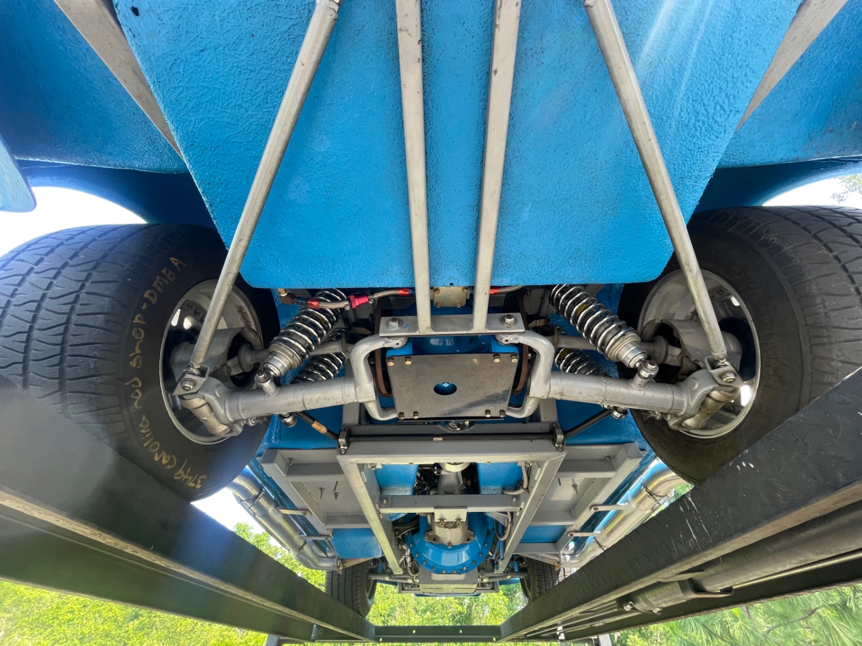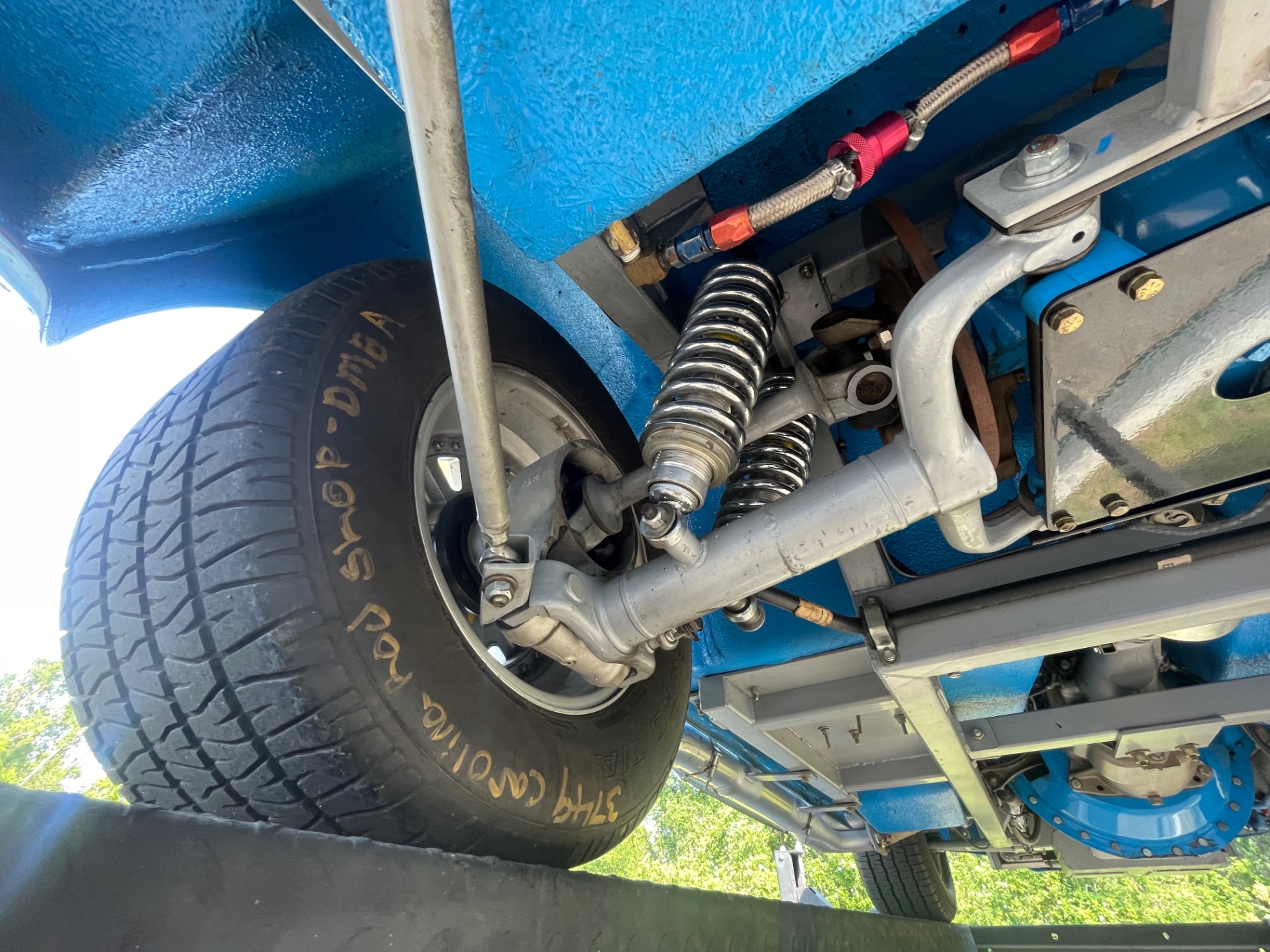The engine is supported by a Jaguar Independent Rear suspension in the custom frame with the front end having Tubular A-Arms, Carrera adjustable coil overs, while it rides on Compumotive Wheels and black sidewall fat tires all around.