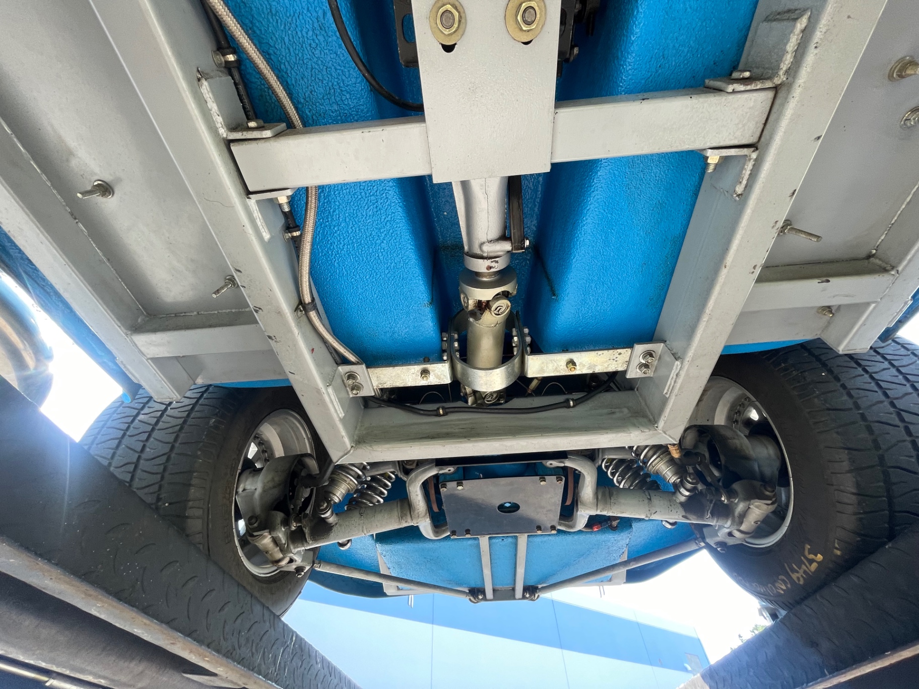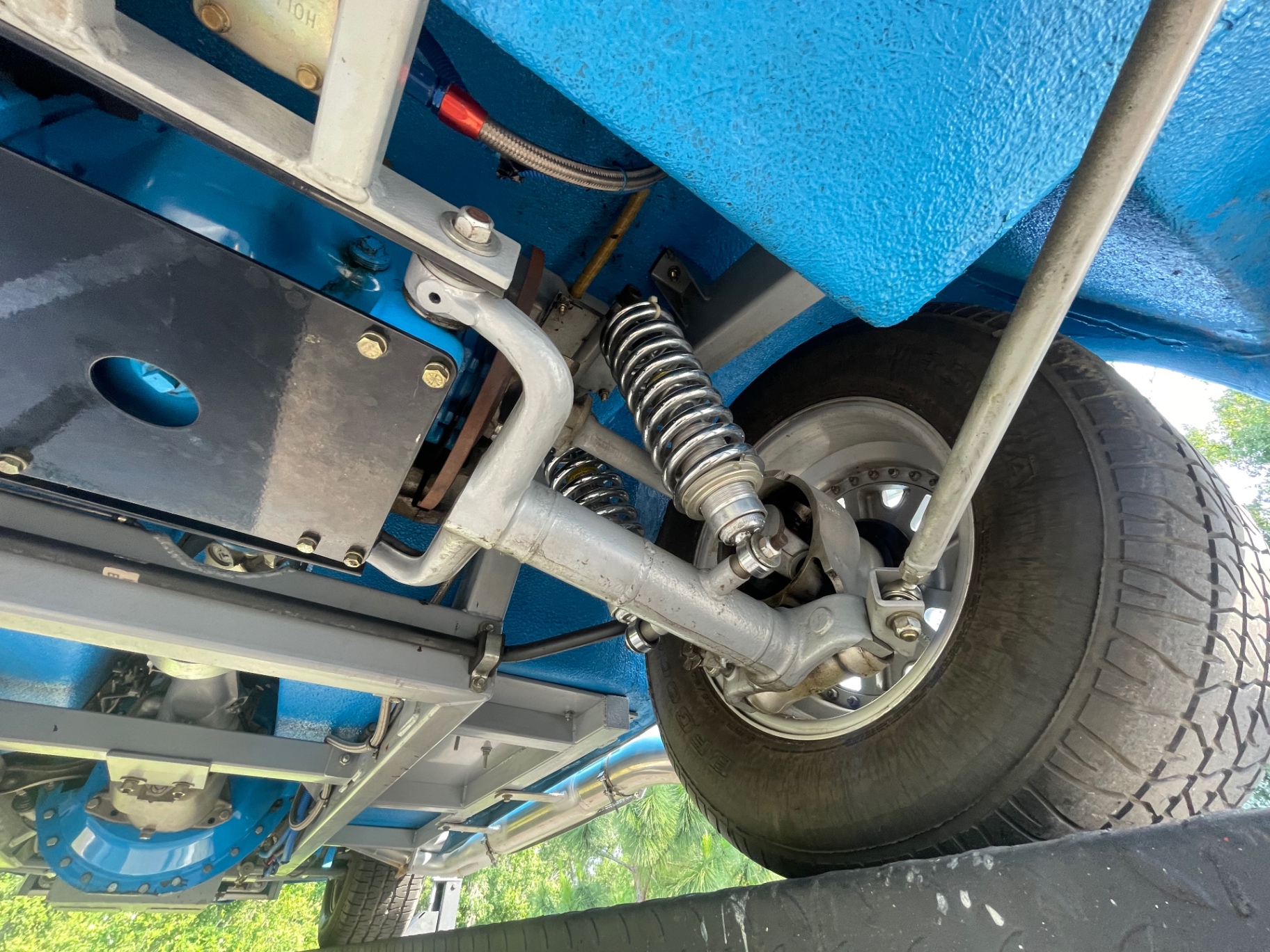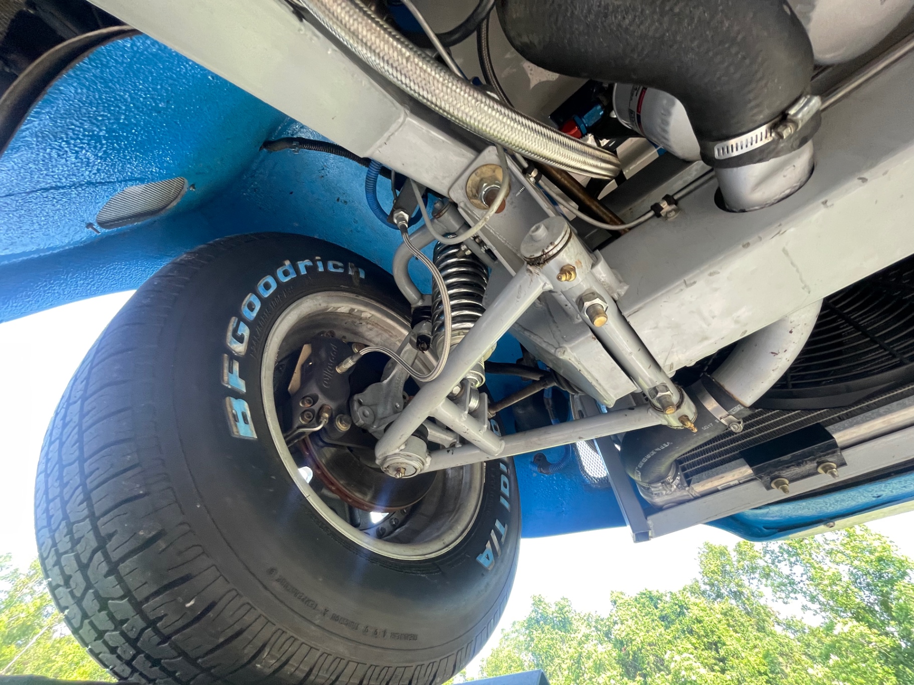 The engine is supported by a Jaguar Independent Rear suspension in the custom frame with the front end having Tubular A-Arms, Carrera adjustable coil overs, while it rides on Compumotive Wheels and black sidewall fat tires all around.