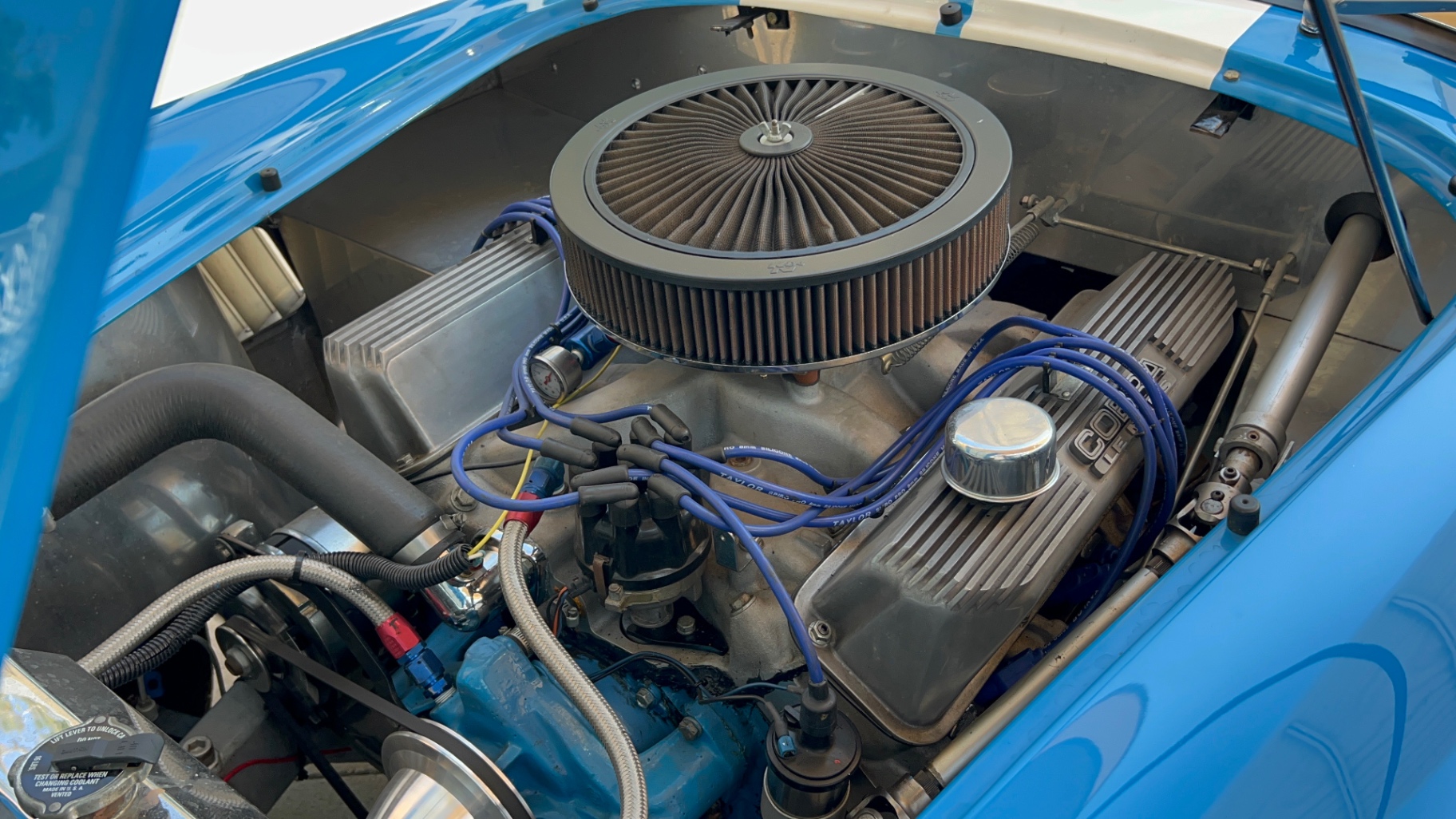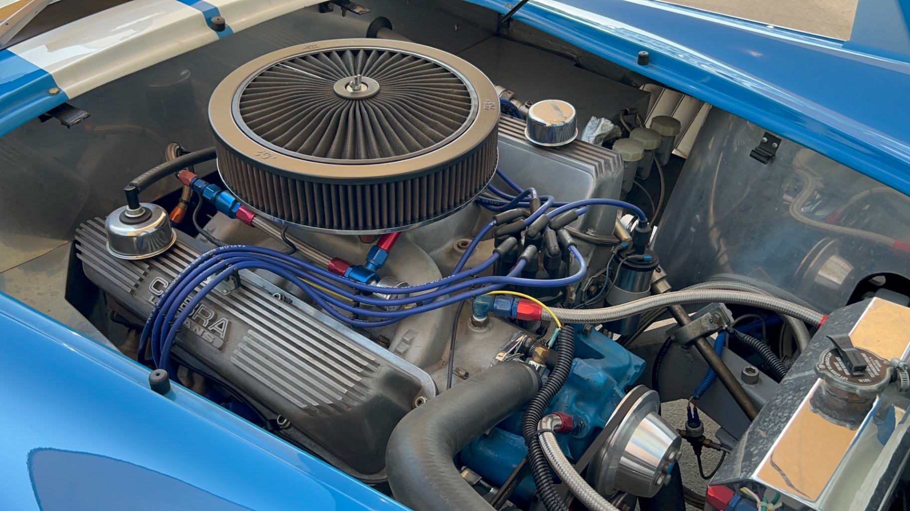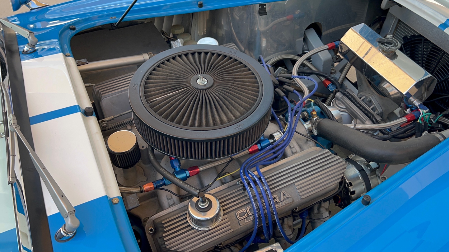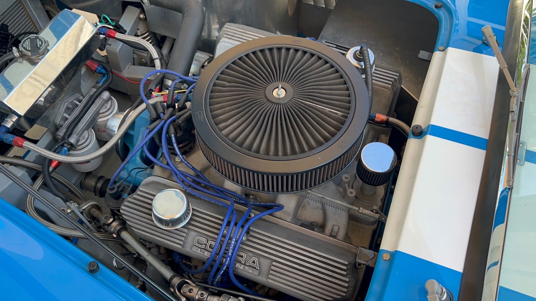 This Cobra is powered by a high-performance Ford 427 cubic inch performance engine that has been stroked to 462 cubes. It has many go-fast goodies including an aluminum intake, Holley Performance carb, Ford Cobra aluminum valve covers, aftermarket spark plug wires, open element air cleaner, exhaust leading out to side-pipes, External Oil Filters, a Ford T-10 4 speed transmission, and a 3.55 posi rear end.