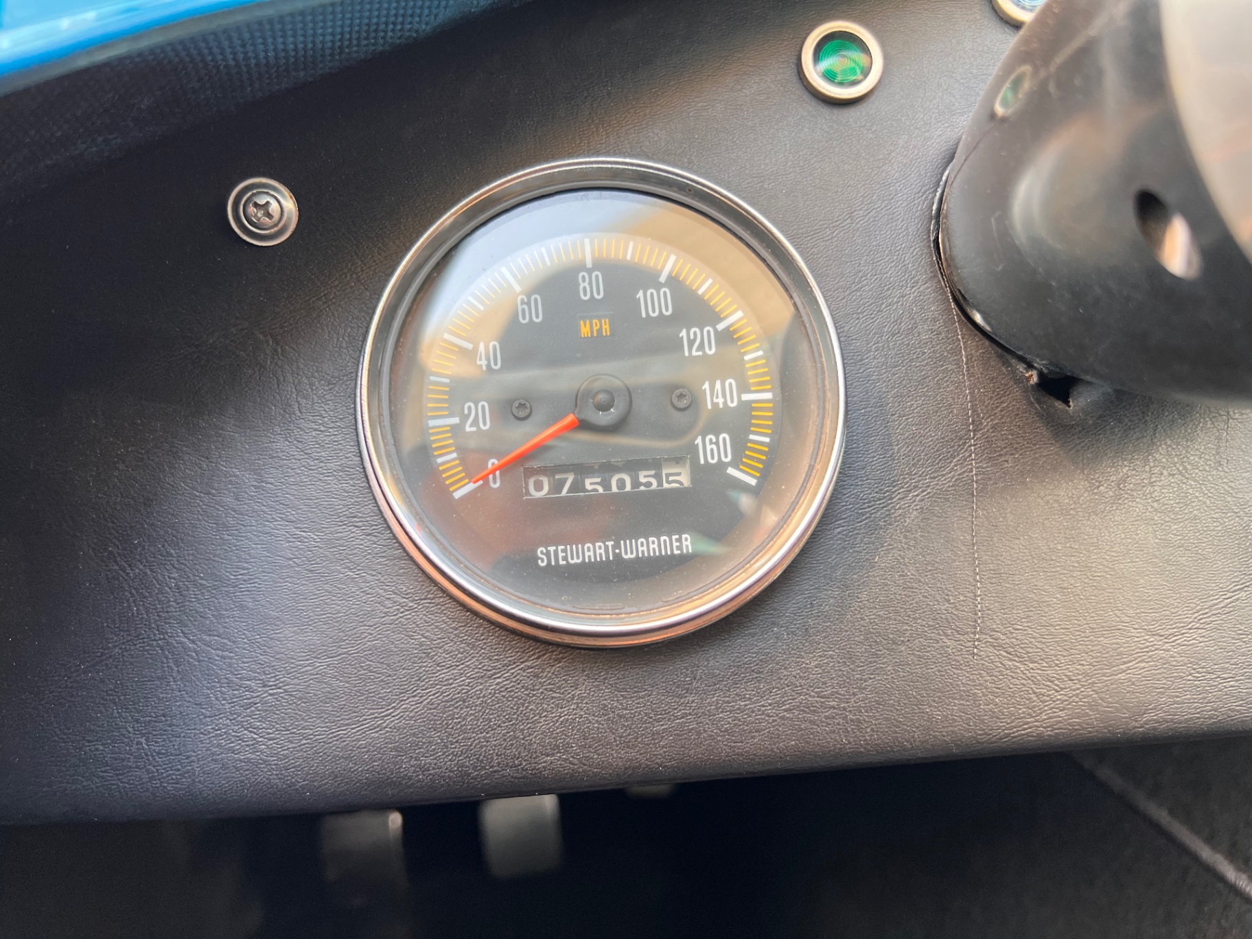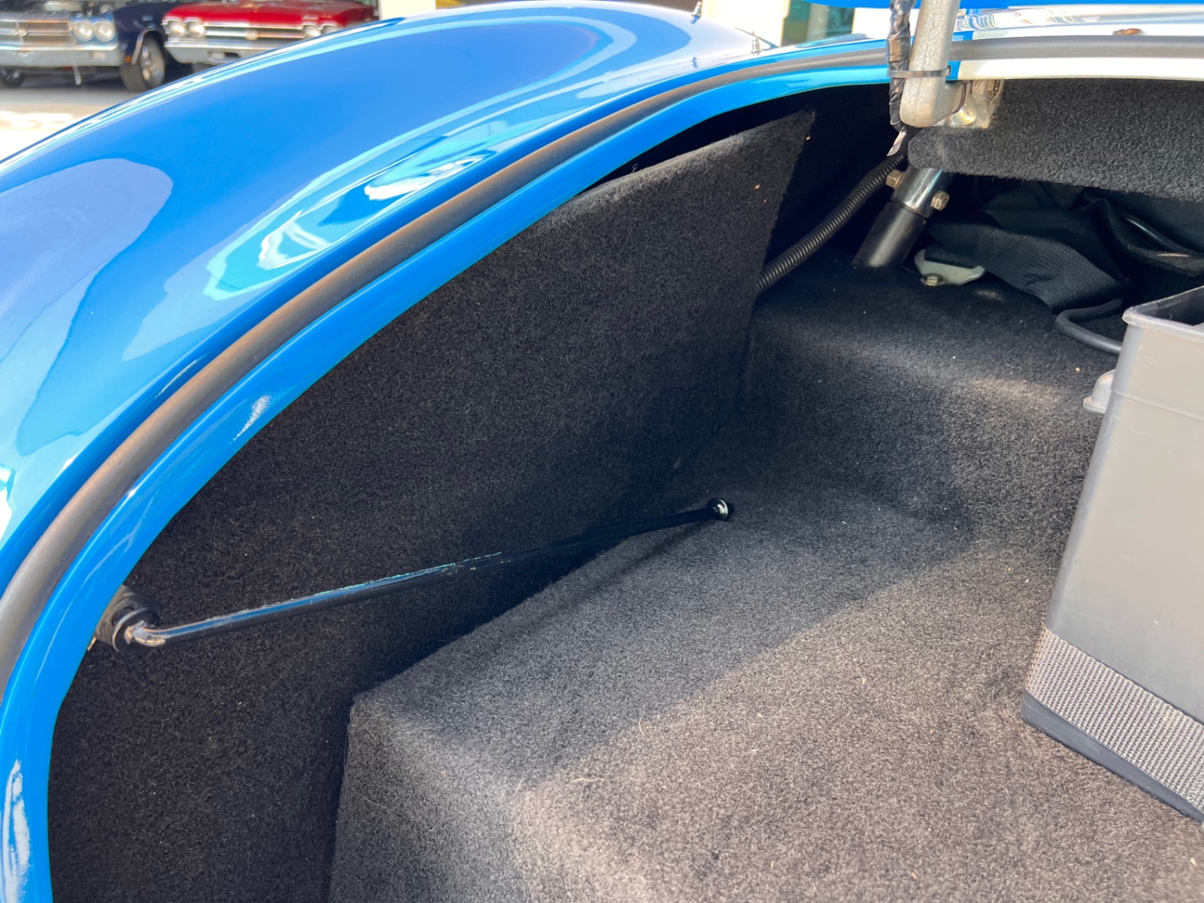 You have plenty of legroom to stretch out your legs and will also admire the full wrap around interior that has a center tunnel, black door panels, a full compliment of Stewart Warner gauges, wood/polished sport steering wheel, racing seat belts, single loop chrome roll bar, floor shifter, black carpet, and Unique Cobra floor mats.