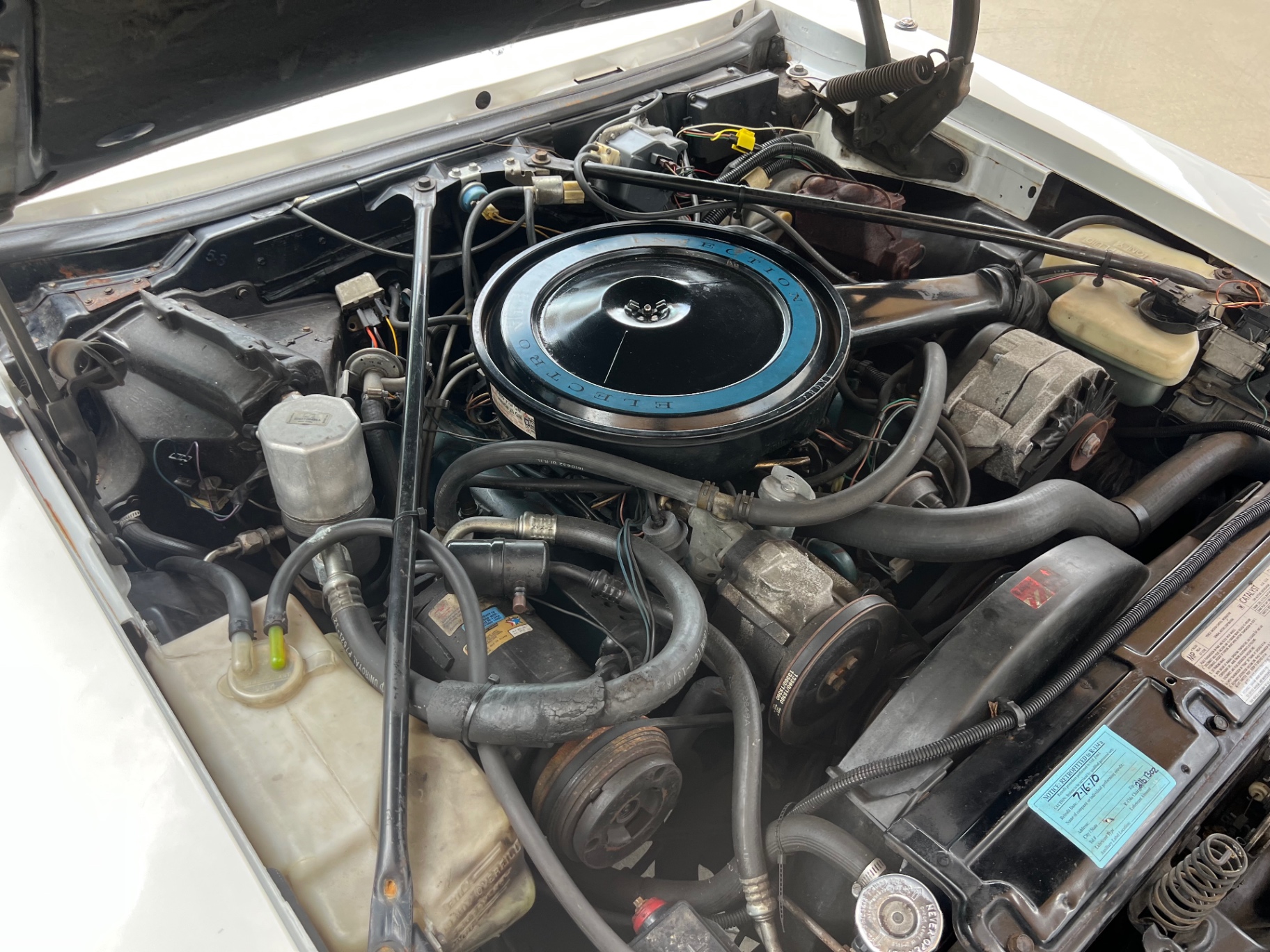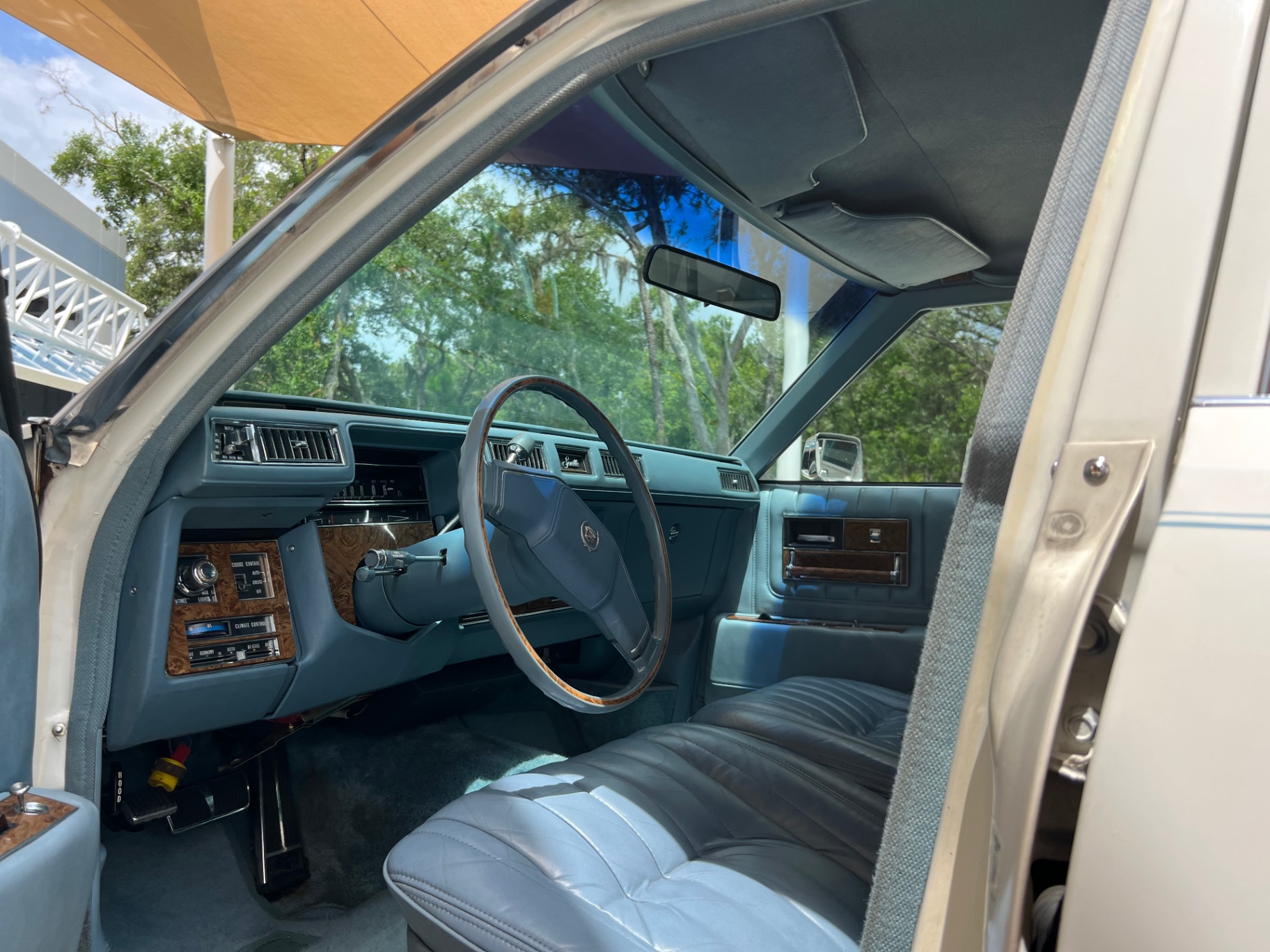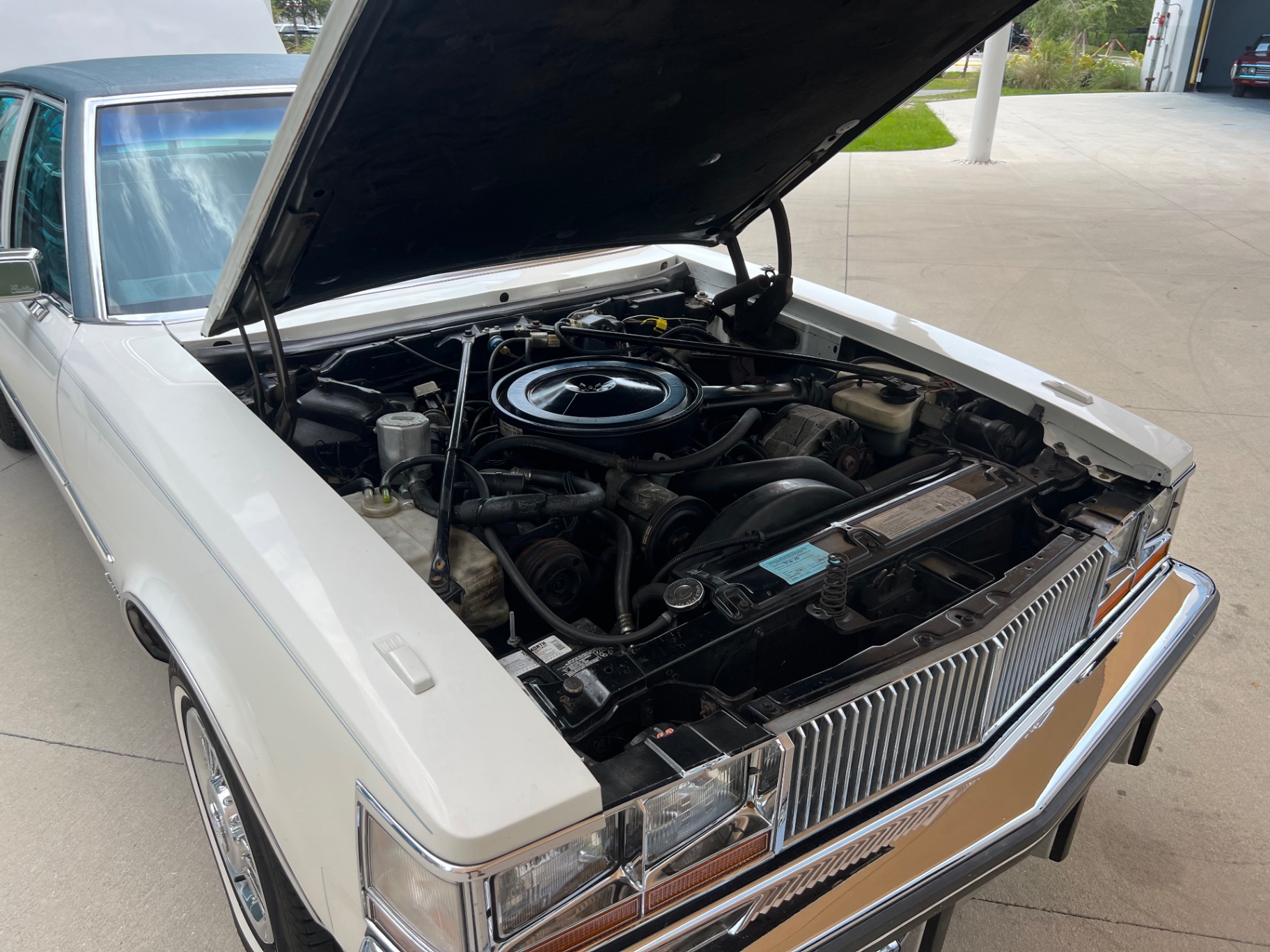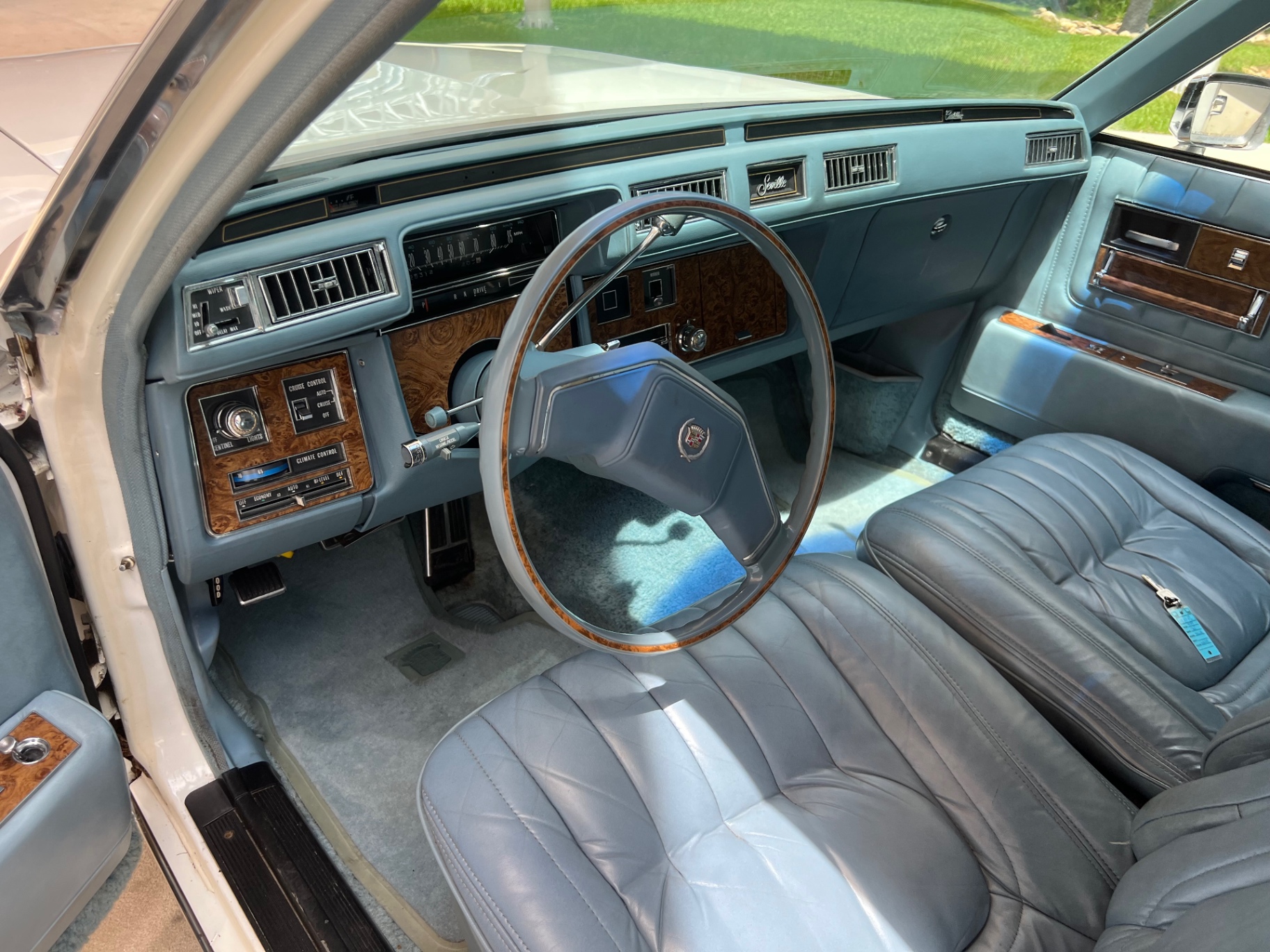 350 cubic inch engine Factory black air cleaner Air conditioning Power steering and brakes Factory exhaust manifolds Very clean and detailed engine compartment. Automatic Transmission Plush twin front bucket seats Matching back sofa seat Air Conditioning Cruise Control Power Windows Power Locks AM/FM Telescopic Wheel Wood grain dash holding all the gauges and controls Matching door panels Factory steering wheel Caddy is painted in sleek White Great chrome trim Front and rear chrome bumpers Blue Vinyl top Factory Cadillac wheels with wire wheel hubcaps White sidewall tires