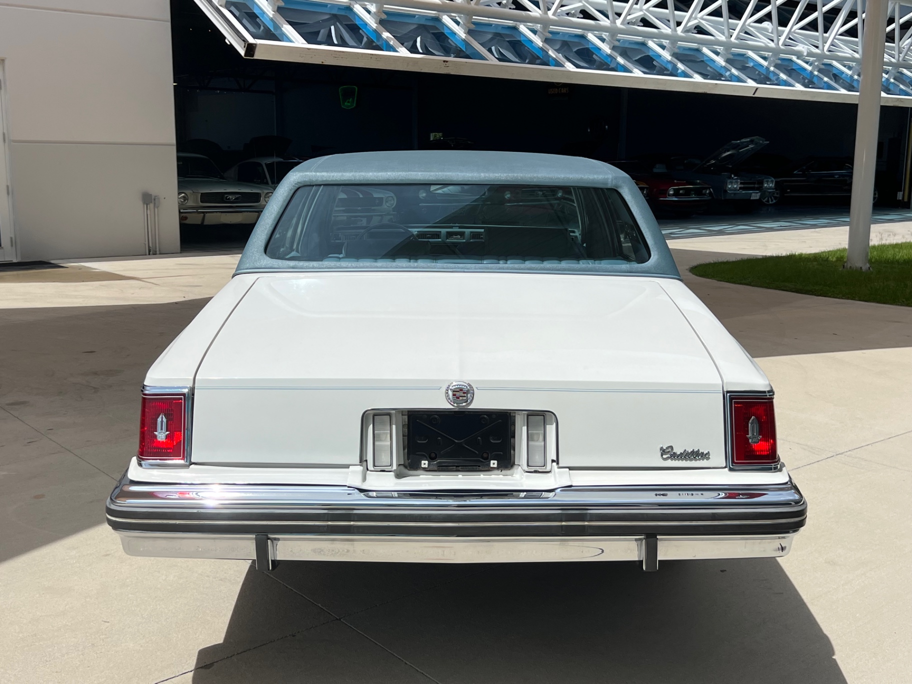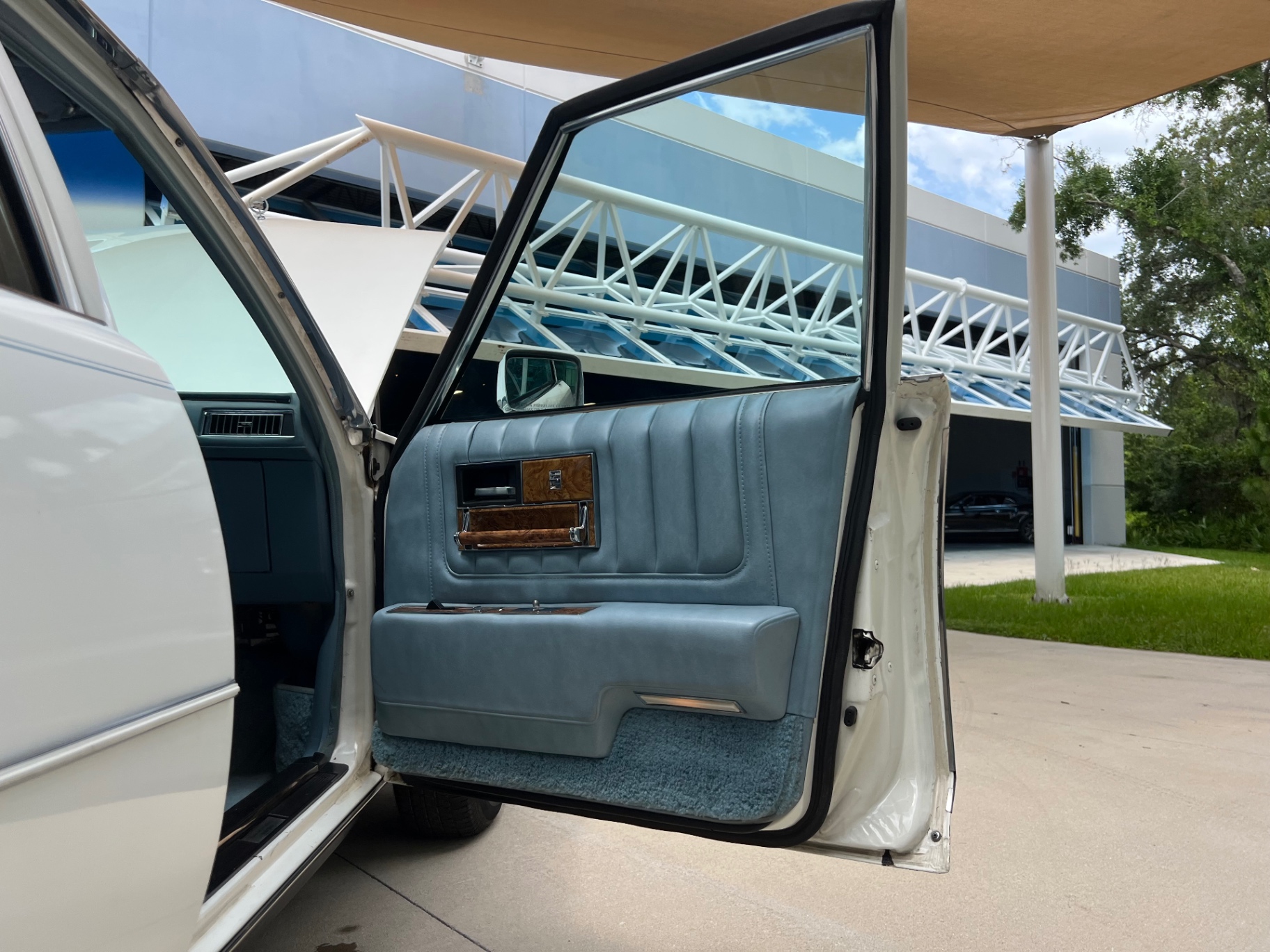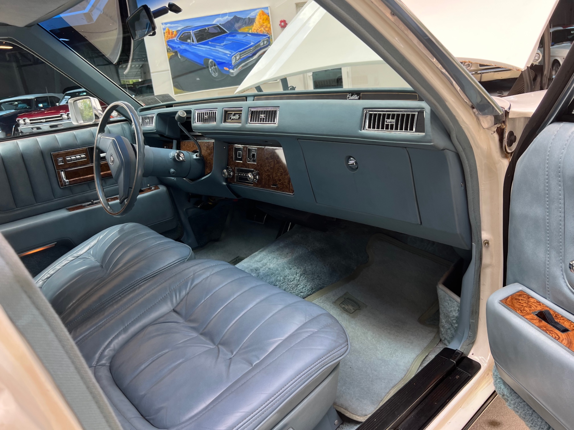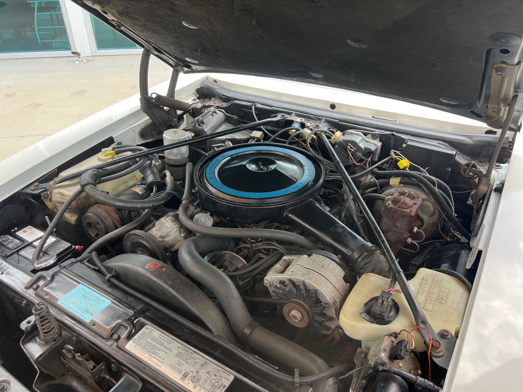 350 cubic inch engine Factory black air cleaner Air conditioning Power steering and brakes Factory exhaust manifolds Very clean and detailed engine compartment. Automatic Transmission Plush twin front bucket seats Matching back sofa seat Air Conditioning Cruise Control Power Windows Power Locks AM/FM Telescopic Wheel Wood grain dash holding all the gauges and controls Matching door panels Factory steering wheel Caddy is painted in sleek White Great chrome trim Front and rear chrome bumpers Blue Vinyl top Factory Cadillac wheels with wire wheel hubcaps White sidewall tires
