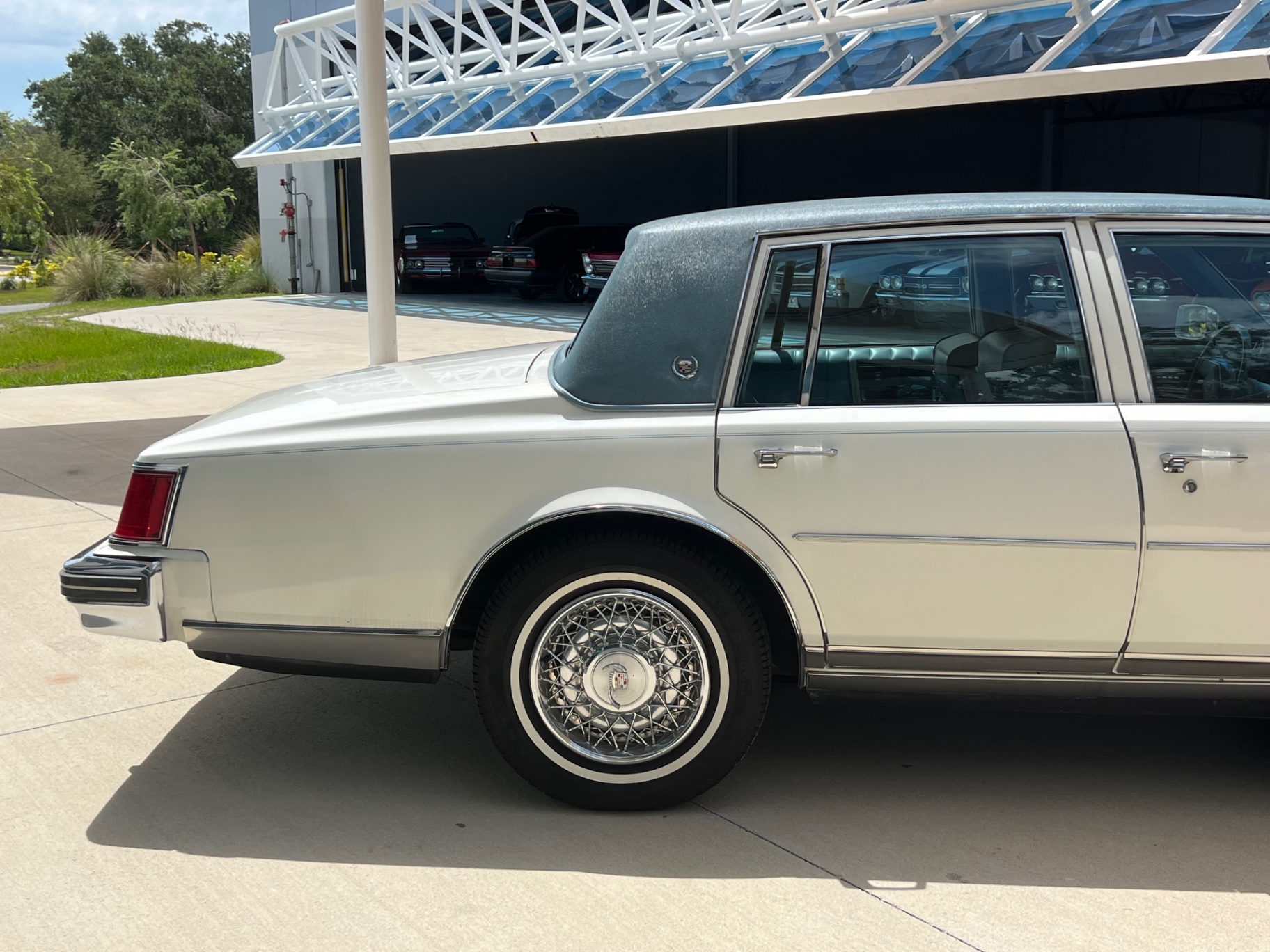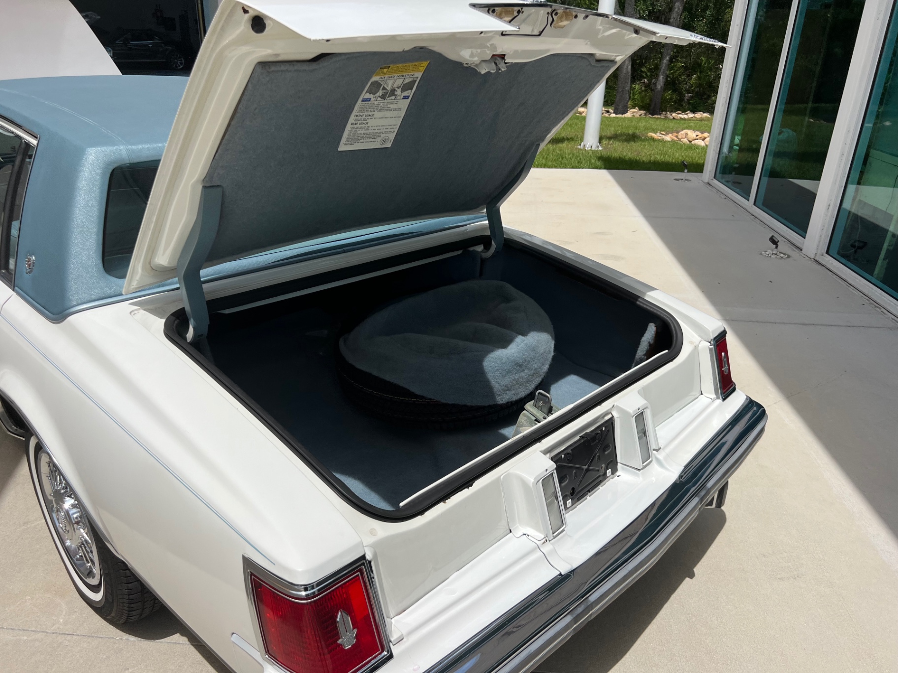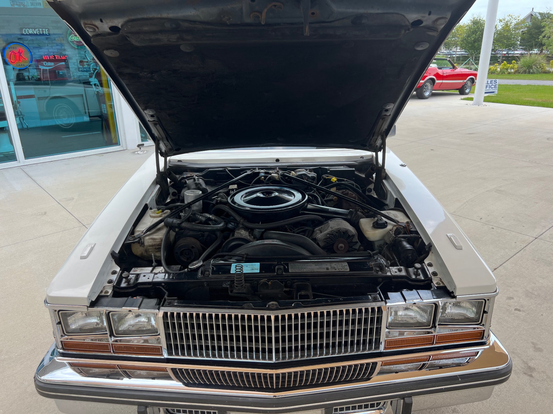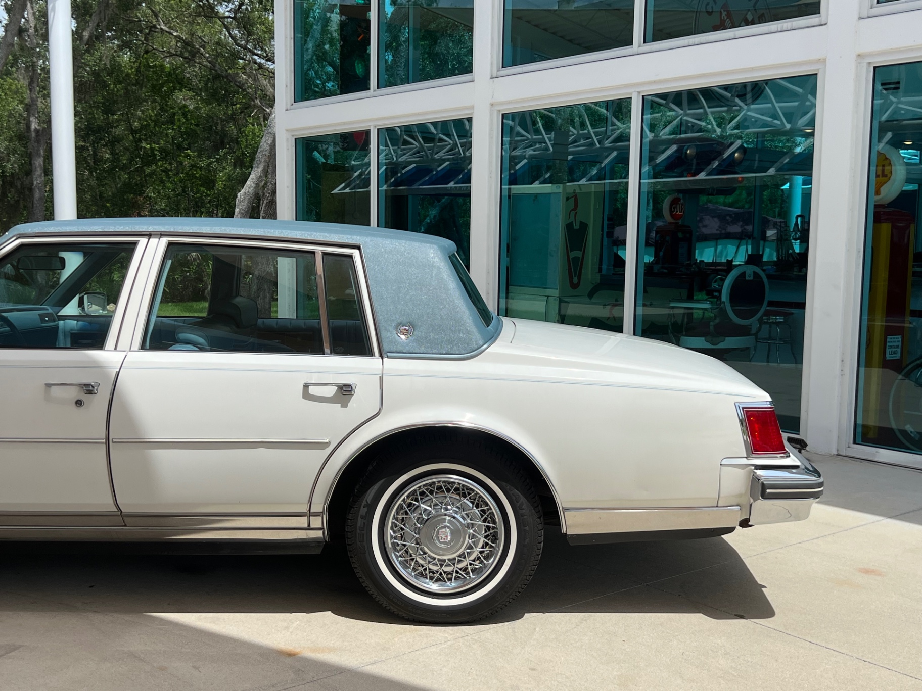 350 cubic inch engine Factory black air cleaner Air conditioning Power steering and brakes Factory exhaust manifolds Very clean and detailed engine compartment. Automatic Transmission Plush twin front bucket seats Matching back sofa seat Air Conditioning Cruise Control Power Windows Power Locks AM/FM Telescopic Wheel Wood grain dash holding all the gauges and controls Matching door panels Factory steering wheel Caddy is painted in sleek White Great chrome trim Front and rear chrome bumpers Blue Vinyl top Factory Cadillac wheels with wire wheel hubcaps White sidewall tires