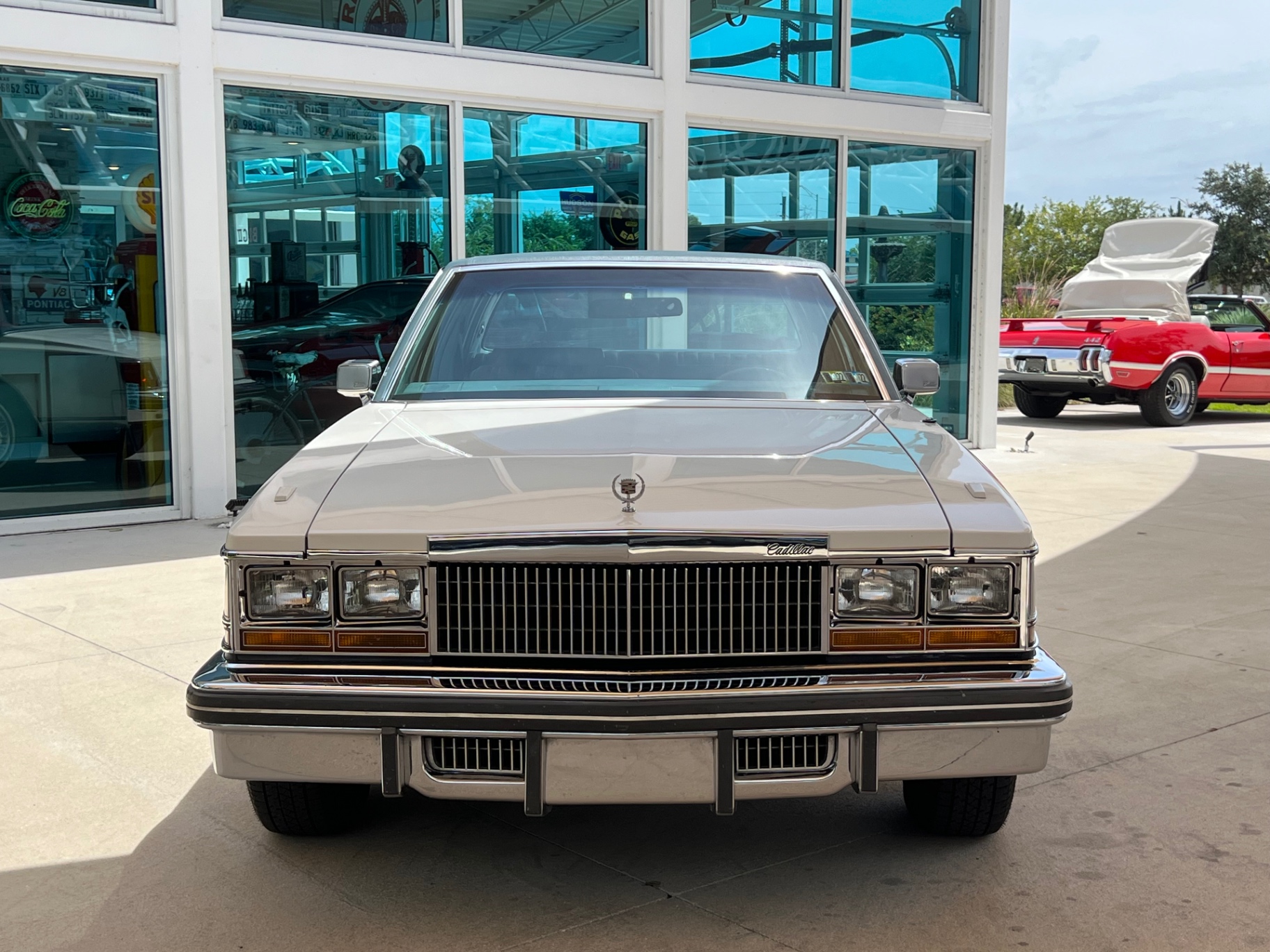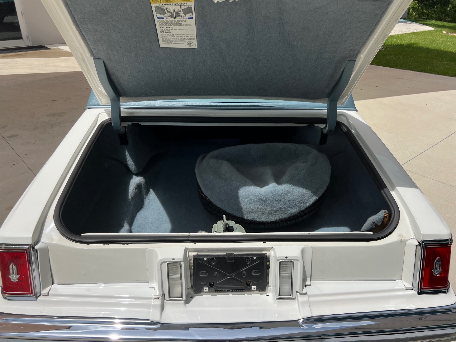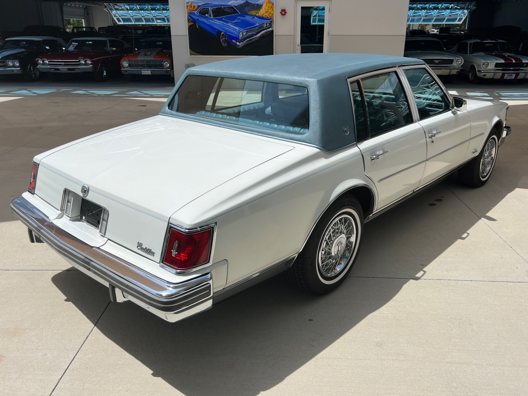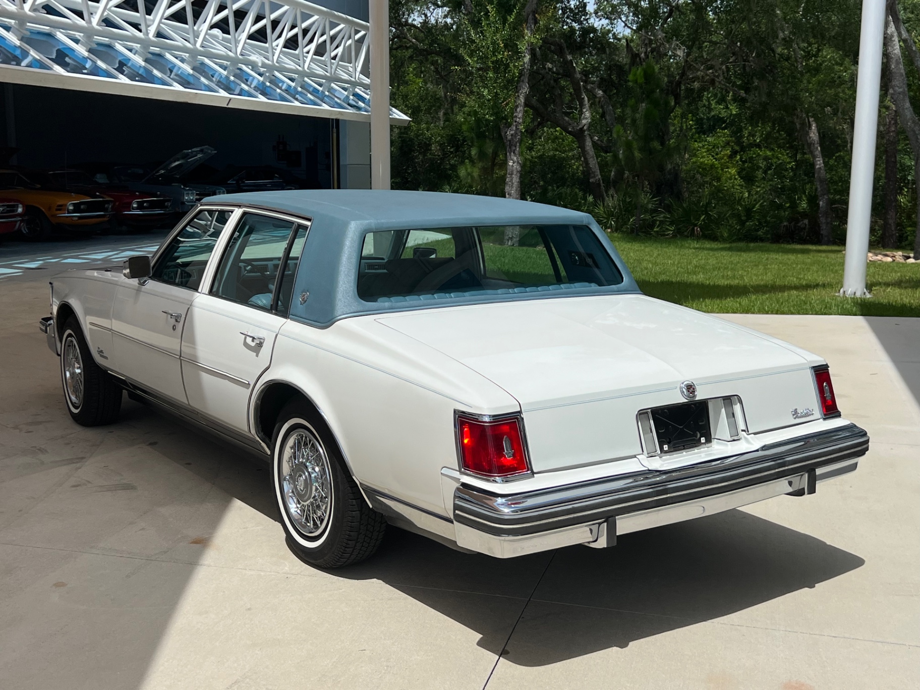 350 cubic inch engine Factory black air cleaner Air conditioning Power steering and brakes Factory exhaust manifolds Very clean and detailed engine compartment. Automatic Transmission Plush twin front bucket seats Matching back sofa seat Air Conditioning Cruise Control Power Windows Power Locks AM/FM Telescopic Wheel Wood grain dash holding all the gauges and controls Matching door panels Factory steering wheel Caddy is painted in sleek White Great chrome trim Front and rear chrome bumpers Blue Vinyl top Factory Cadillac wheels with wire wheel hubcaps White sidewall tires