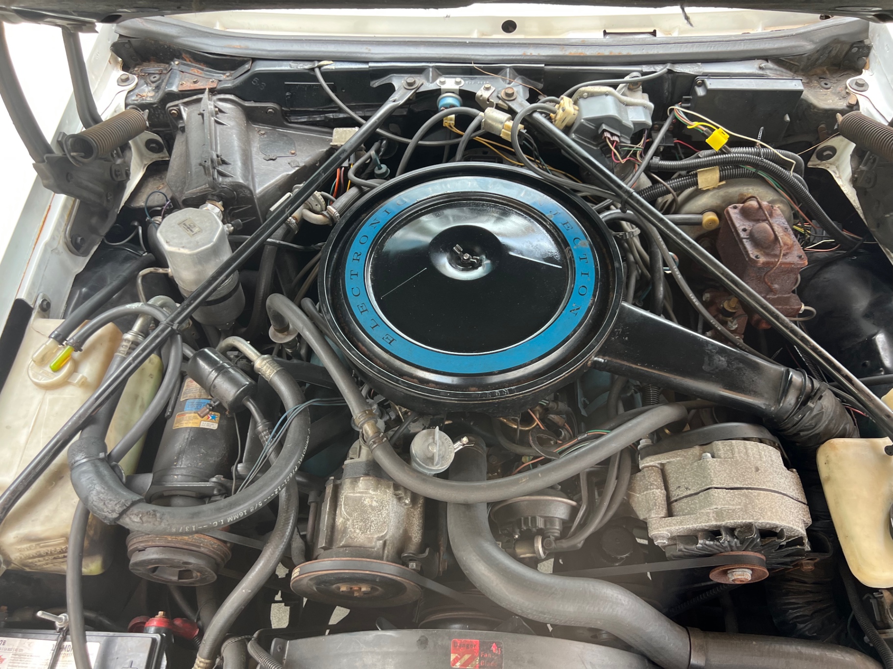 The Seville was one of the last cars that had the 350 cubic-inch V8 engine that appears to be original and as stock as the day it was driven off the showroom floor. It only shows a little over 25k miles on the speedo and has the original color paint on the block, heads, and intake, factory black air cleaner system with the blue Electronic Fuel Injection decal still on the lid, fuel injection, air conditioning, power steering, four-wheel disc brakes, and is backed by a three-speed automatic transmission.