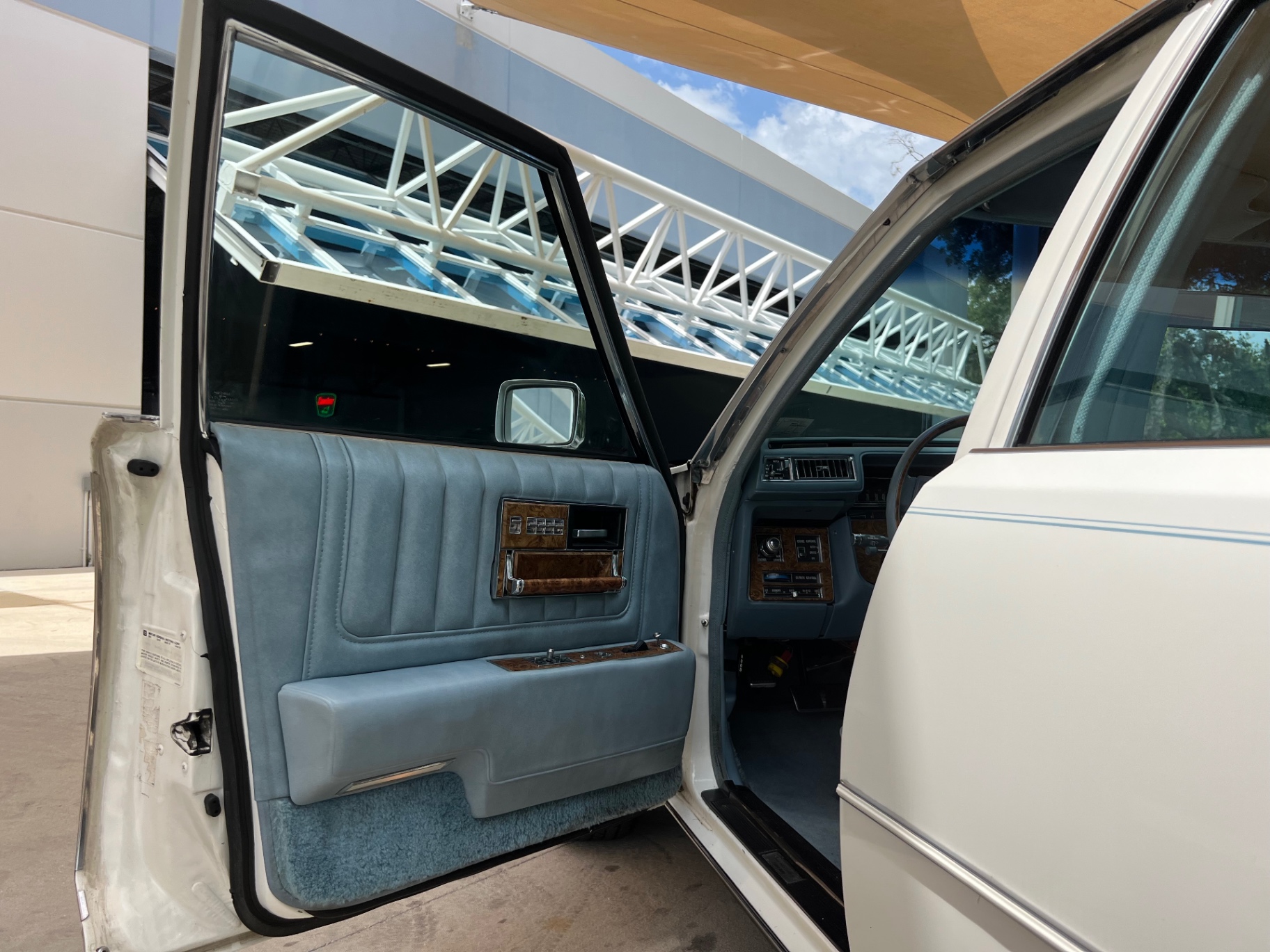 Our Caddy is painted in a pretty white paint that looks amazing with its sleek and styled four-door body, great chrome trim, front and rear chrome bumpers with the blue vinyl top that also compliments the car perfectly.