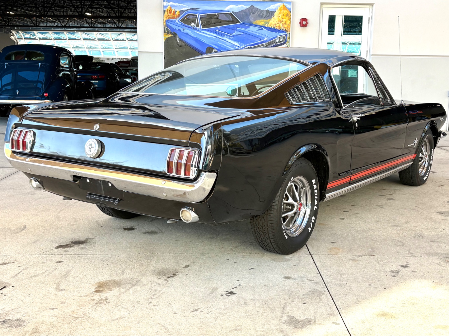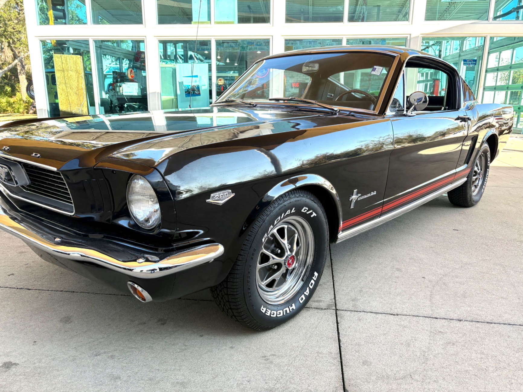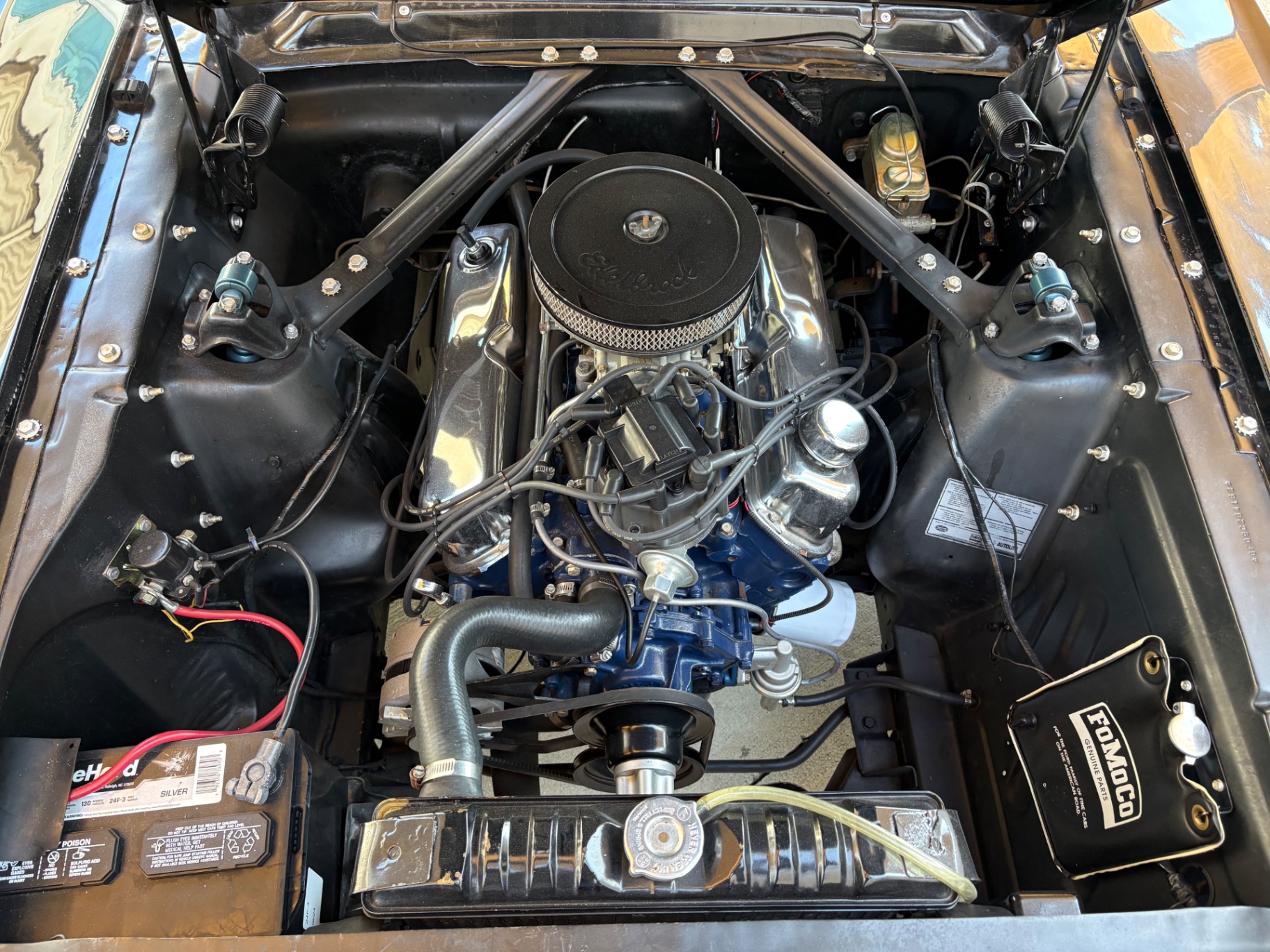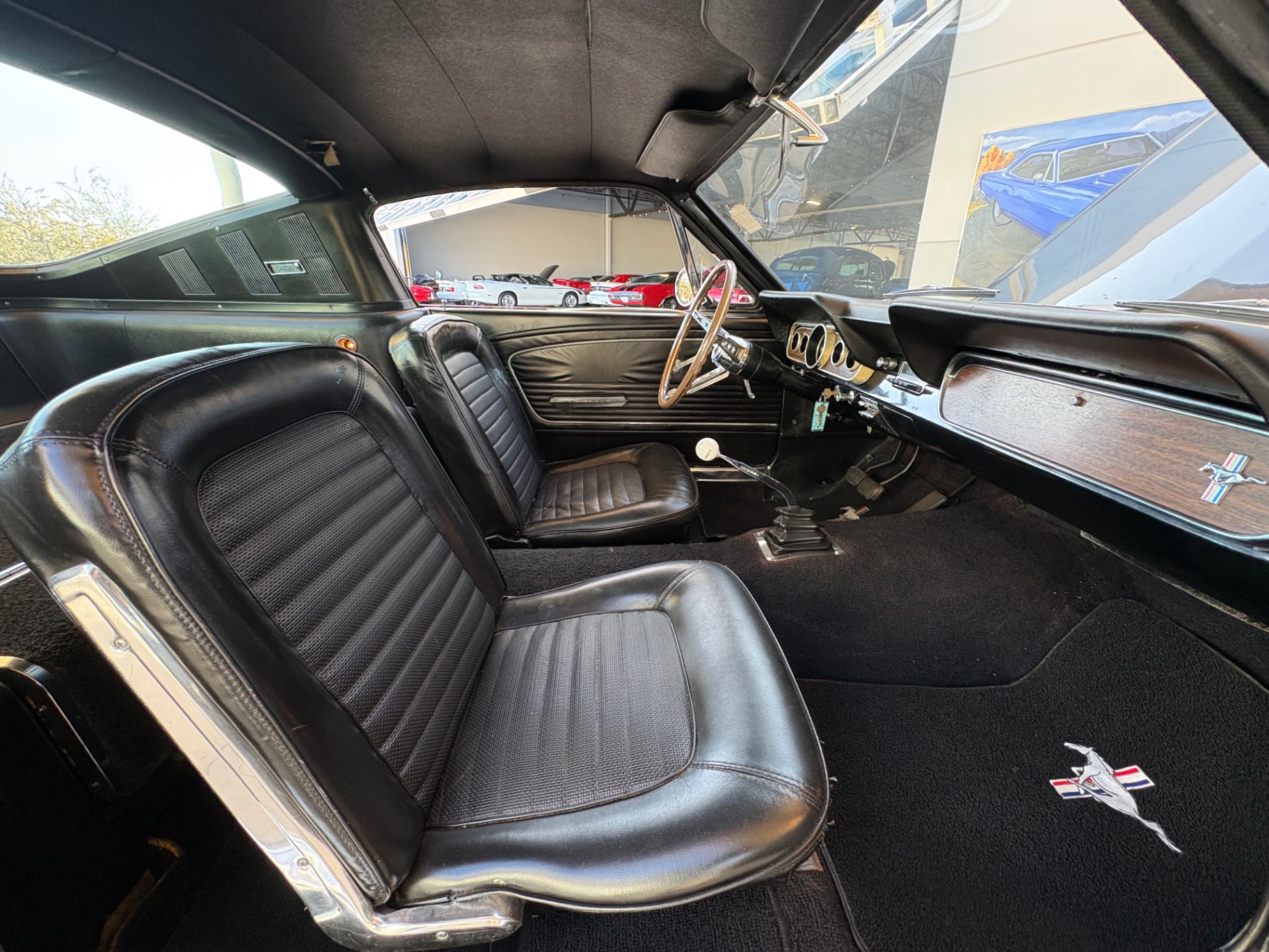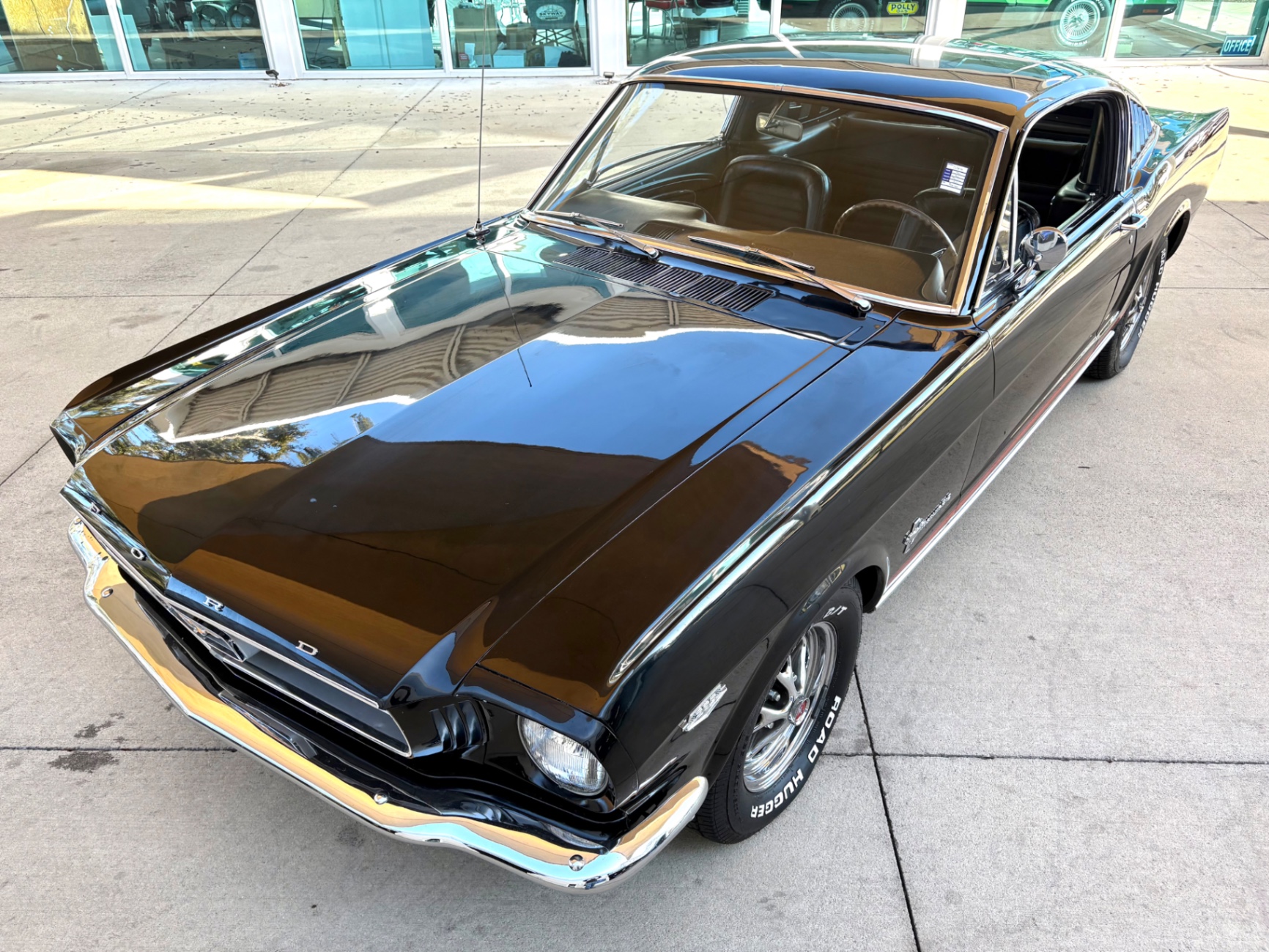 Factory C-Code 289 cubic inch engine 4-speed manual Transmission Electronic Ignition Conversion Holley 4-barrel Chrome valve covers Factory correct blue painted engine Open element air cleaner assembly Detailed engine compartment Black restored interior Twin buckets up front and the matching rear seat, dash, door panels Deluxe Steering wheel wood Instrument panel that has all the correct factory gauges 140-mph speedometer, fuel gauge, temperature gauge, oil pressure gauge, ammeter Chrome manual shifter with white shifter ball surrounded by chrome trim on the floor Original looking trunk with Factory trunk mat, spare tire cover, spare tire, and floor jack Mustang wears the fresh Raven Black paint Blacked-out grille Chrome front and rear bumpers Mustang emblem Unique fuel filler cap on the panel between the tail lamps Exhaust exiting underneath Factory styled wheels Road Hugger Radial GT raised white letter tires