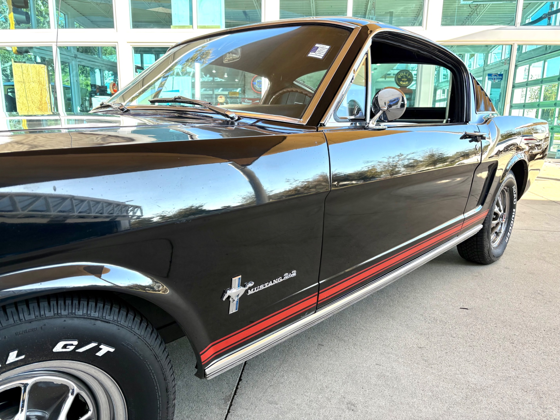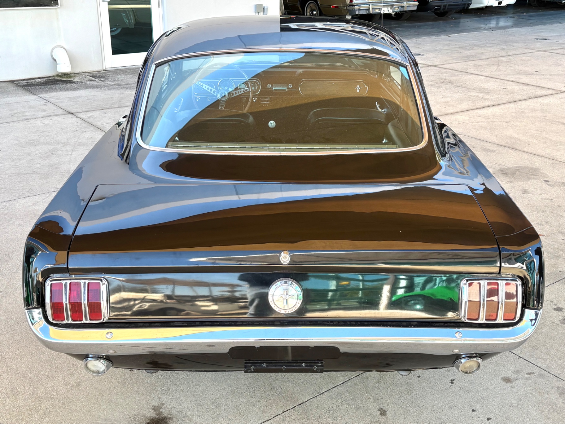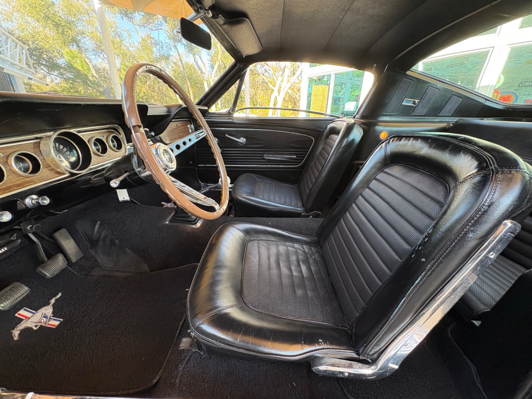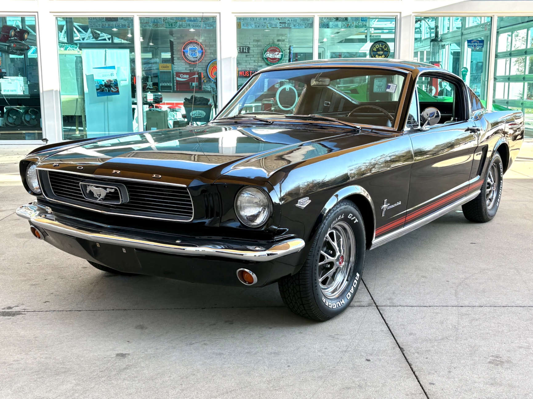 Factory C-Code 289 cubic inch engine 4-speed manual Transmission Electronic Ignition Conversion Holley 4-barrel Chrome valve covers Factory correct blue painted engine Open element air cleaner assembly Detailed engine compartment Black restored interior Twin buckets up front and the matching rear seat, dash, door panels Deluxe Steering wheel wood Instrument panel that has all the correct factory gauges 140-mph speedometer, fuel gauge, temperature gauge, oil pressure gauge, ammeter Chrome manual shifter with white shifter ball surrounded by chrome trim on the floor Original looking trunk with Factory trunk mat, spare tire cover, spare tire, and floor jack Mustang wears the fresh Raven Black paint Blacked-out grille Chrome front and rear bumpers Mustang emblem Unique fuel filler cap on the panel between the tail lamps Exhaust exiting underneath Factory styled wheels Road Hugger Radial GT raised white letter tires