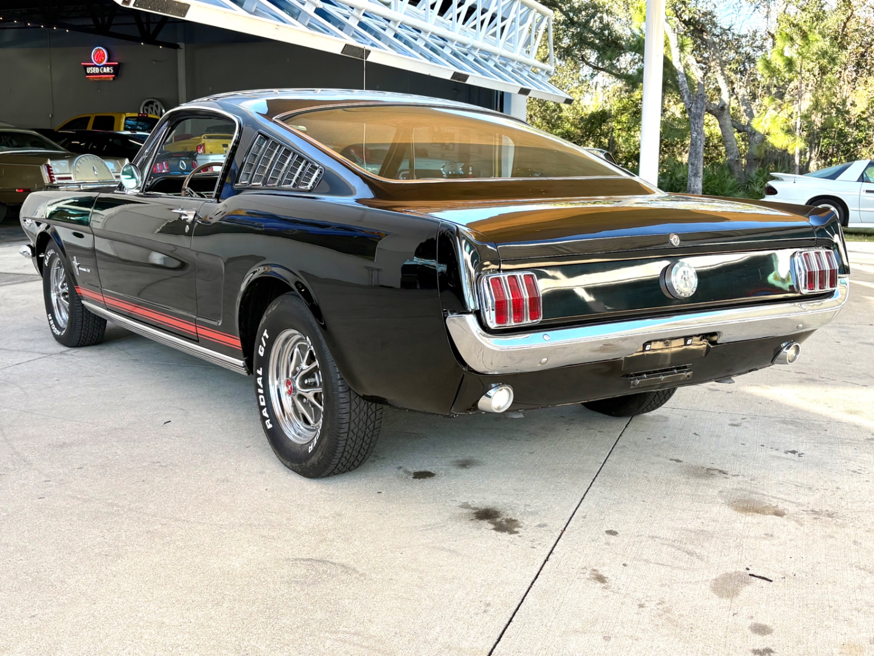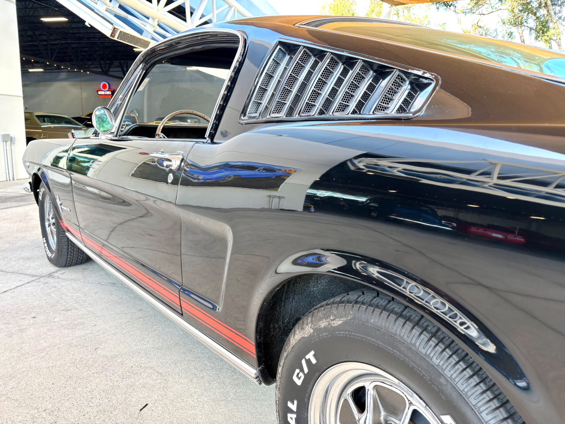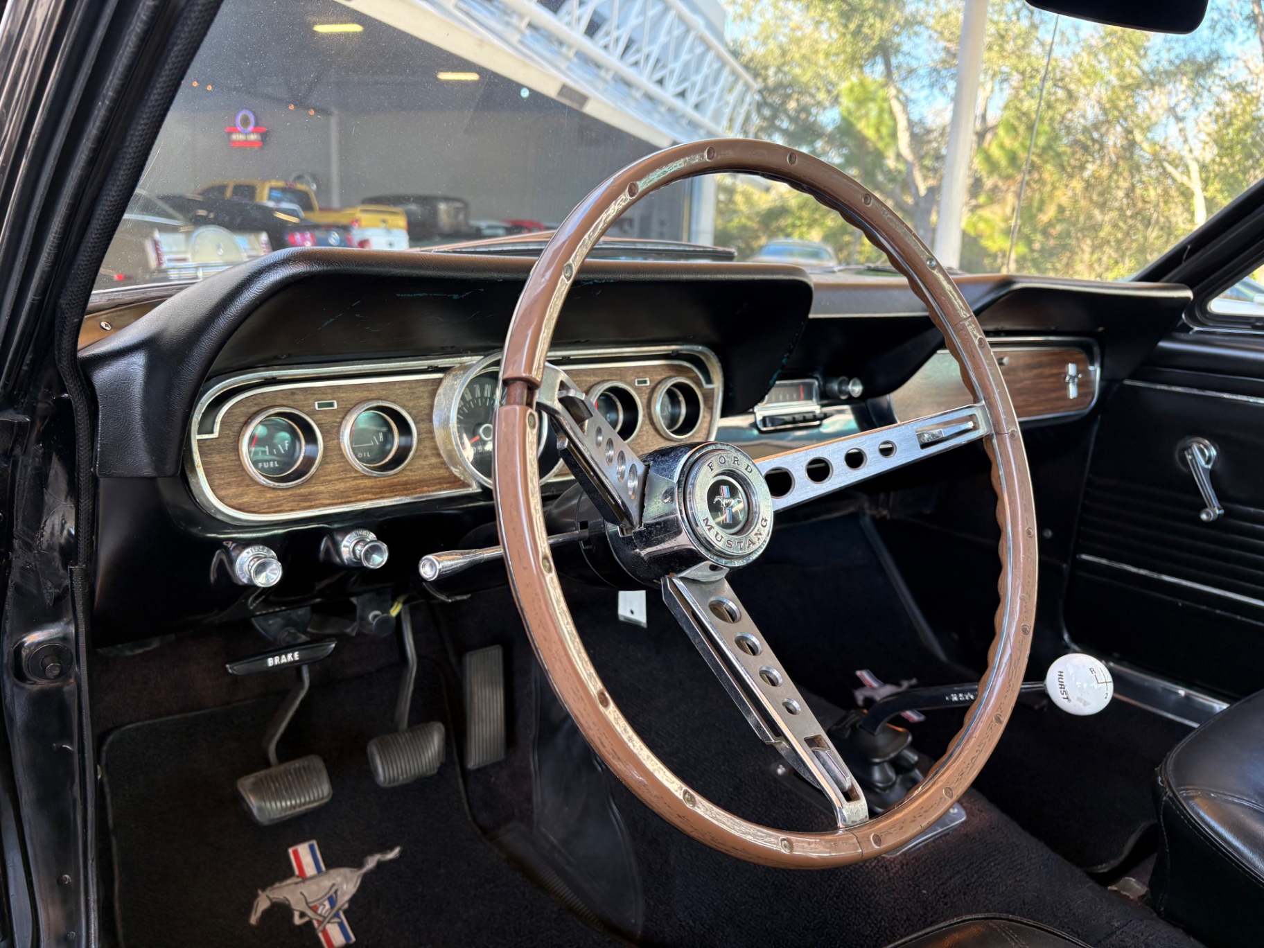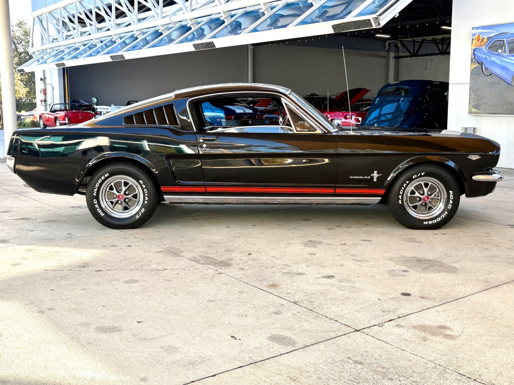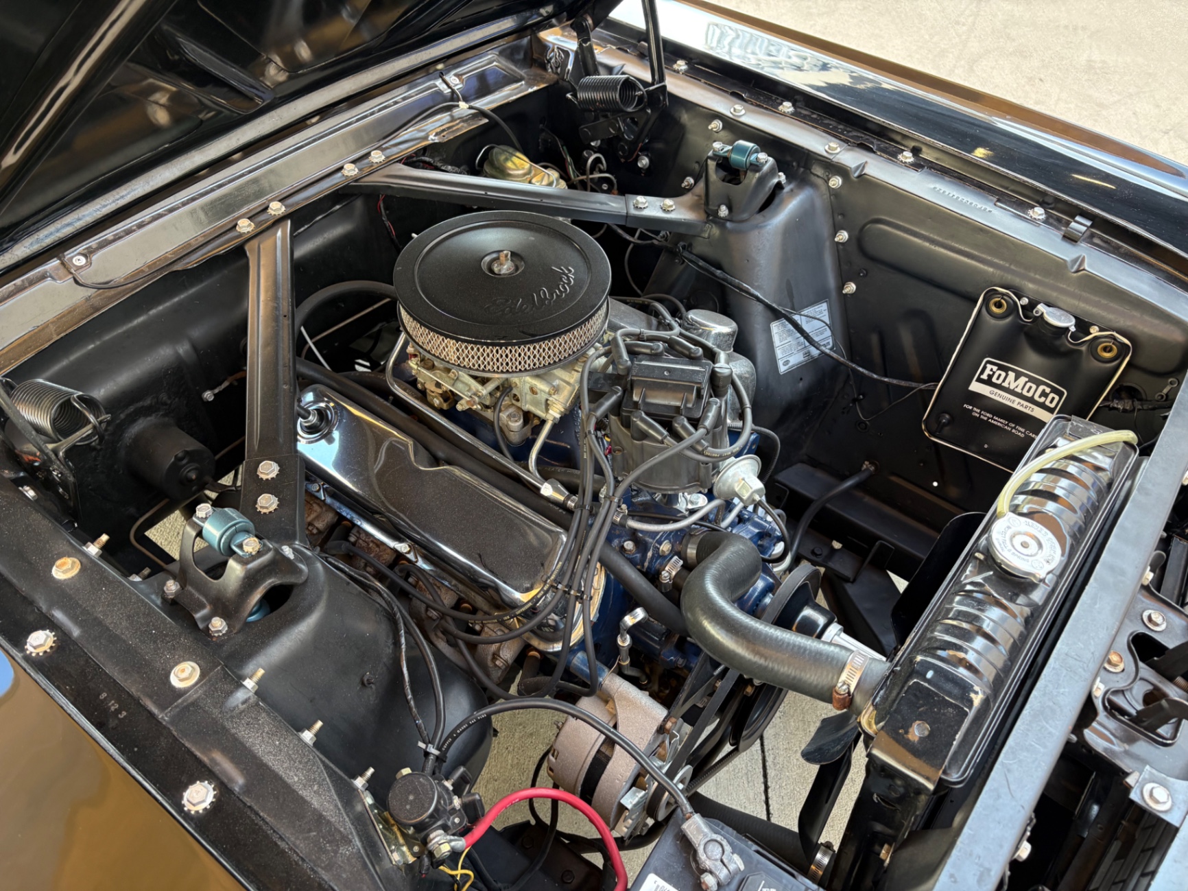 Factory C-Code 289 cubic inch engine 4-speed manual Transmission Electronic Ignition Conversion Holley 4-barrel Chrome valve covers Factory correct blue painted engine Open element air cleaner assembly Detailed engine compartment Black restored interior Twin buckets up front and the matching rear seat, dash, door panels Deluxe Steering wheel wood Instrument panel that has all the correct factory gauges 140-mph speedometer, fuel gauge, temperature gauge, oil pressure gauge, ammeter Chrome manual shifter with white shifter ball surrounded by chrome trim on the floor Original looking trunk with Factory trunk mat, spare tire cover, spare tire, and floor jack Mustang wears the fresh Raven Black paint Blacked-out grille Chrome front and rear bumpers Mustang emblem Unique fuel filler cap on the panel between the tail lamps Exhaust exiting underneath Factory styled wheels Road Hugger Radial GT raised white letter tires