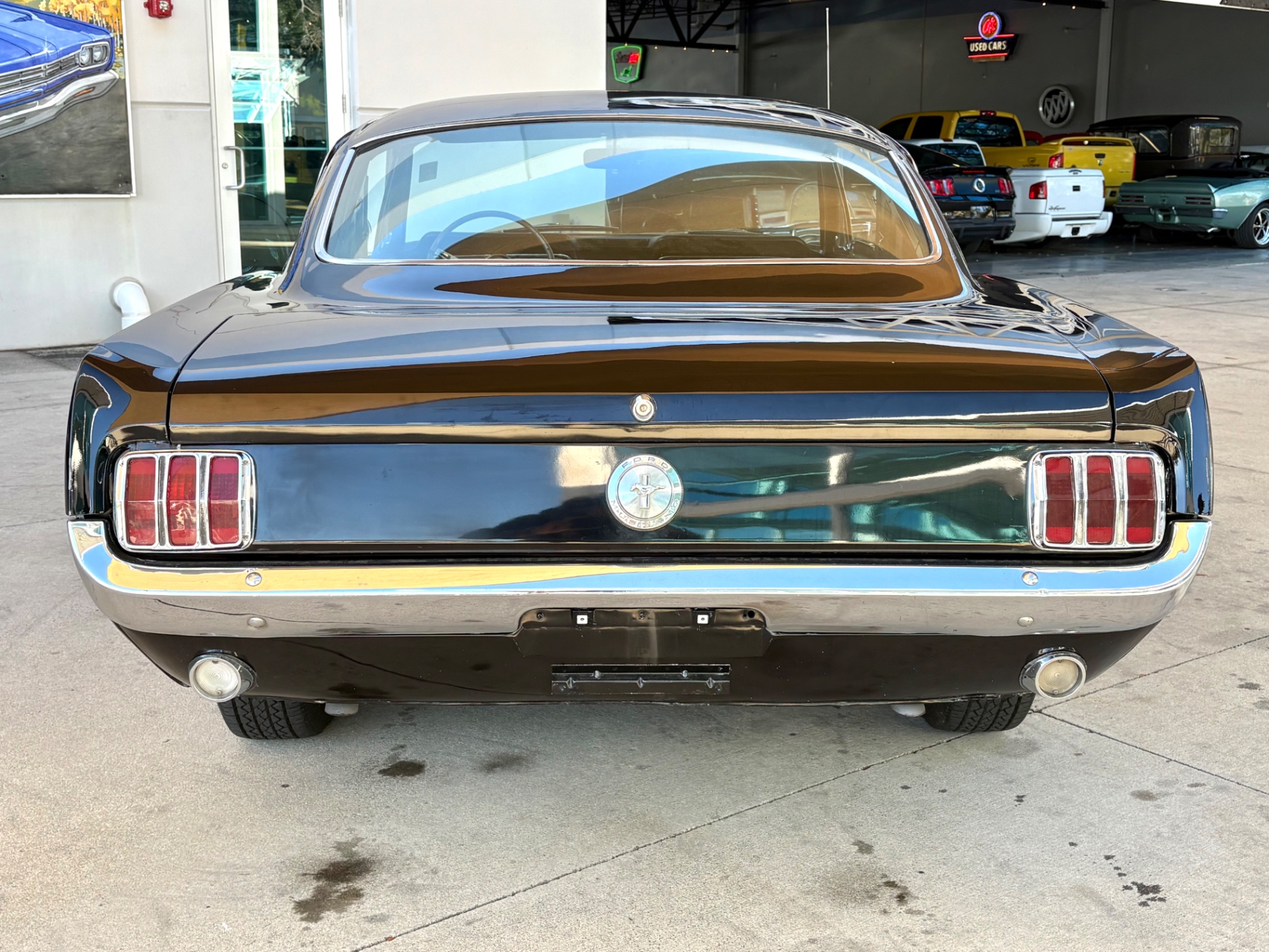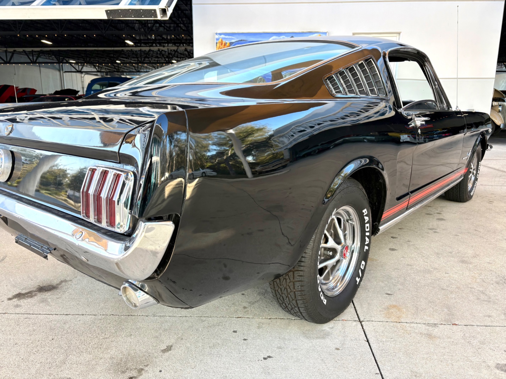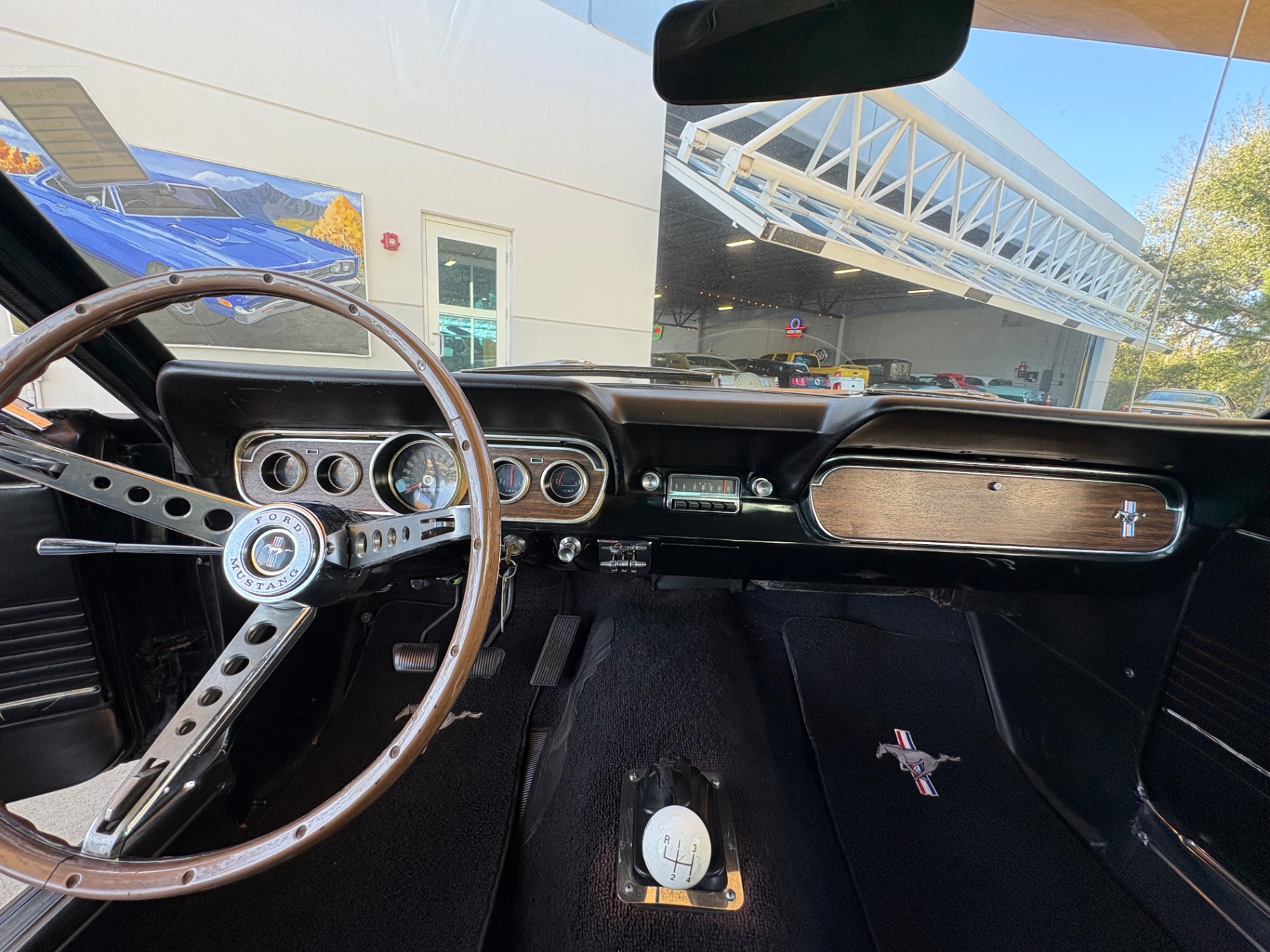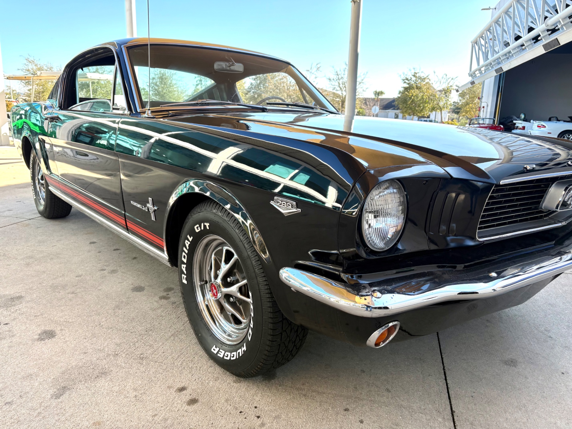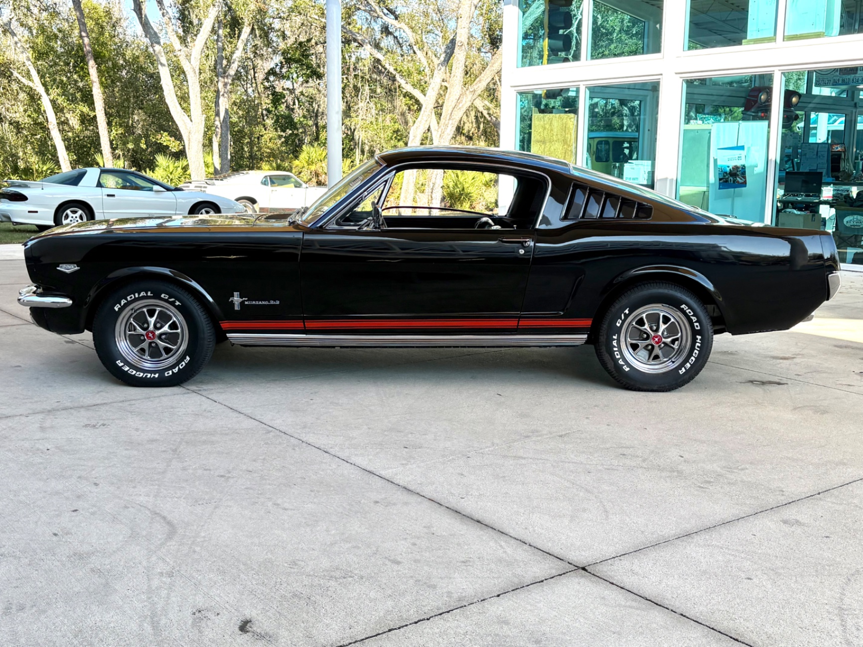 Factory C-Code 289 cubic inch engine 4-speed manual Transmission Electronic Ignition Conversion Holley 4-barrel Chrome valve covers Factory correct blue painted engine Open element air cleaner assembly Detailed engine compartment Black restored interior Twin buckets up front and the matching rear seat, dash, door panels Deluxe Steering wheel wood Instrument panel that has all the correct factory gauges 140-mph speedometer, fuel gauge, temperature gauge, oil pressure gauge, ammeter Chrome manual shifter with white shifter ball surrounded by chrome trim on the floor Original looking trunk with Factory trunk mat, spare tire cover, spare tire, and floor jack Mustang wears the fresh Raven Black paint Blacked-out grille Chrome front and rear bumpers Mustang emblem Unique fuel filler cap on the panel between the tail lamps Exhaust exiting underneath Factory styled wheels Road Hugger Radial GT raised white letter tires
