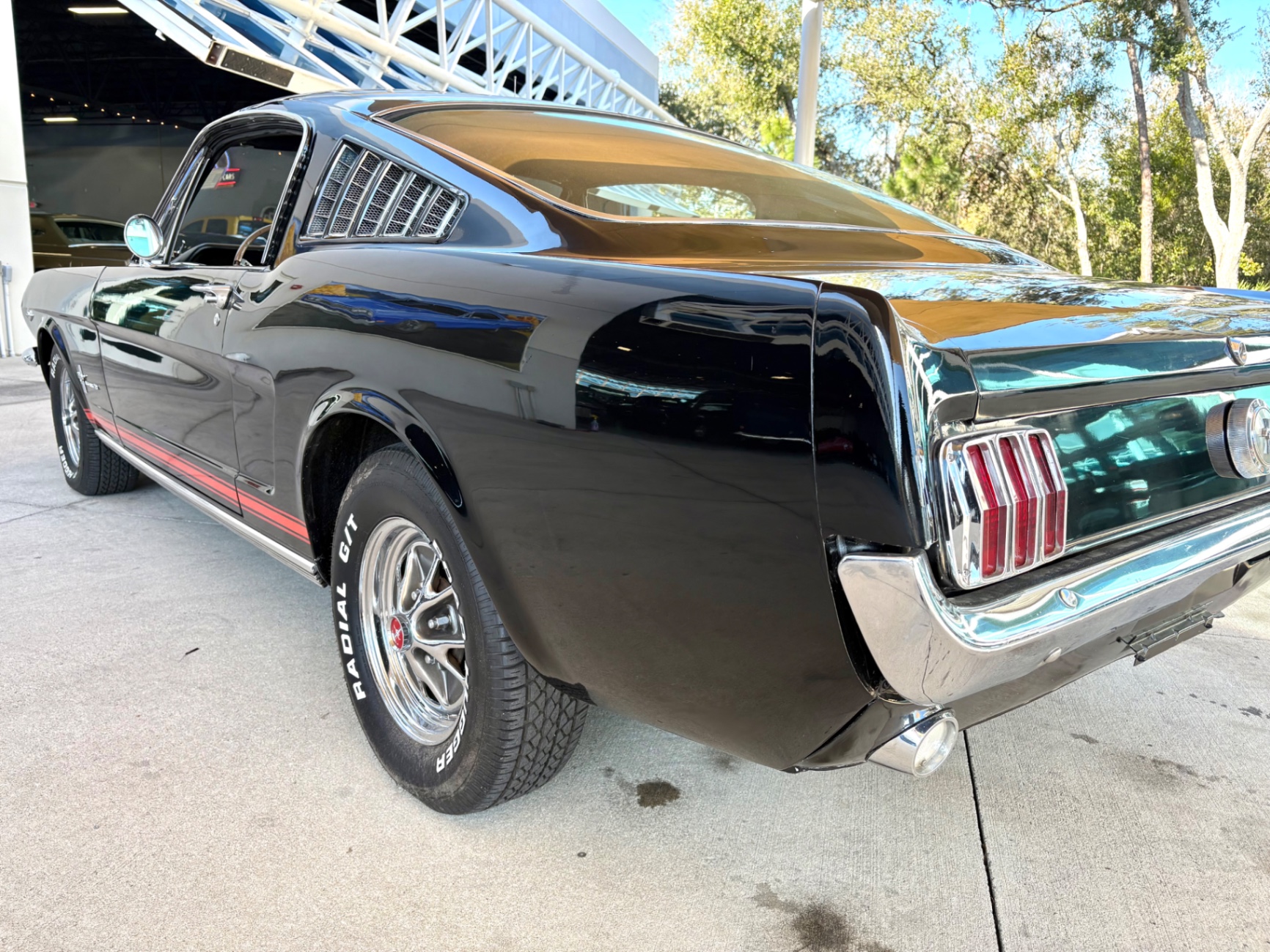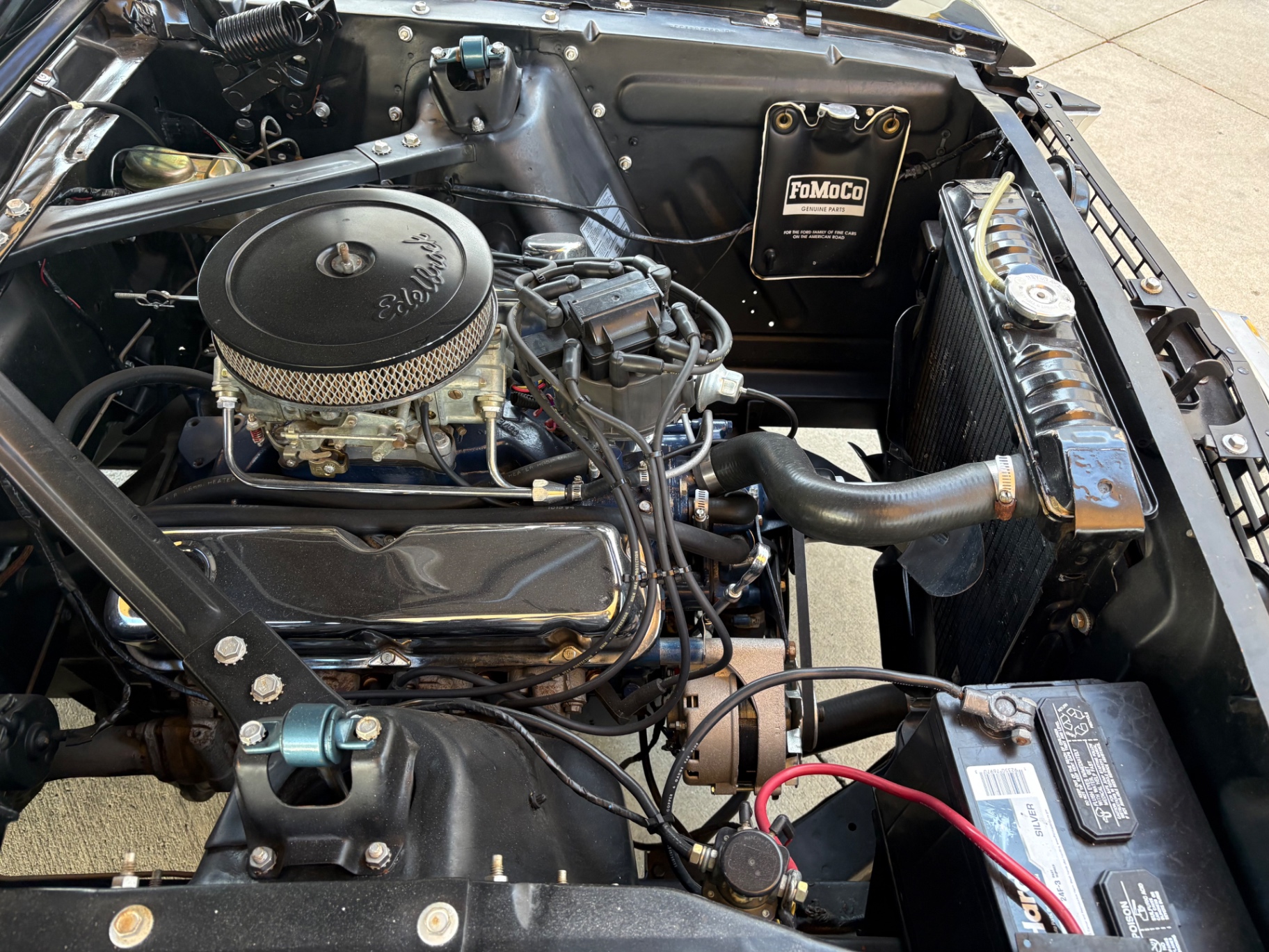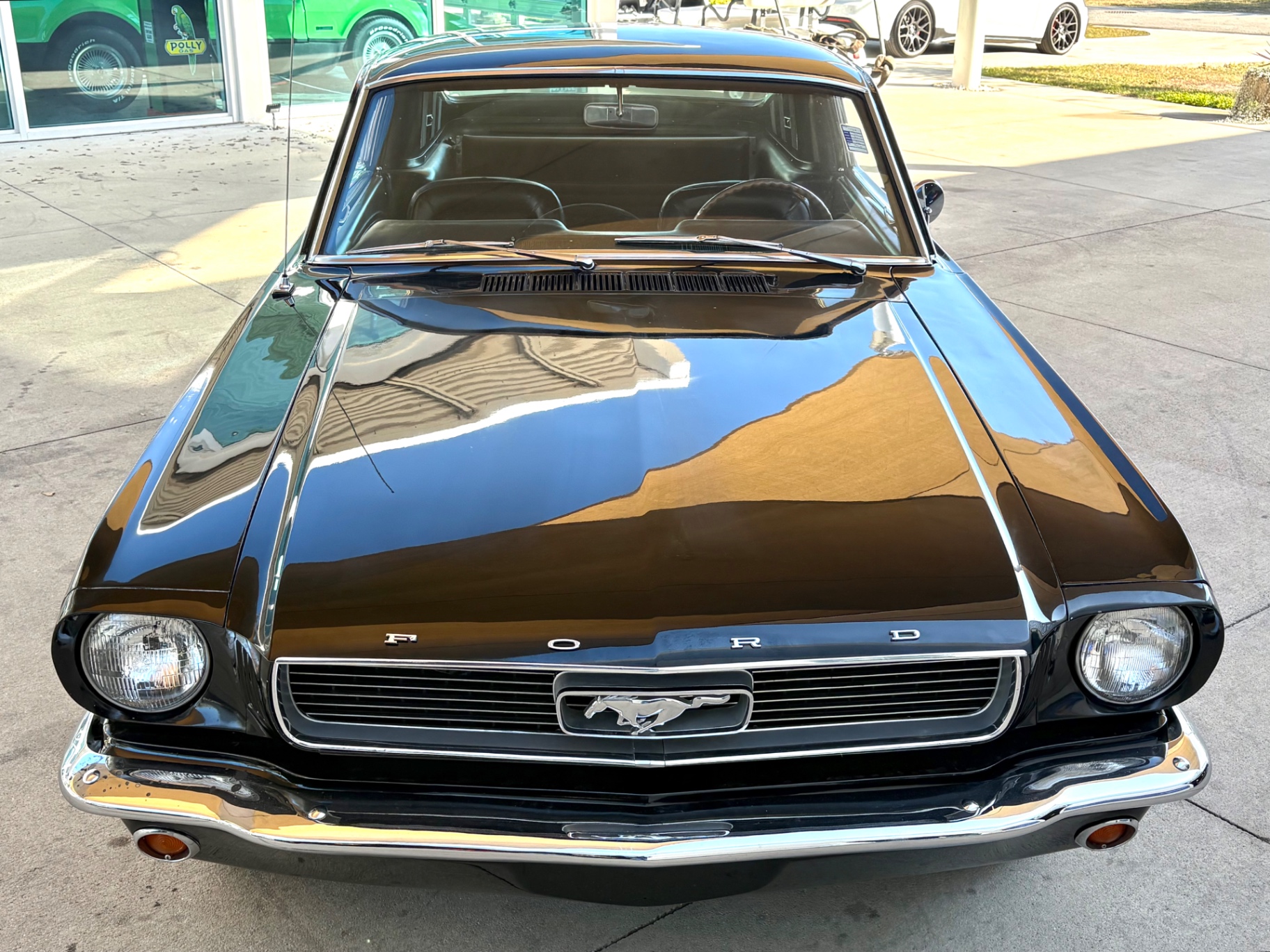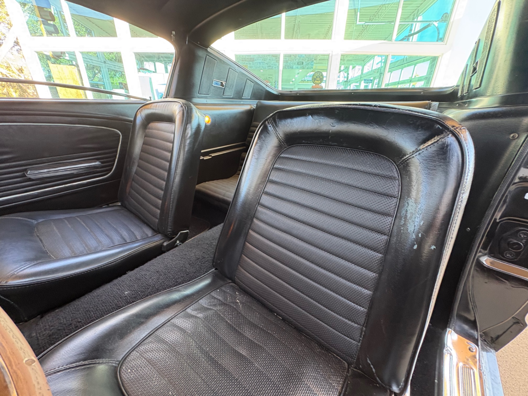 Factory C-Code 289 cubic inch engine 4-speed manual Transmission Electronic Ignition Conversion Holley 4-barrel Chrome valve covers Factory correct blue painted engine Open element air cleaner assembly Detailed engine compartment Black restored interior Twin buckets up front and the matching rear seat, dash, door panels Deluxe Steering wheel wood Instrument panel that has all the correct factory gauges 140-mph speedometer, fuel gauge, temperature gauge, oil pressure gauge, ammeter Chrome manual shifter with white shifter ball surrounded by chrome trim on the floor Original looking trunk with Factory trunk mat, spare tire cover, spare tire, and floor jack Mustang wears the fresh Raven Black paint Blacked-out grille Chrome front and rear bumpers Mustang emblem Unique fuel filler cap on the panel between the tail lamps Exhaust exiting underneath Factory styled wheels Road Hugger Radial GT raised white letter tires