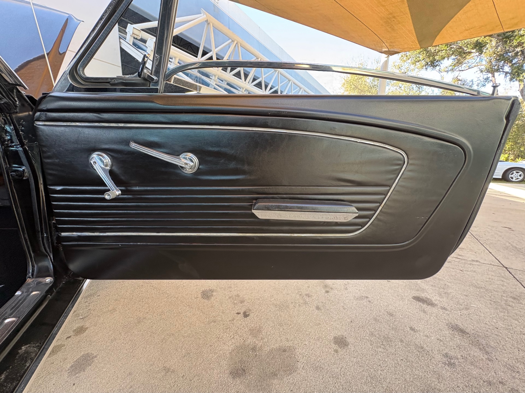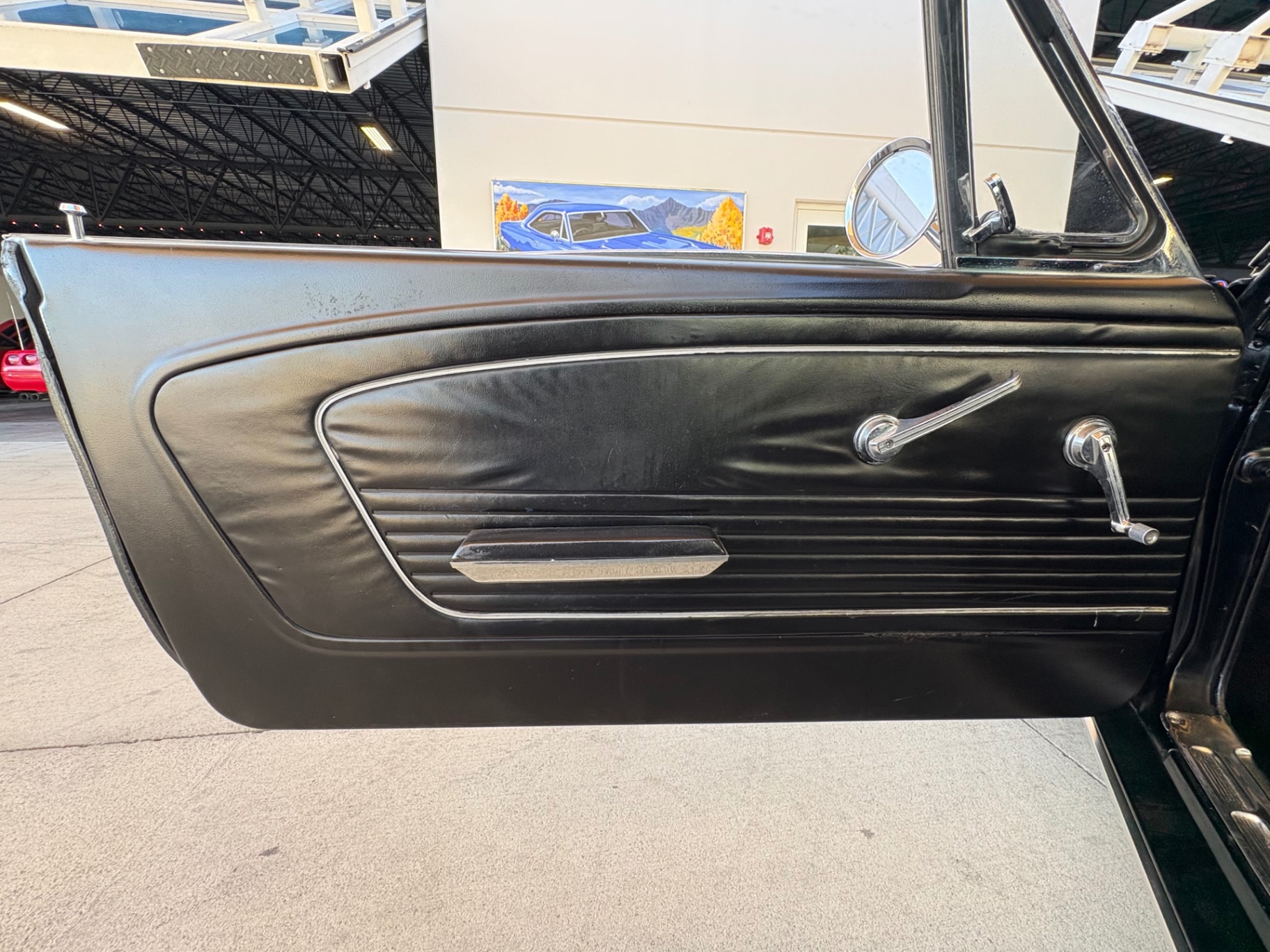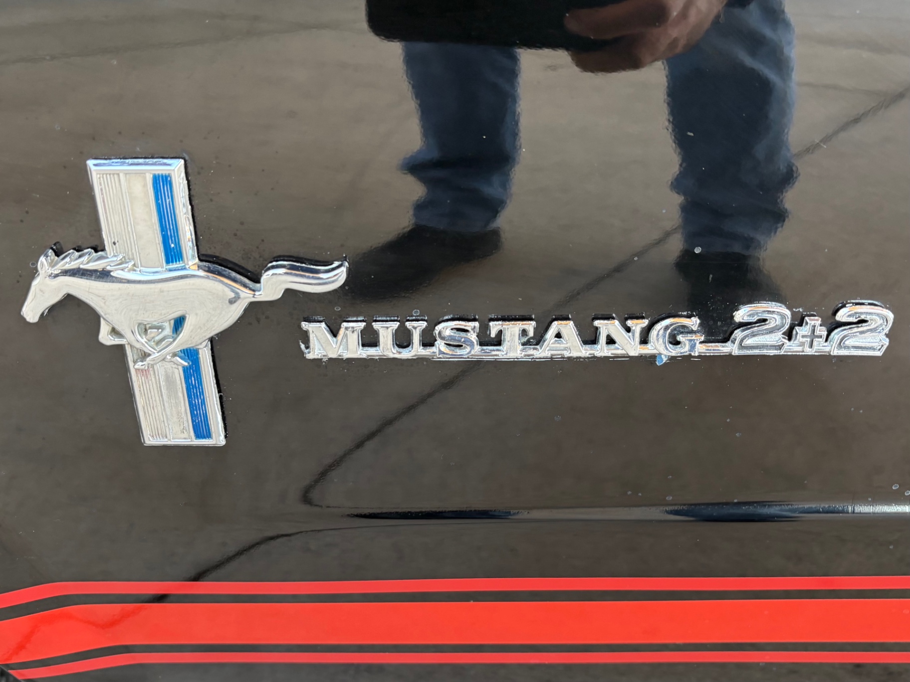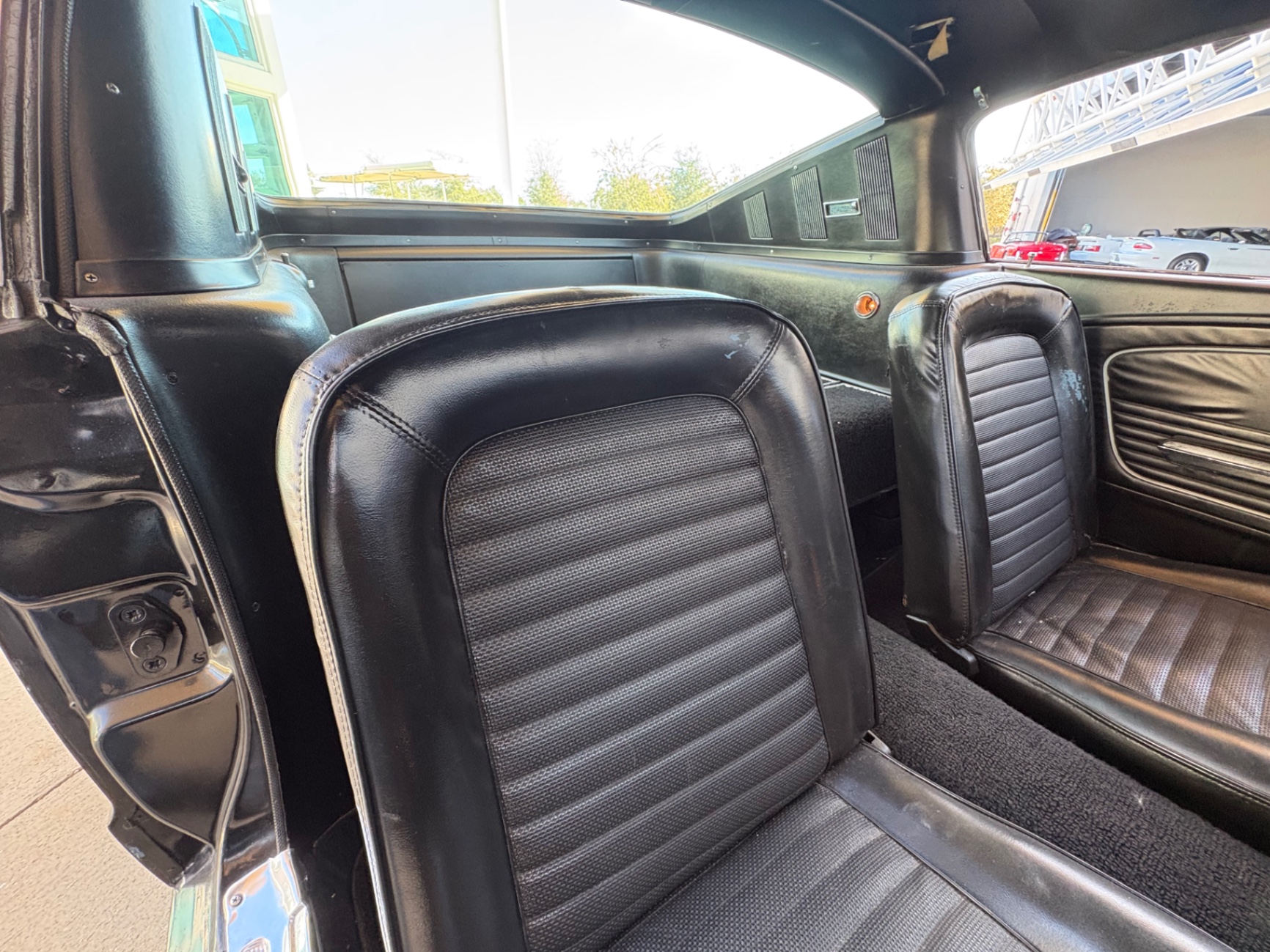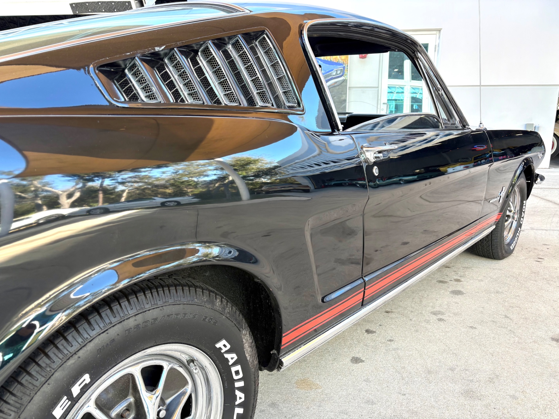 Factory C-Code 289 cubic inch engine 4-speed manual Transmission Electronic Ignition Conversion Holley 4-barrel Chrome valve covers Factory correct blue painted engine Open element air cleaner assembly Detailed engine compartment Black restored interior Twin buckets up front and the matching rear seat, dash, door panels Deluxe Steering wheel wood Instrument panel that has all the correct factory gauges 140-mph speedometer, fuel gauge, temperature gauge, oil pressure gauge, ammeter Chrome manual shifter with white shifter ball surrounded by chrome trim on the floor Original looking trunk with Factory trunk mat, spare tire cover, spare tire, and floor jack Mustang wears the fresh Raven Black paint Blacked-out grille Chrome front and rear bumpers Mustang emblem Unique fuel filler cap on the panel between the tail lamps Exhaust exiting underneath Factory styled wheels Road Hugger Radial GT raised white letter tires