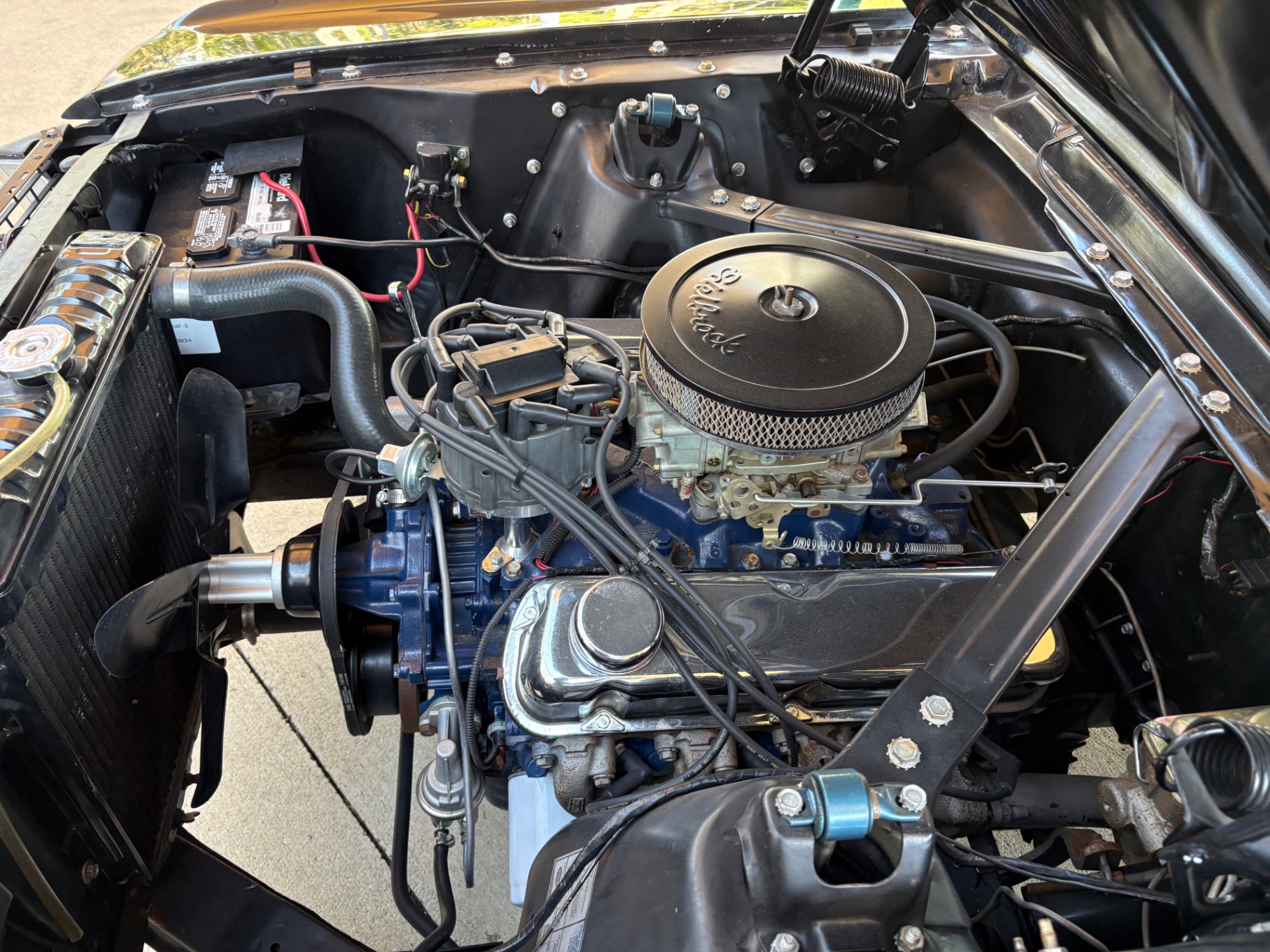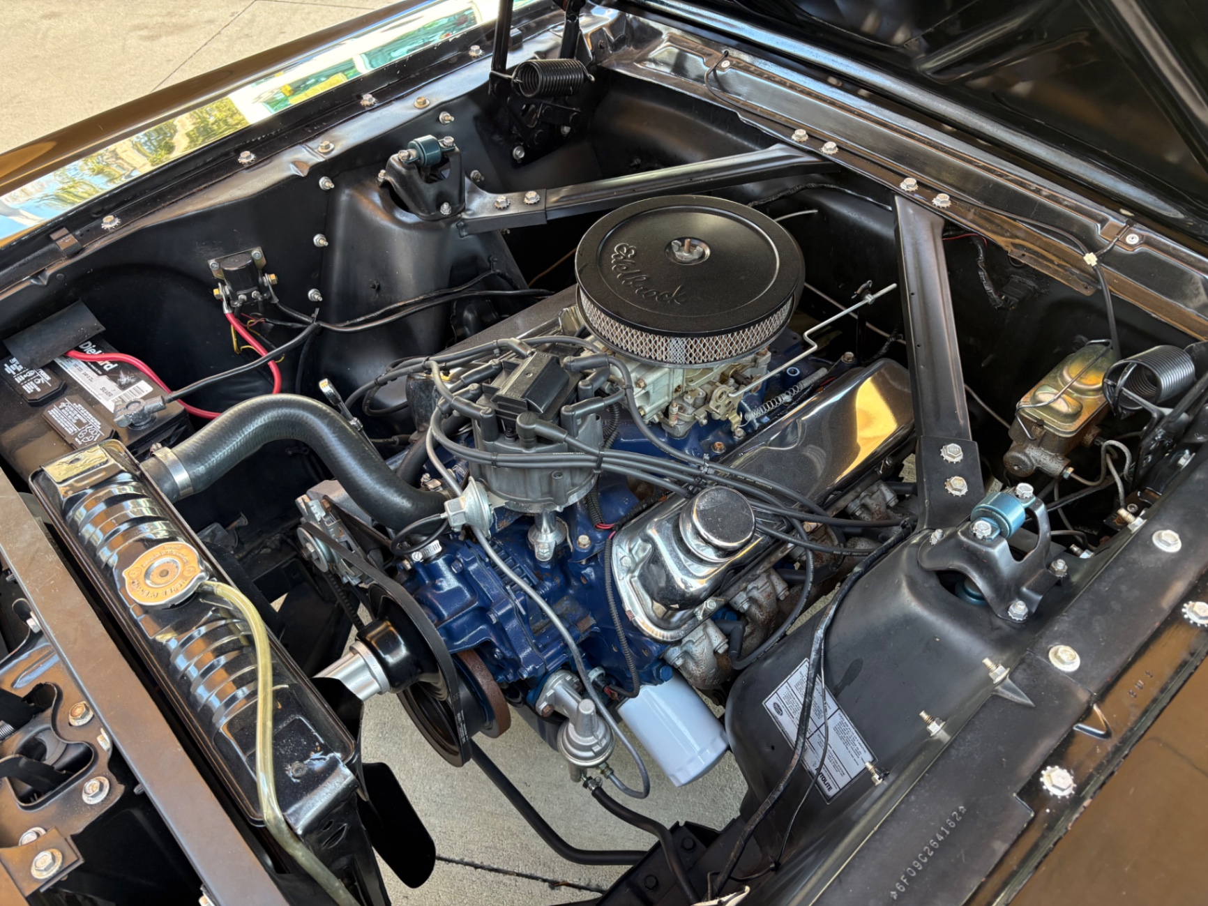 Our Mustang has a rebuilt 289 Cubic Inch factory C-Code 8-cylinder engine with a 4-speed manual transmission, Electronic Ignition Conversion, Holley 4-barrel, Chrome valve covers, Factory correct blue painted engine, Open element air cleaner assembly, and a detailed engine compartment.