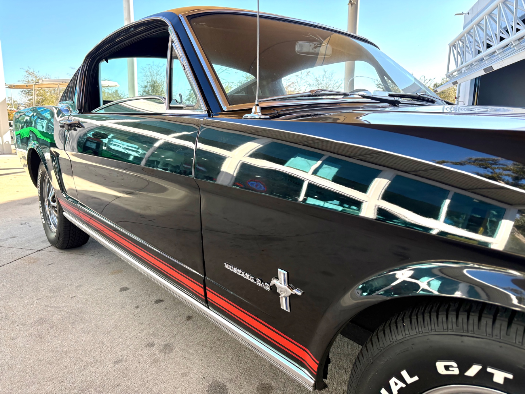 Our Mustang rides on the factory styled wheels on Road Hugger Radial GT raised white letter tires as this wheel and tire combination is totally fitting on this classic pony car, and combined with the square set body, they give this Mustang a stance that is just magnificent.