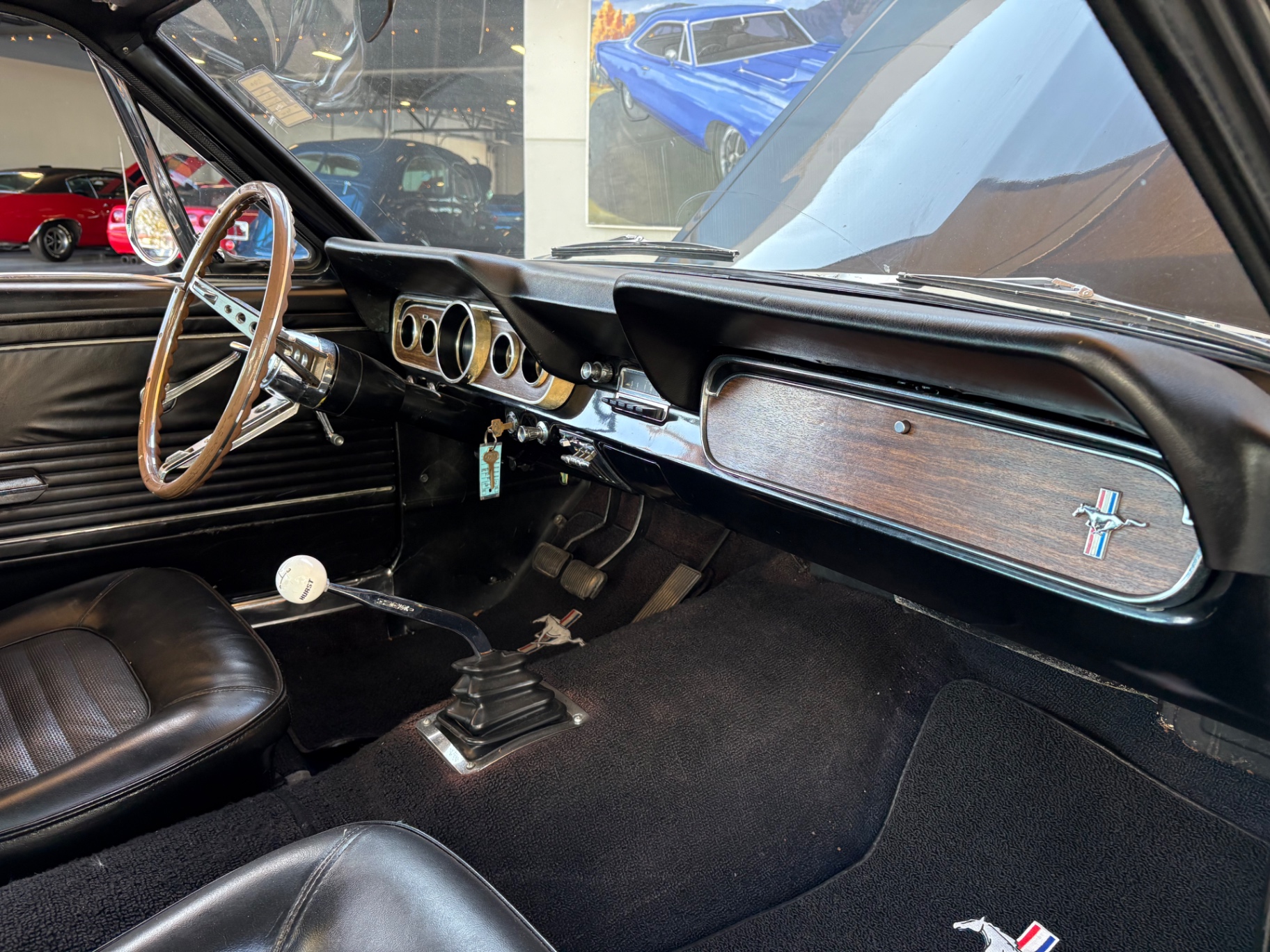 The restored interior is all as it was when it was factory original with its black twin buckets up front and the matching rear seat, dash, door panels, carpet and Mustang floor mats, Mustang sport wood steering wheel, Instrument panel that has all the correct factory gauges including the 140-mph speedometer, fuel gauge, temperature gauge, oil pressure gauge, ammeter, and chrome 4-speed manual shifter with the white shifter ball surrounded by chrome trim on the floor.