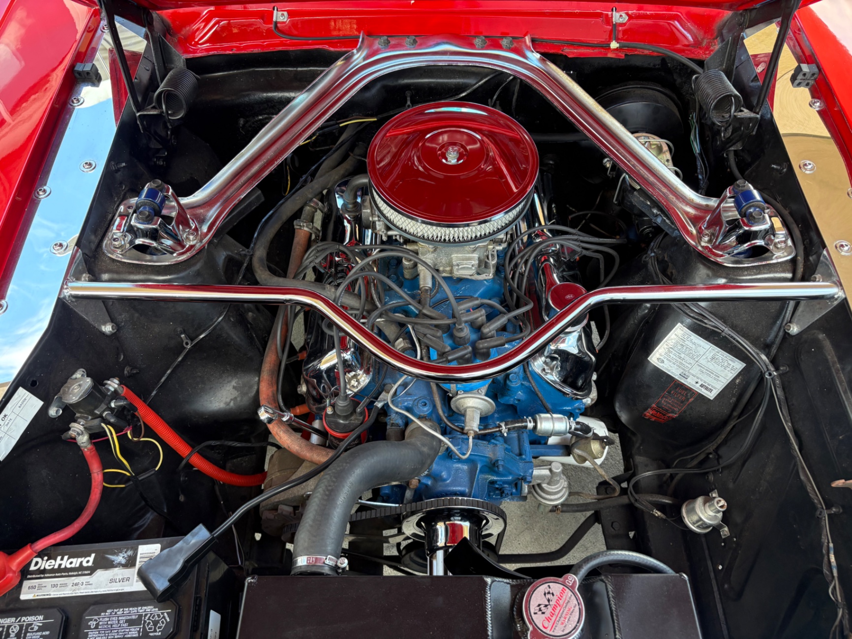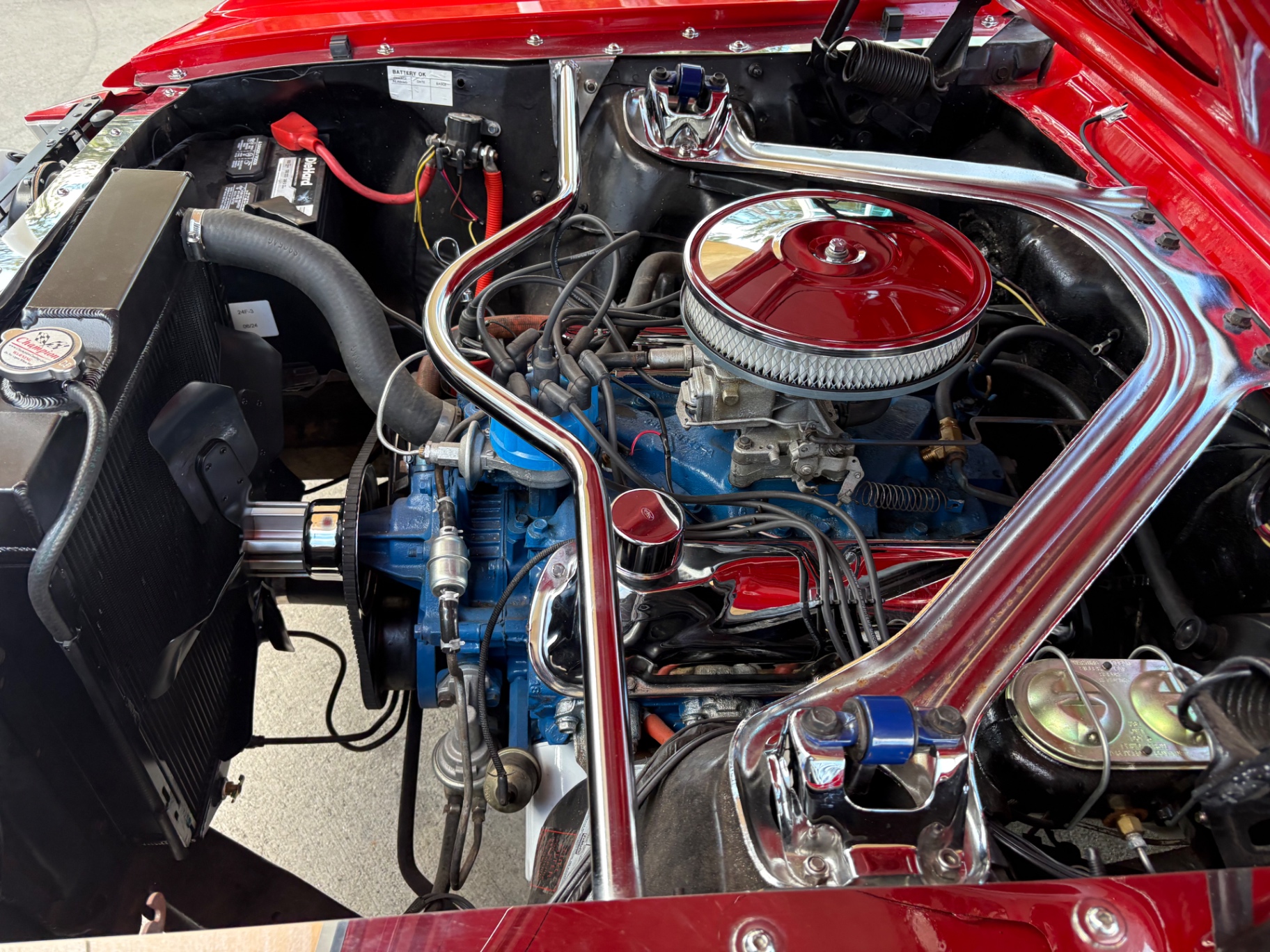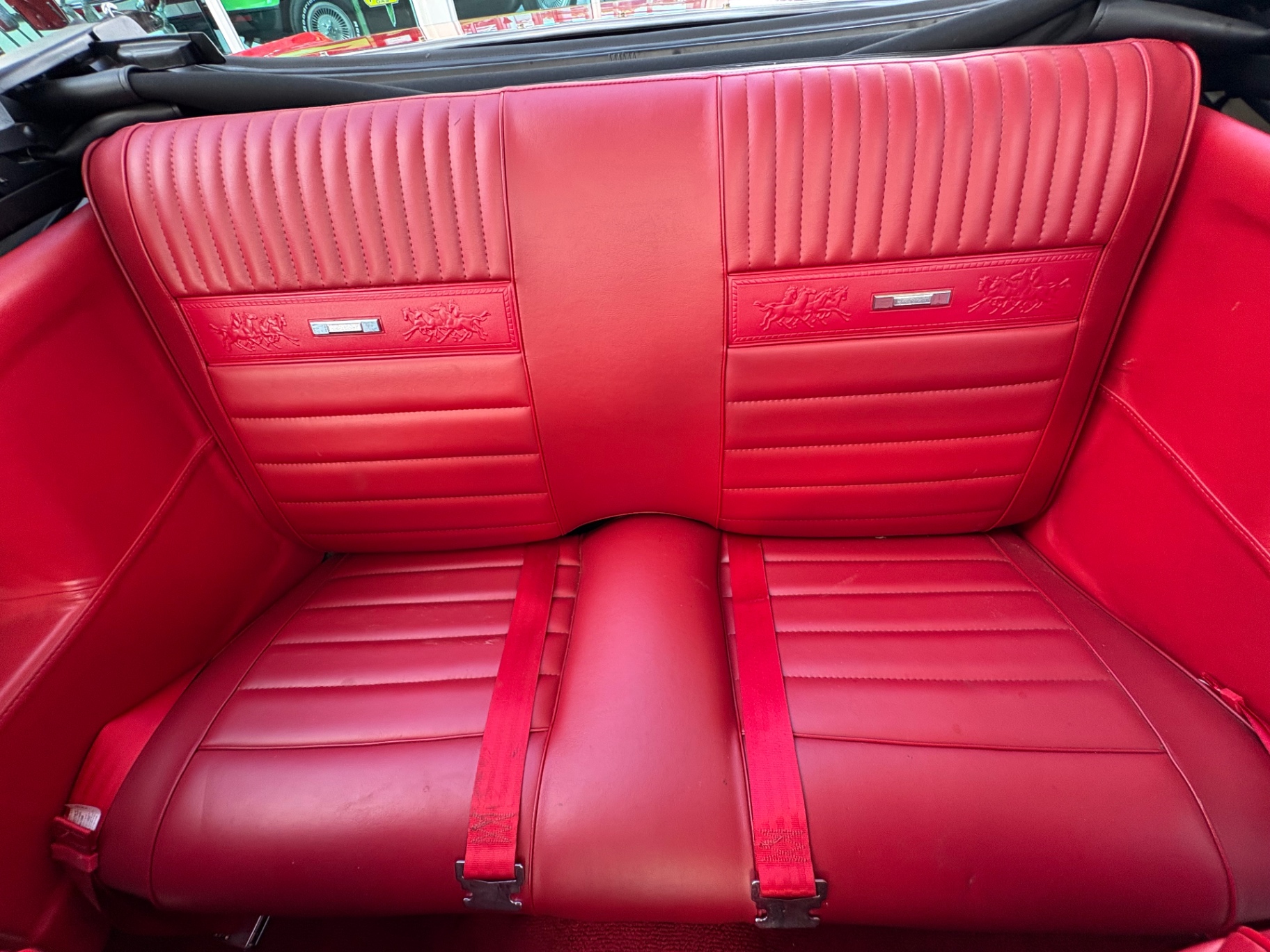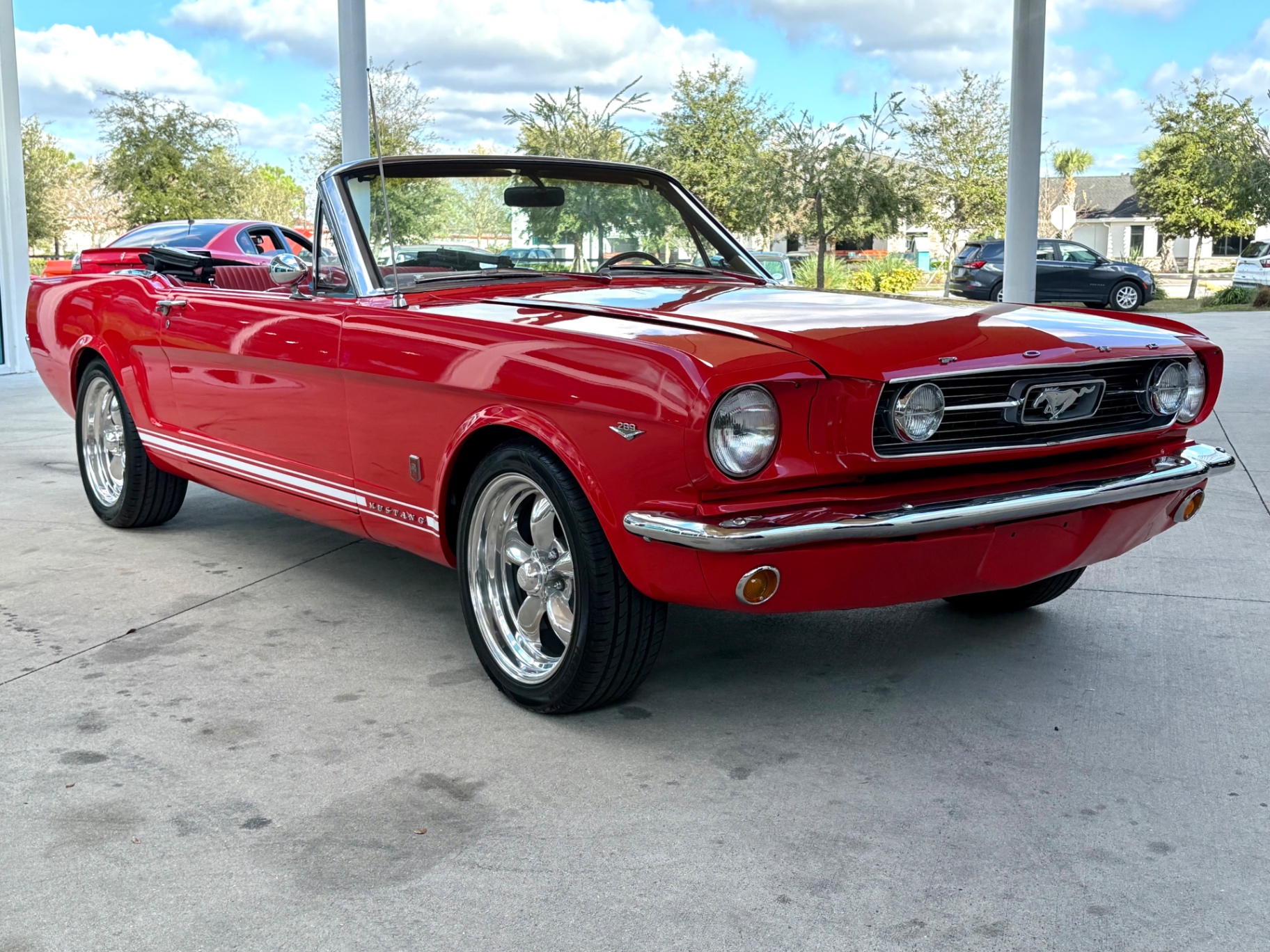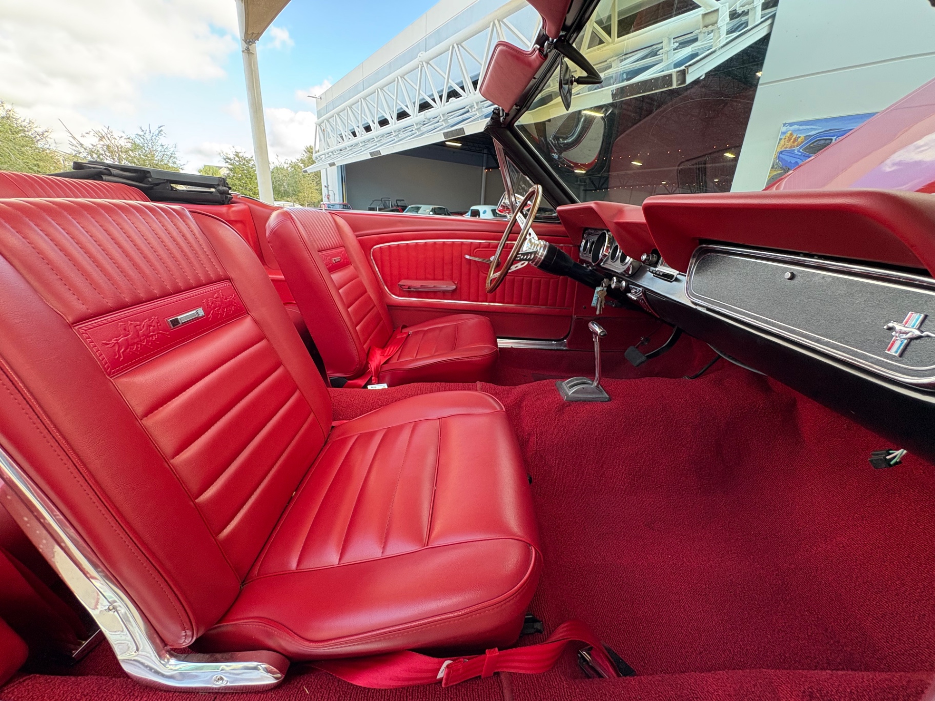 - 289 2-barrel V8 engine - 3-speed C4 "Cruise-O-Matic" automatic transmission - 200 horsepower - New aluminum radiator - New Power Disc Brakes - New tires - Front bucket seats - Red deluxe pony interior - Chrome valve covers - Pleated vinyl upholstery - Factory radio - Power top - Five-dial instrument cluster - Full carpeting - Heater and defroster - Safety-padded instrument panel and sun visors - Floating pony emblem on front grille - Left-hand door outside mirror - Backup lamps - Rocker panel moldings - Front and rear seat belts - Deep-dish steering wheel - Emergency flasher - Freshly painted - Independent coil spring front suspension - Leaf spring rear suspension - 16-gallon gas tank