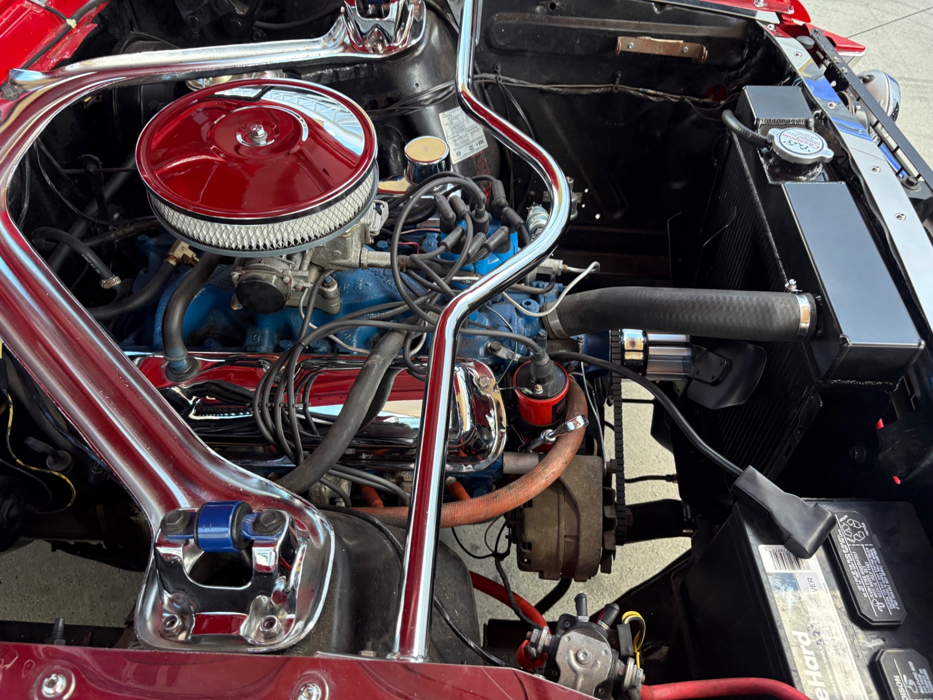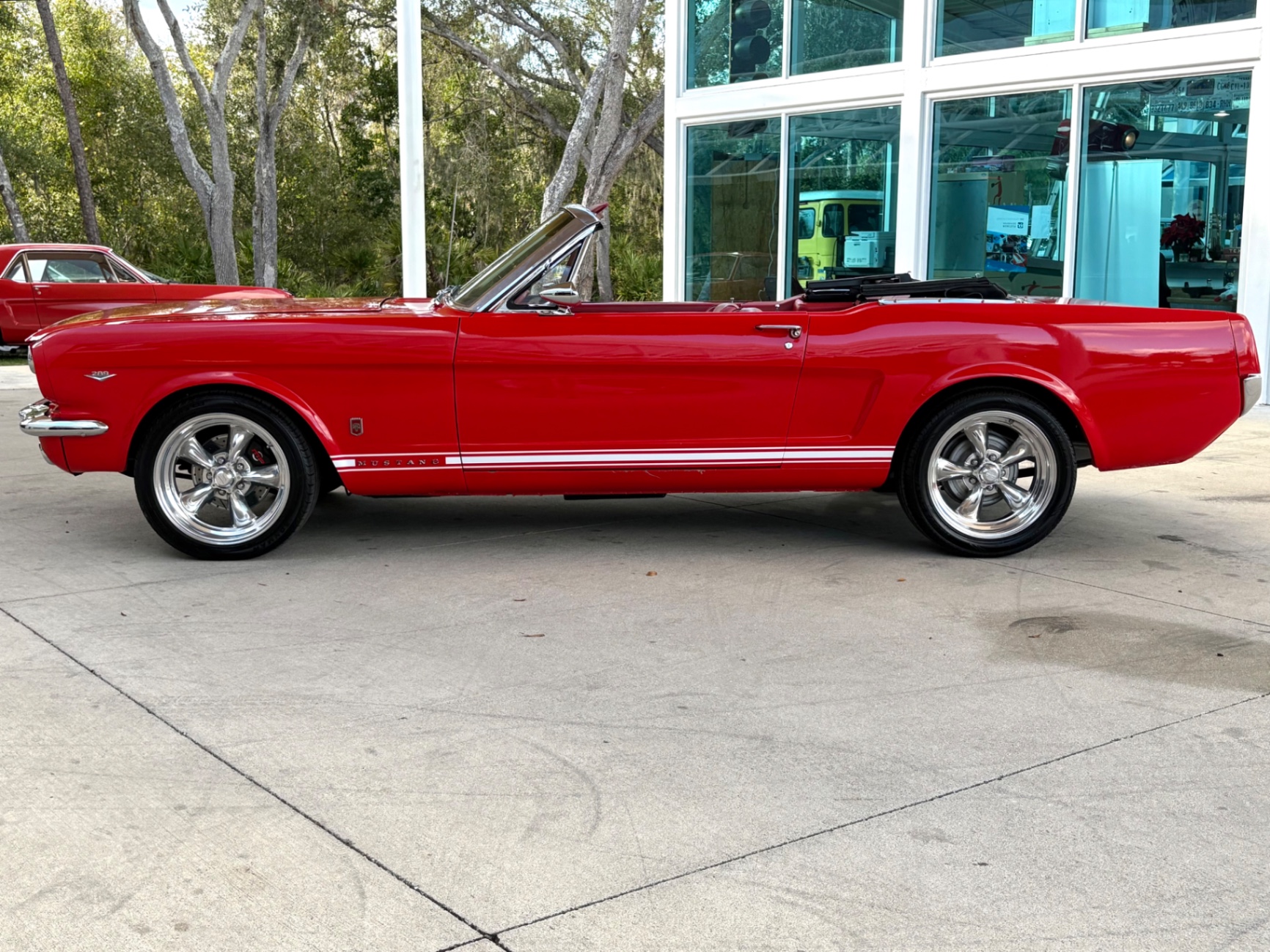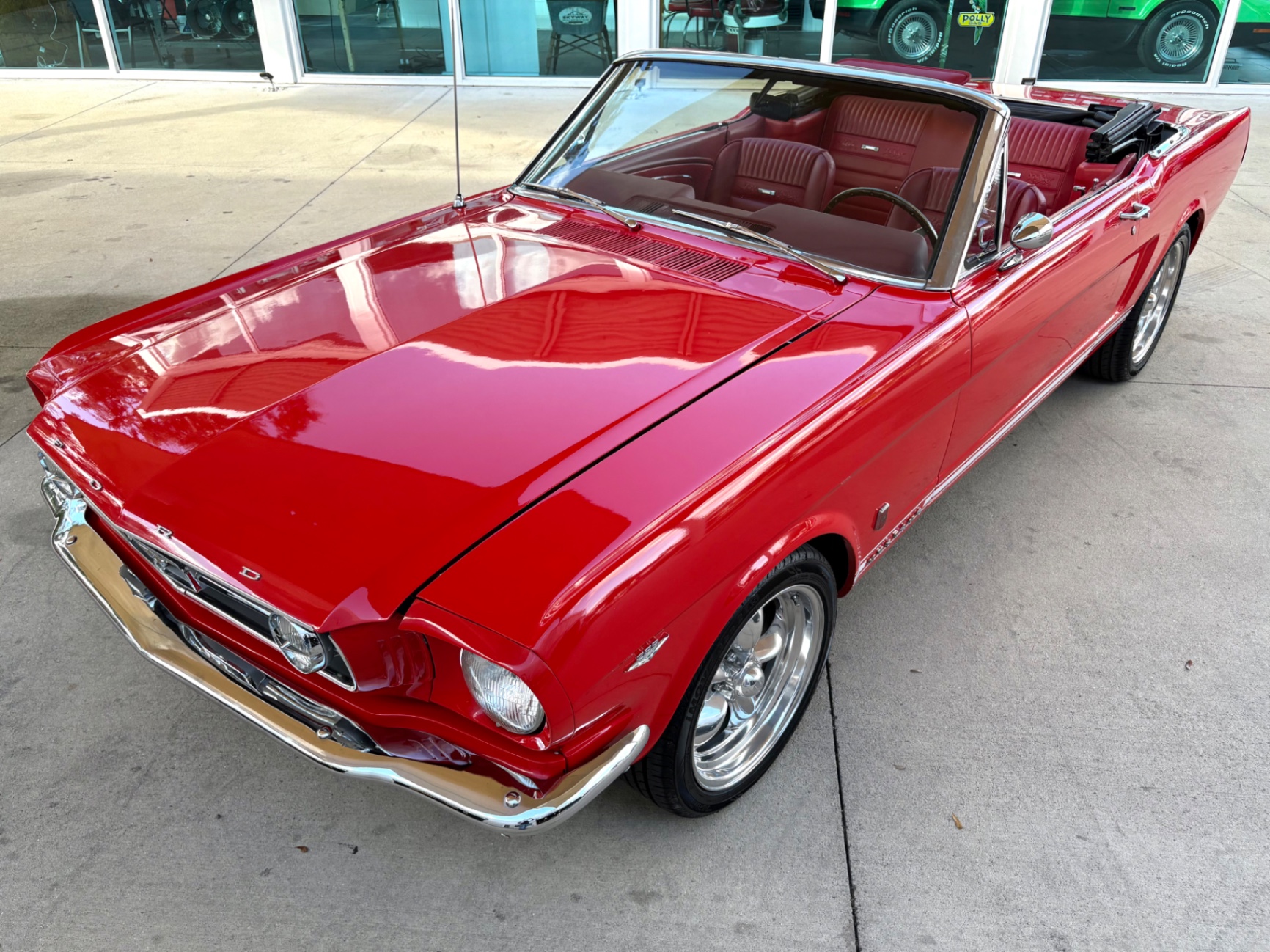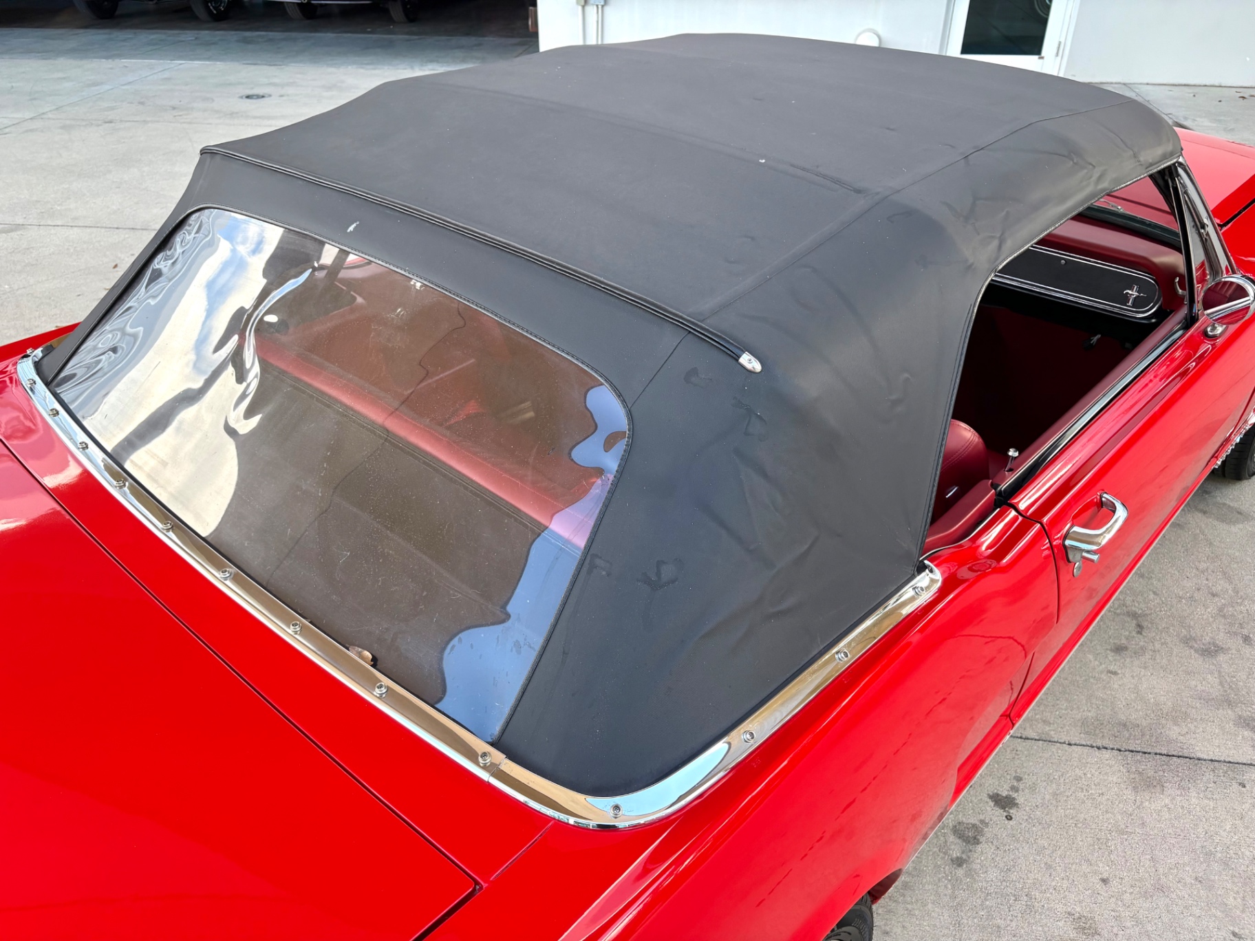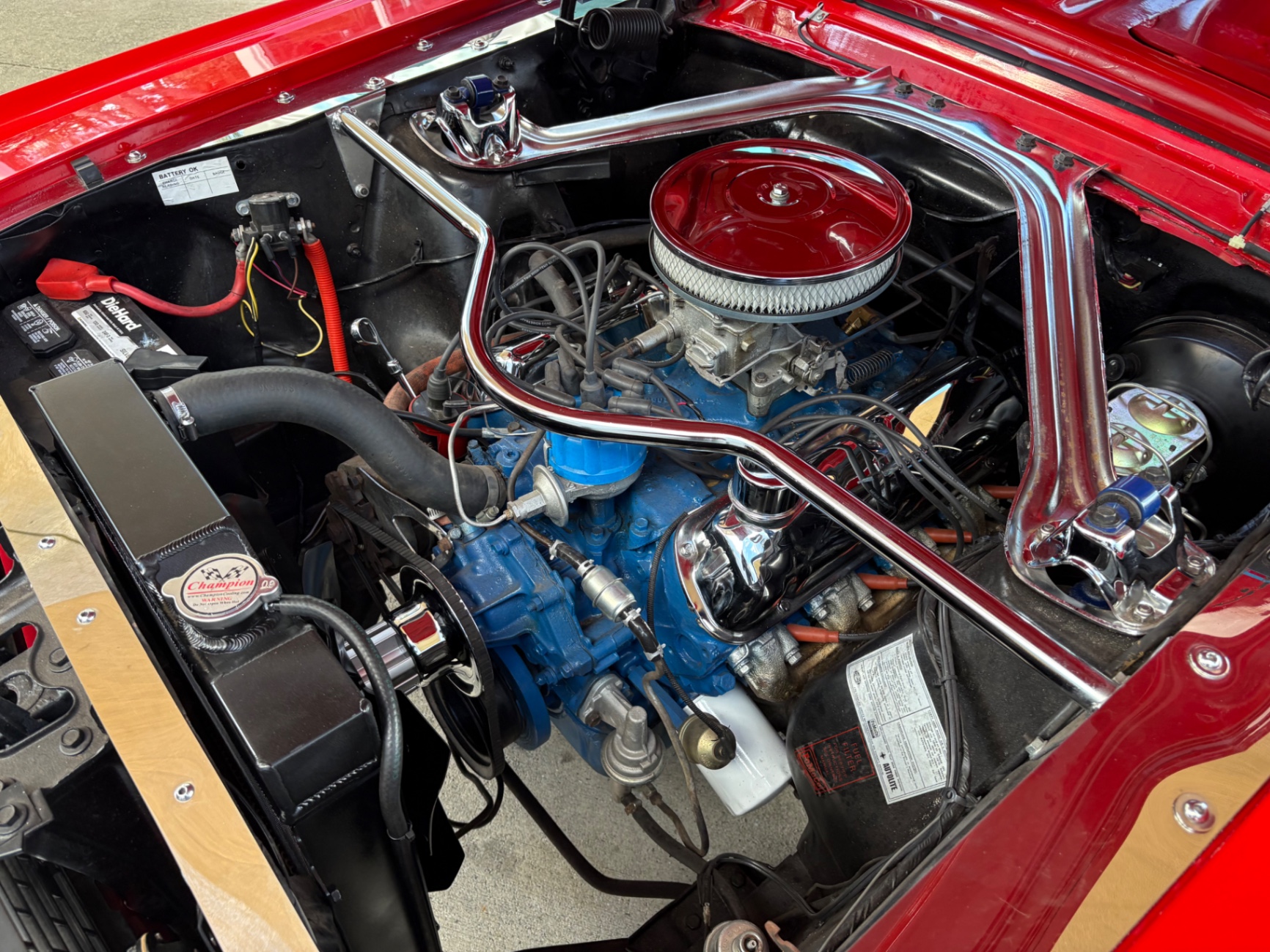 - 289 2-barrel V8 engine - 3-speed C4 "Cruise-O-Matic" automatic transmission - 200 horsepower - New aluminum radiator - New Power Disc Brakes - New tires - Front bucket seats - Red deluxe pony interior - Chrome valve covers - Pleated vinyl upholstery - Factory radio - Power top - Five-dial instrument cluster - Full carpeting - Heater and defroster - Safety-padded instrument panel and sun visors - Floating pony emblem on front grille - Left-hand door outside mirror - Backup lamps - Rocker panel moldings - Front and rear seat belts - Deep-dish steering wheel - Emergency flasher - Freshly painted - Independent coil spring front suspension - Leaf spring rear suspension - 16-gallon gas tank