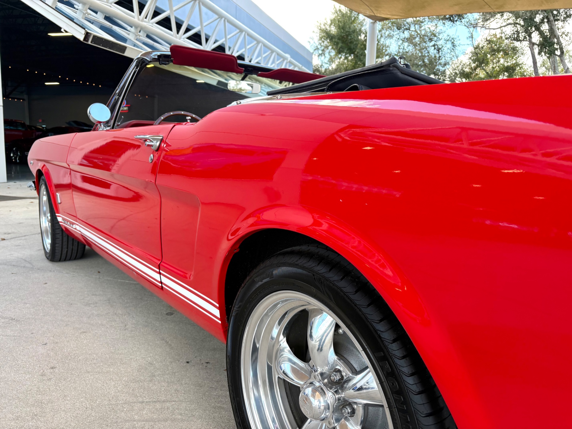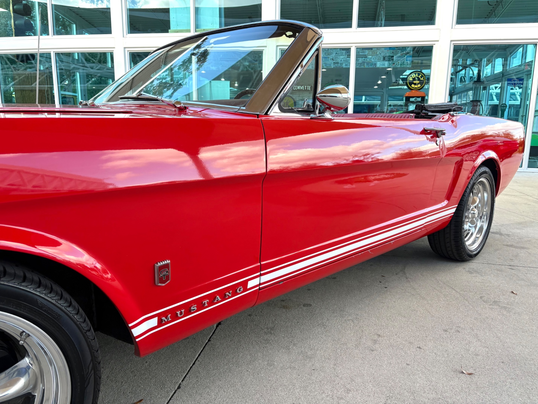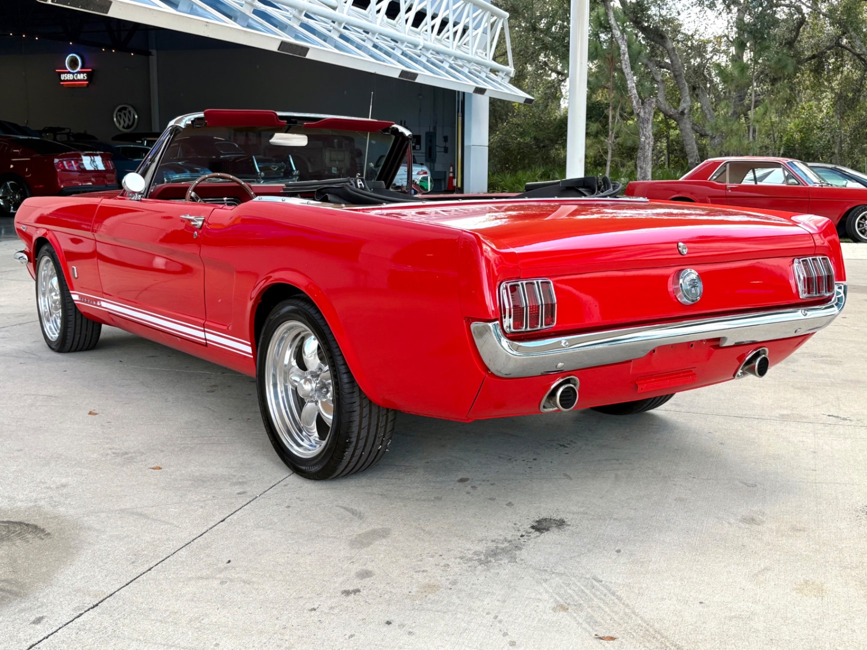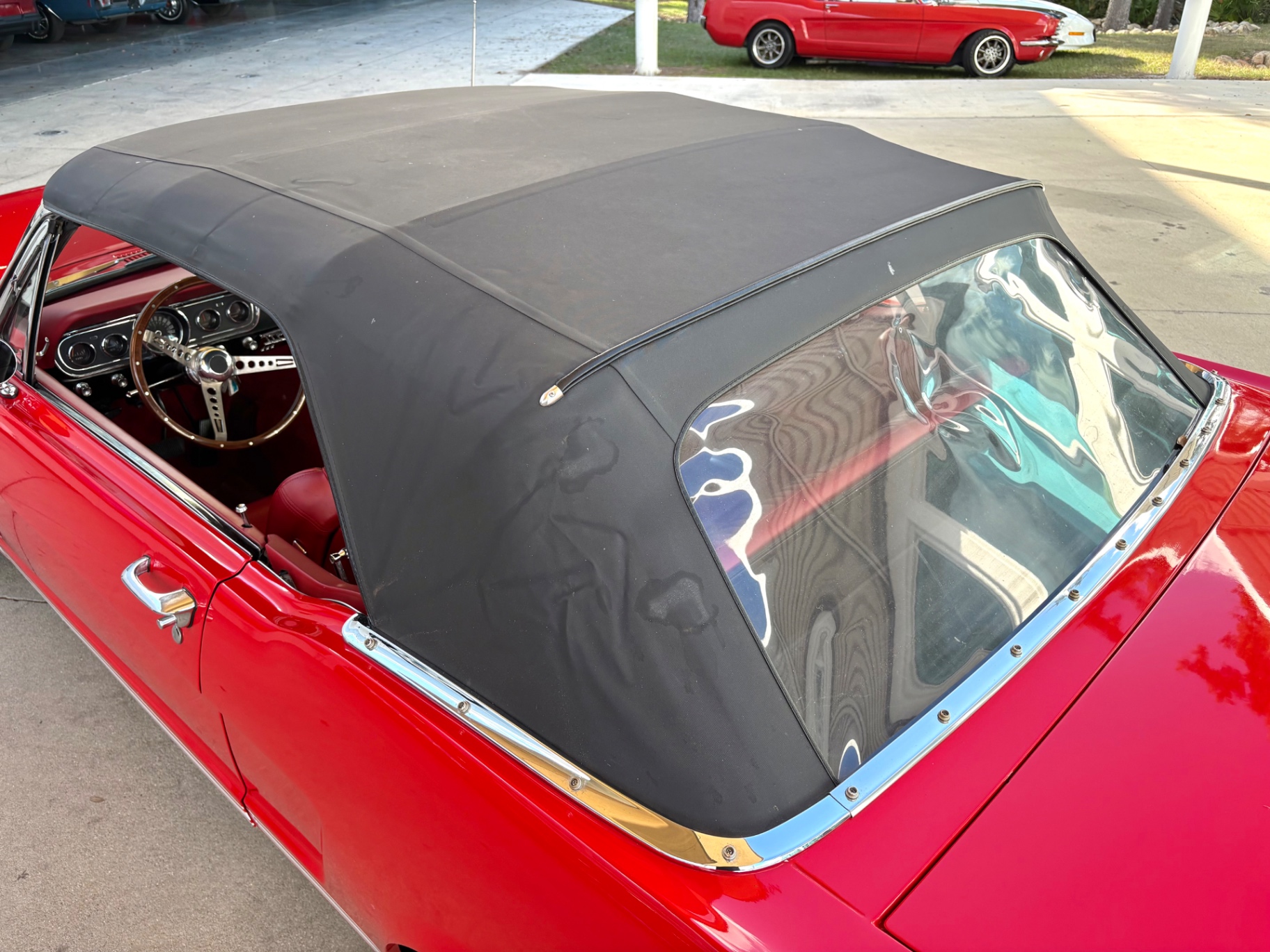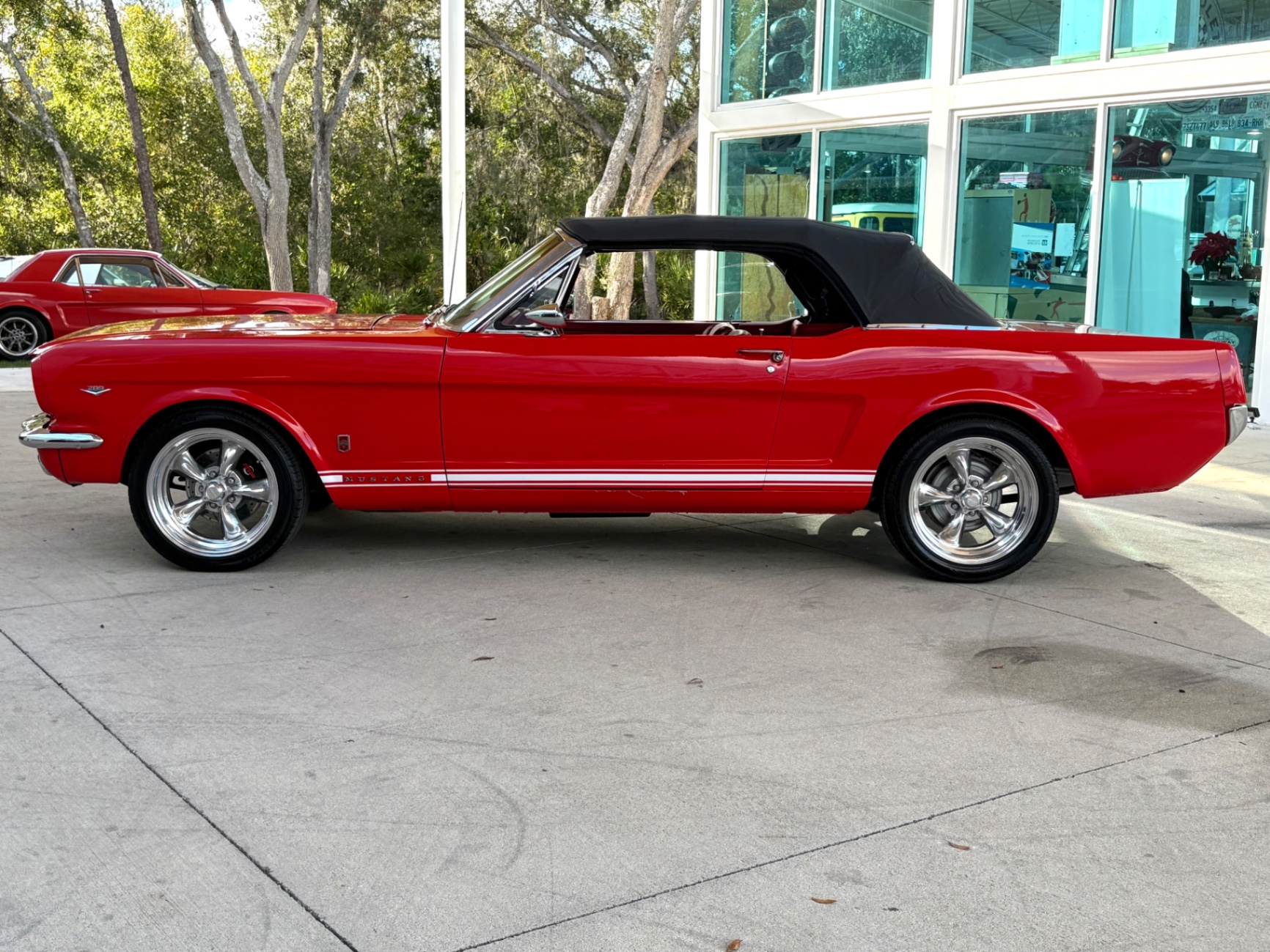 - 289 2-barrel V8 engine - 3-speed C4 "Cruise-O-Matic" automatic transmission - 200 horsepower - New aluminum radiator - New Power Disc Brakes - New tires - Front bucket seats - Red deluxe pony interior - Chrome valve covers - Pleated vinyl upholstery - Factory radio - Power top - Five-dial instrument cluster - Full carpeting - Heater and defroster - Safety-padded instrument panel and sun visors - Floating pony emblem on front grille - Left-hand door outside mirror - Backup lamps - Rocker panel moldings - Front and rear seat belts - Deep-dish steering wheel - Emergency flasher - Freshly painted - Independent coil spring front suspension - Leaf spring rear suspension - 16-gallon gas tank