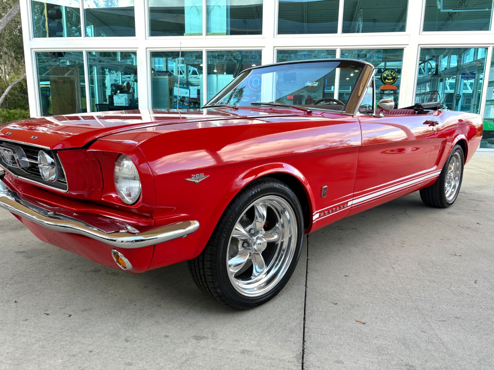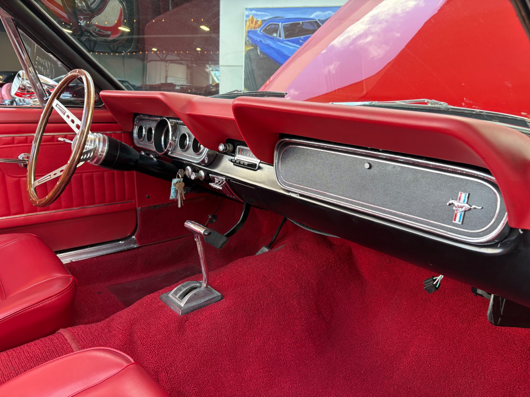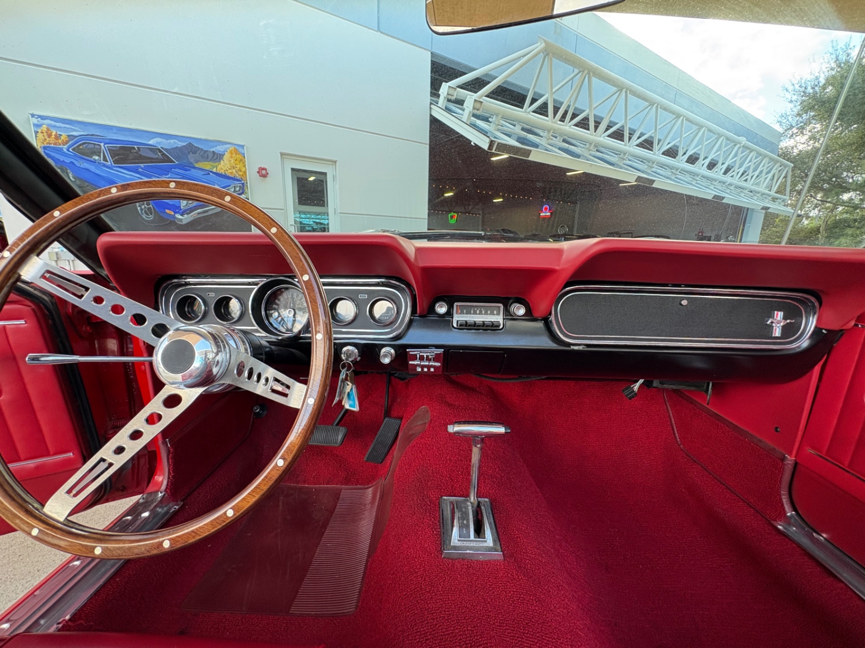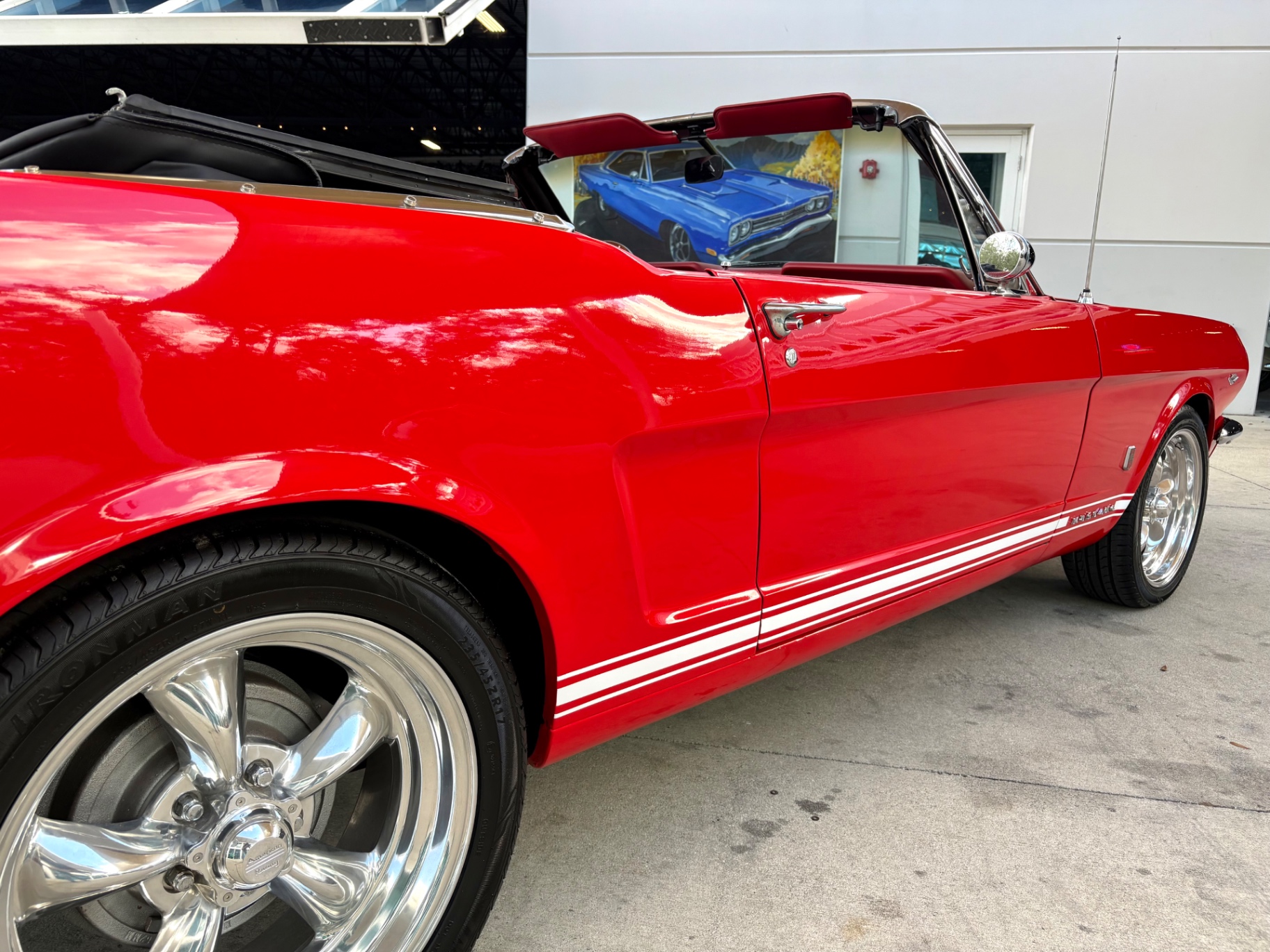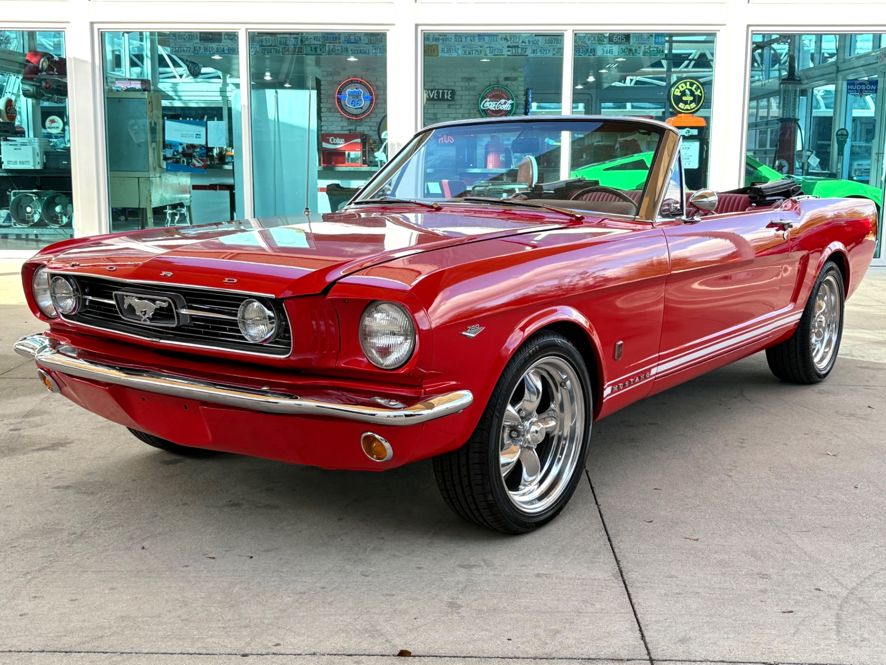 - 289 2-barrel V8 engine - 3-speed C4 "Cruise-O-Matic" automatic transmission - 200 horsepower - New aluminum radiator - New Power Disc Brakes - New tires - Front bucket seats - Red deluxe pony interior - Chrome valve covers - Pleated vinyl upholstery - Factory radio - Power top - Five-dial instrument cluster - Full carpeting - Heater and defroster - Safety-padded instrument panel and sun visors - Floating pony emblem on front grille - Left-hand door outside mirror - Backup lamps - Rocker panel moldings - Front and rear seat belts - Deep-dish steering wheel - Emergency flasher - Freshly painted - Independent coil spring front suspension - Leaf spring rear suspension - 16-gallon gas tank