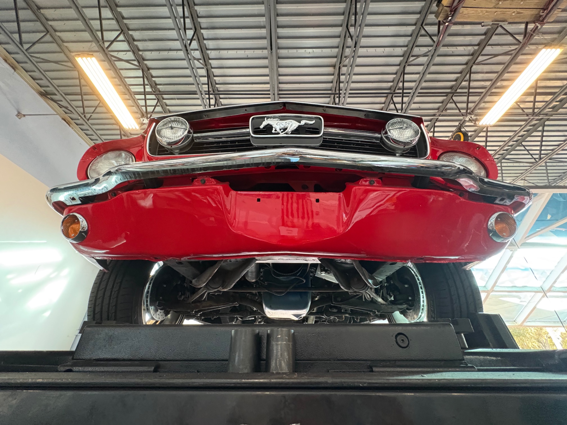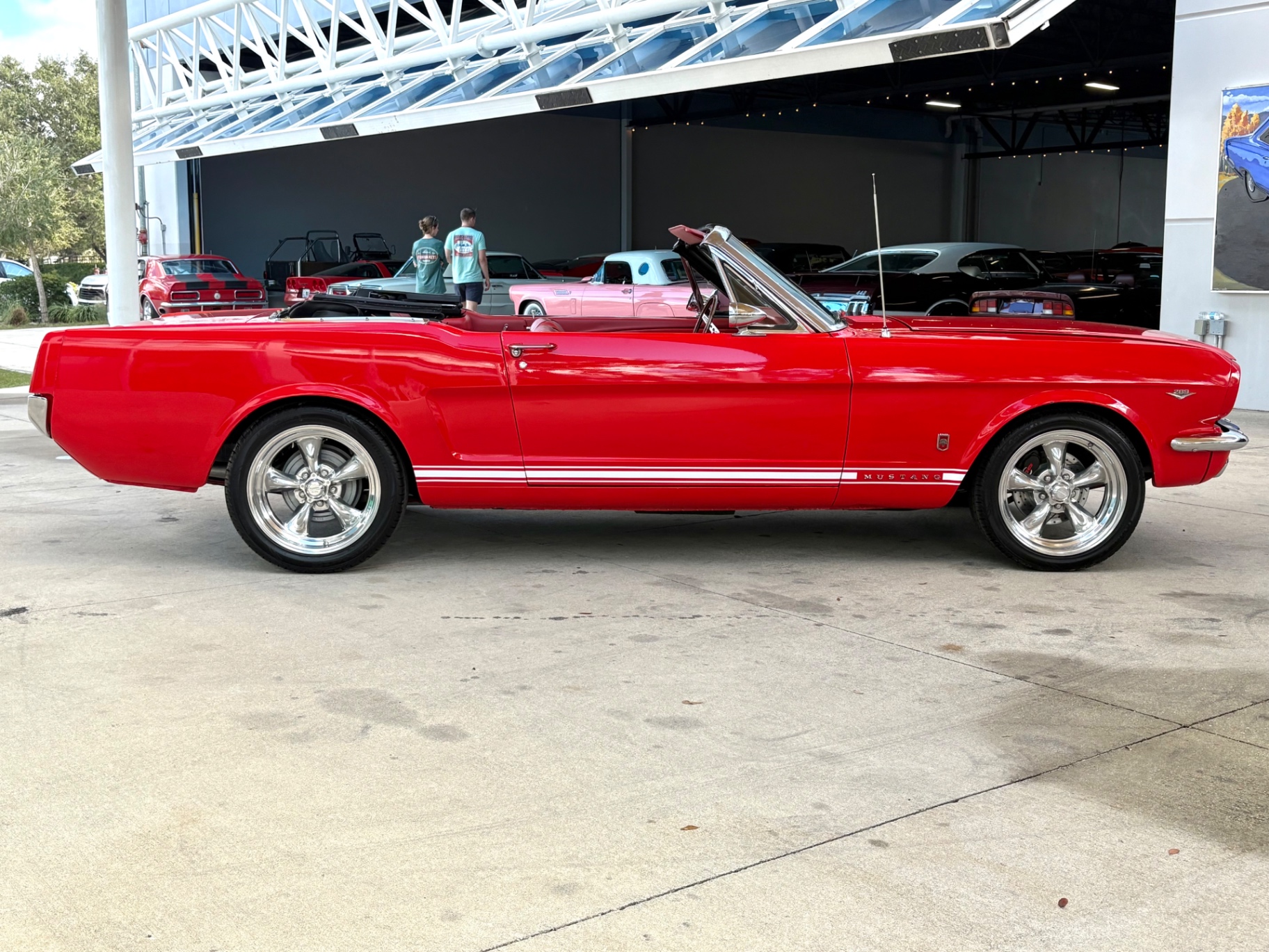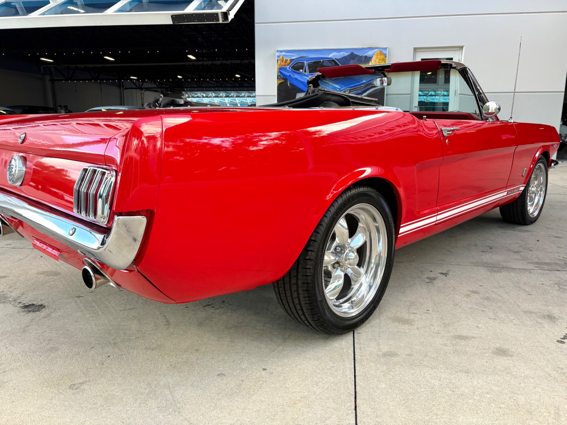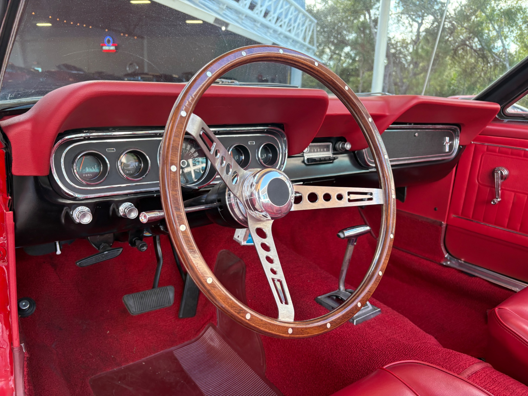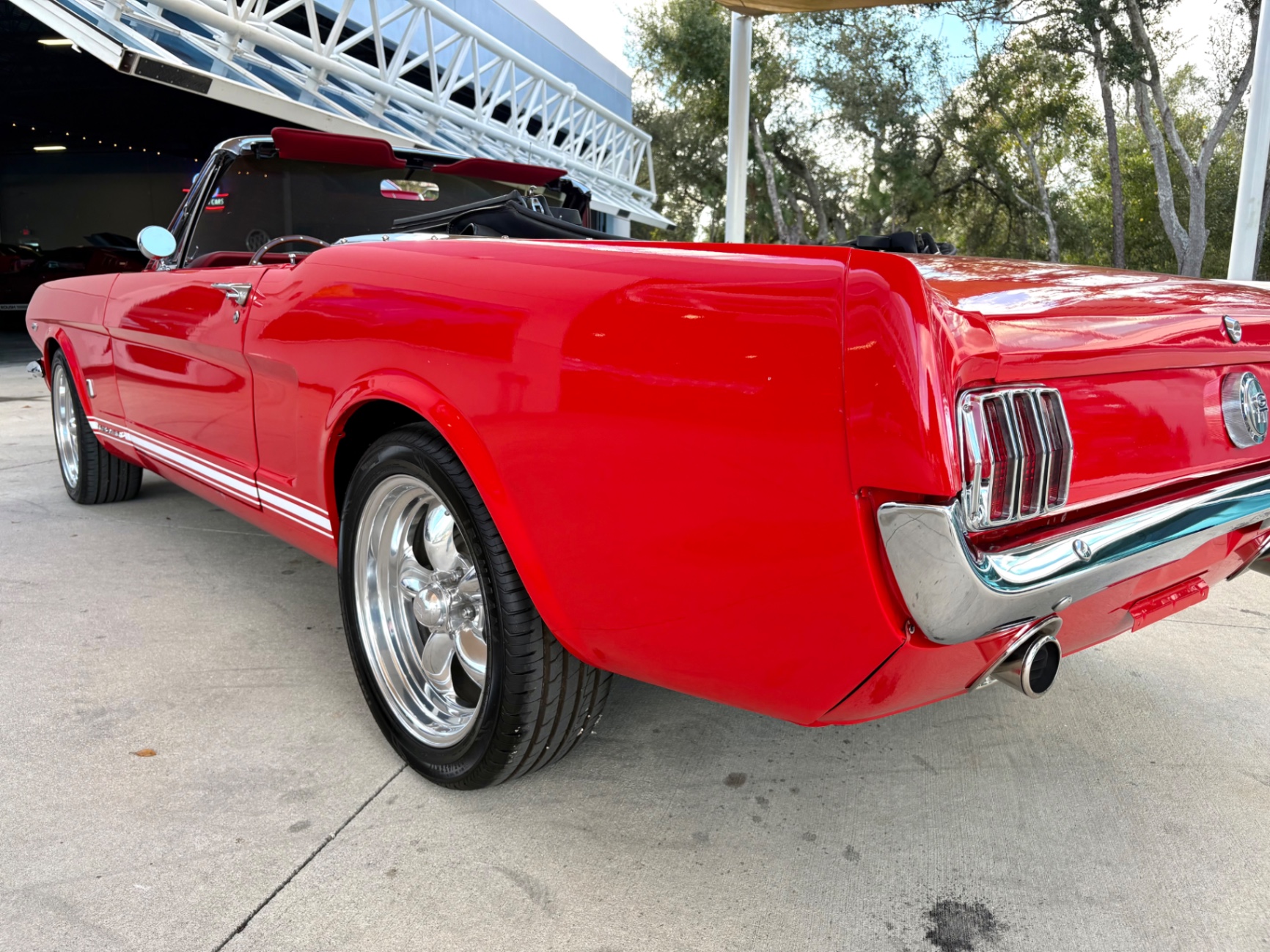 - 289 2-barrel V8 engine - 3-speed C4 "Cruise-O-Matic" automatic transmission - 200 horsepower - New aluminum radiator - New Power Disc Brakes - New tires - Front bucket seats - Red deluxe pony interior - Chrome valve covers - Pleated vinyl upholstery - Factory radio - Power top - Five-dial instrument cluster - Full carpeting - Heater and defroster - Safety-padded instrument panel and sun visors - Floating pony emblem on front grille - Left-hand door outside mirror - Backup lamps - Rocker panel moldings - Front and rear seat belts - Deep-dish steering wheel - Emergency flasher - Freshly painted - Independent coil spring front suspension - Leaf spring rear suspension - 16-gallon gas tank