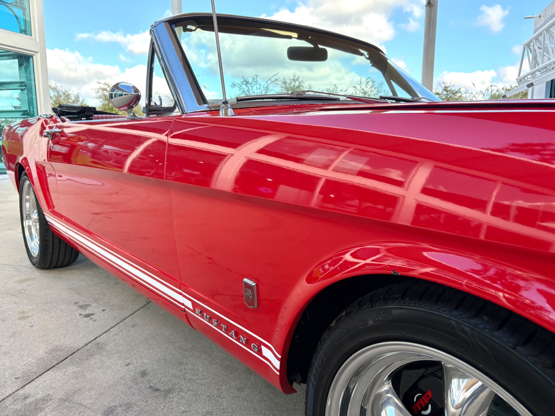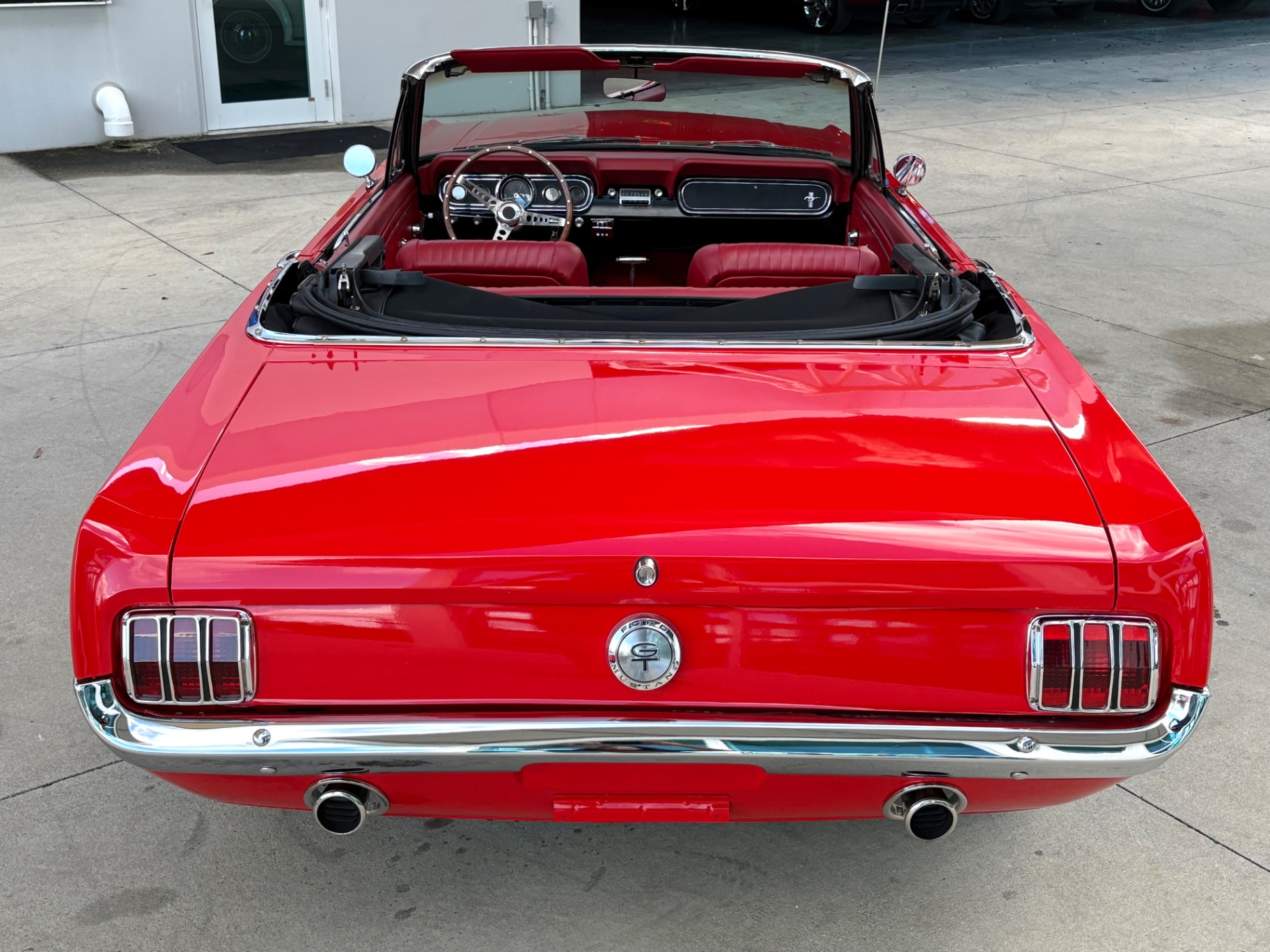 The exterior of this 1966 Mustang shines in a vibrant red, freshly painted to mirror its original allure. Its iconic Mustang floating pony emblem adorns the front grille, complemented by chrome accents and valve covers that enhance its vintage appeal. New tires mounted on stylish rims, backup lamps, and thoughtful details like the left-hand door outside mirror and rocker panel moldings contribute to its pristine appearance.