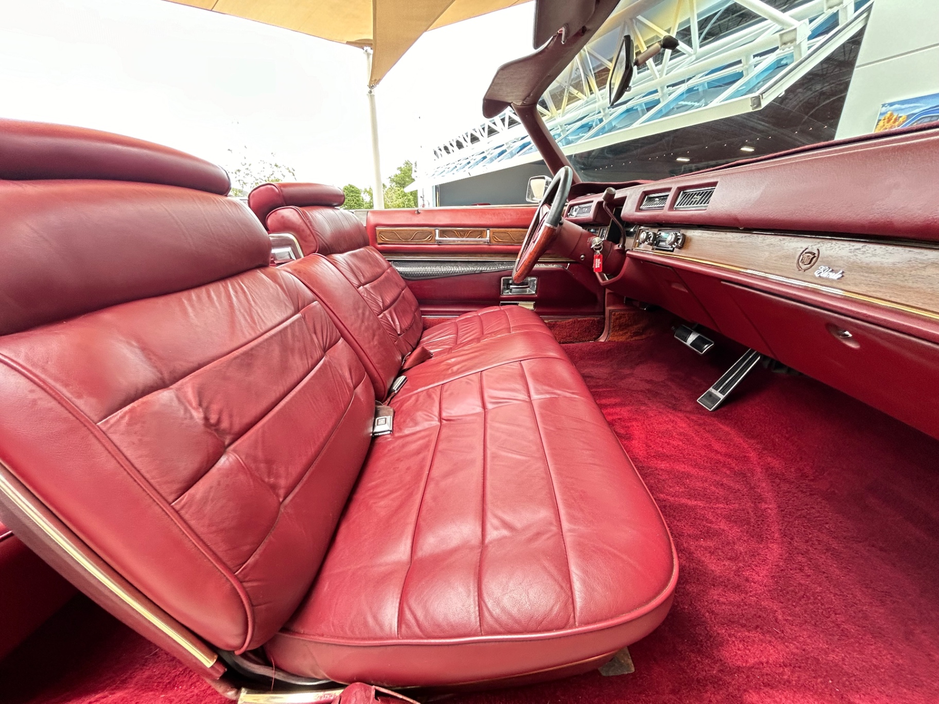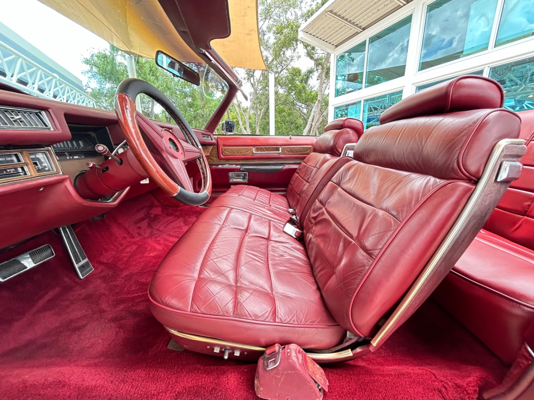 Our Eldo is loaded with features and options including the interior that has a plush split power front bench seat divided by the pull-down center arm rests in red tan soft leather upholstery, AM/FM Radio, Air Conditioning, Defrost, Heat, Power black Convertible Top, Power Locks, Power Seats, Power Windows, Seatbelts, Tilt Wheel, Cruise Control, factory steering wheel, fiber-optic lamp monitors, power trunk, full-sized spare, and carpeting.