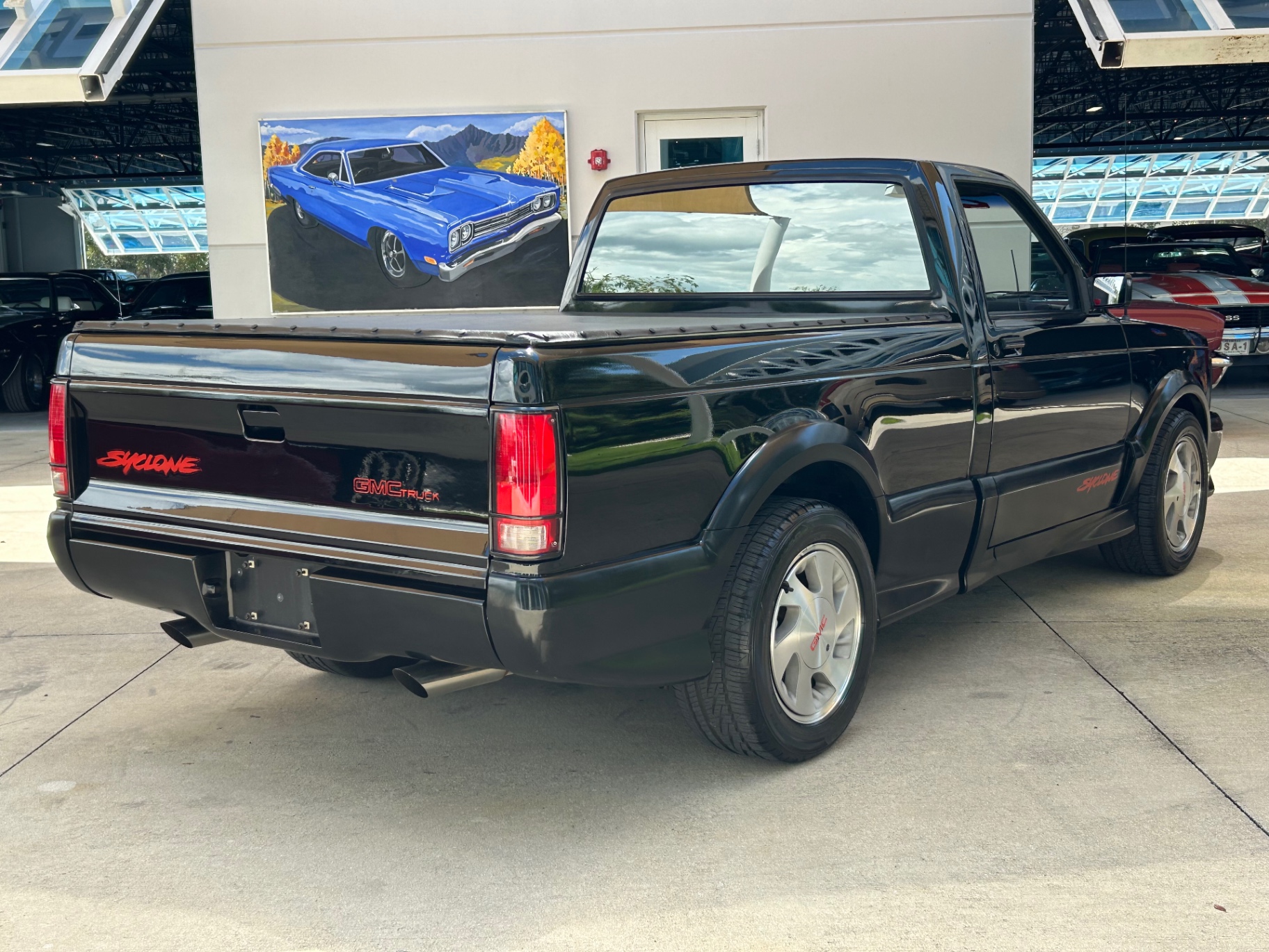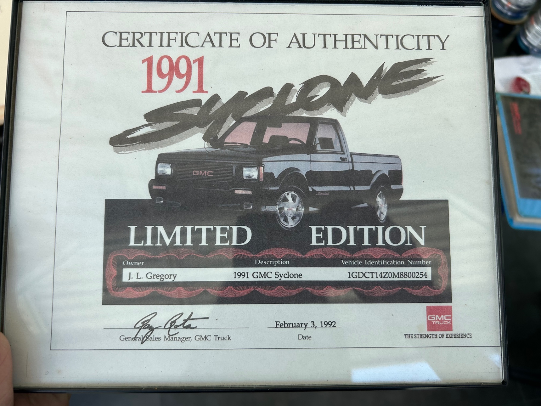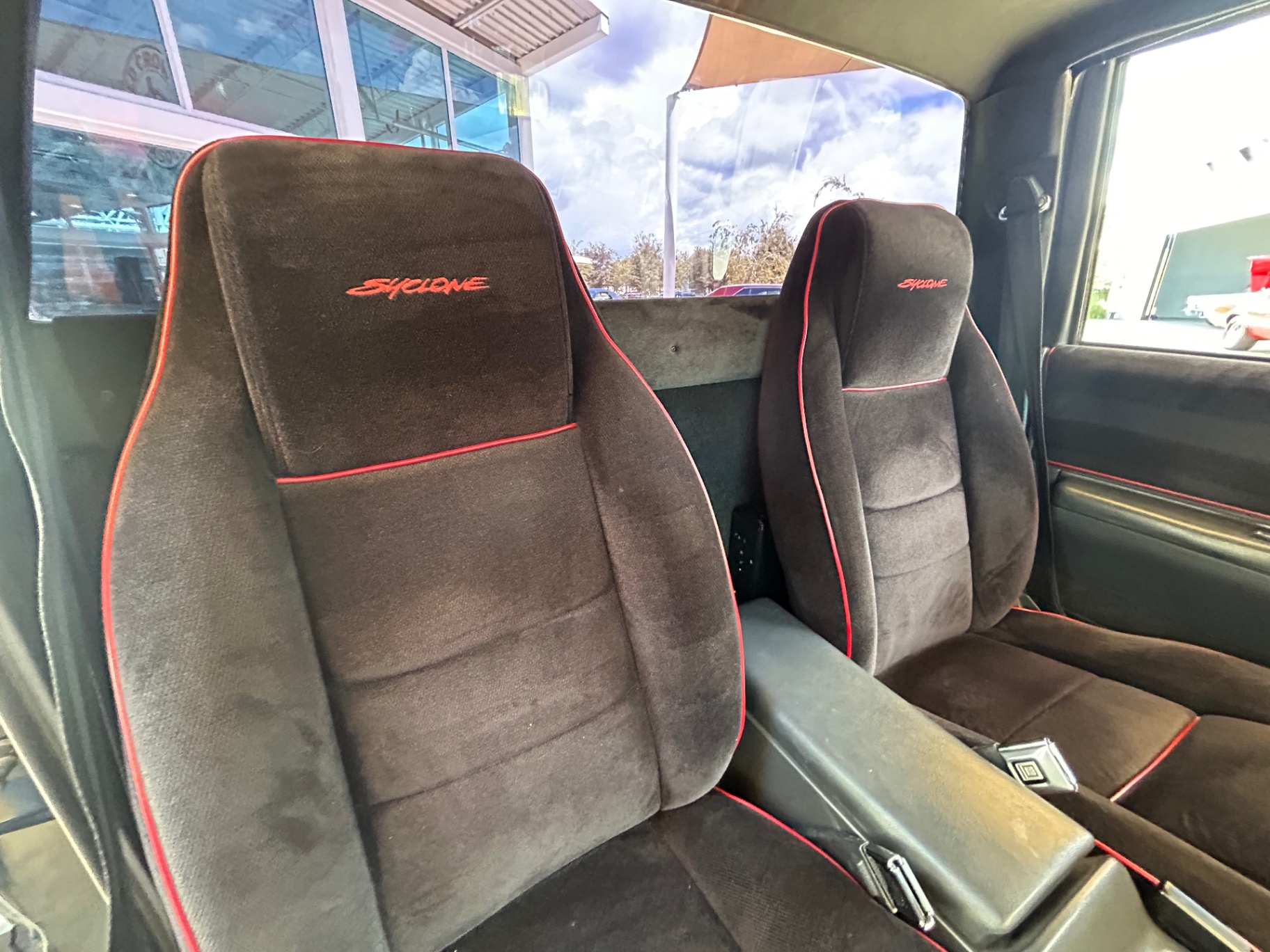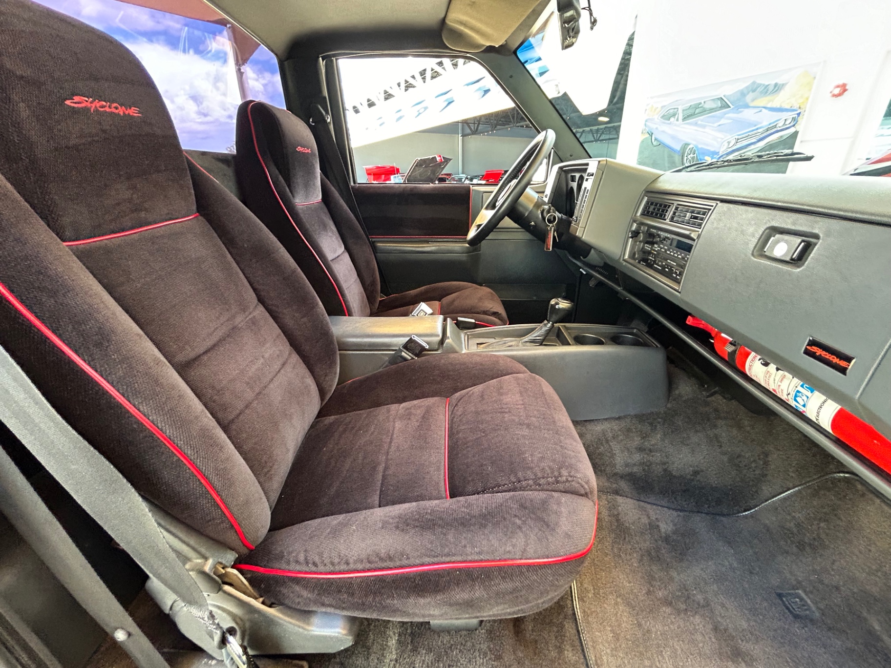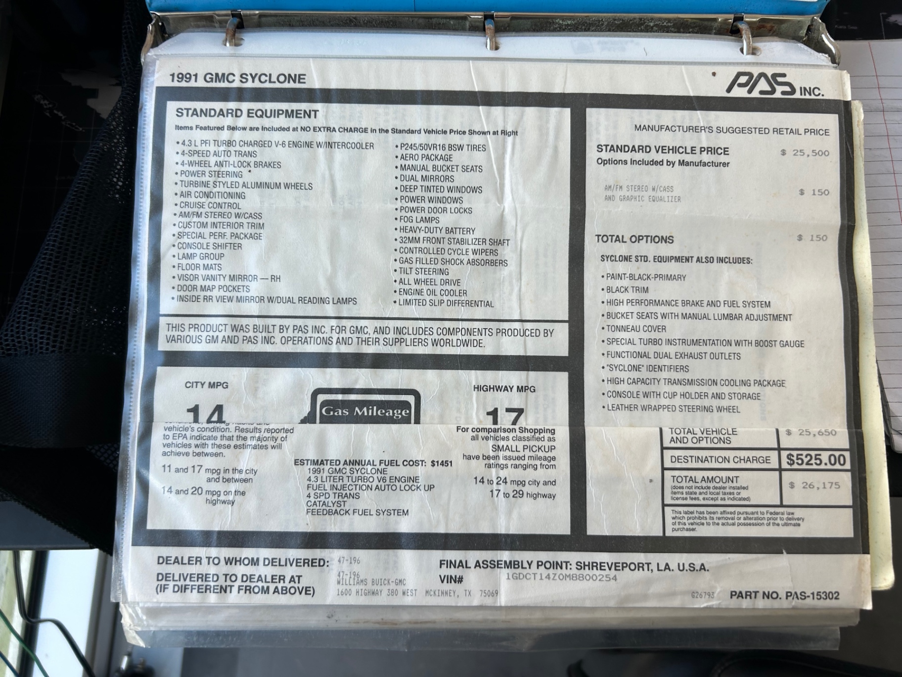 4.3-liter V6 engine that produced 280 horsepower and 350 lb-ft of torque Could go from 0 to 60 mph in 4.3 seconds and beat a Ferrari 348ts in a quarter mile Unique intake and exhaust manifolds Dual-bore throttle body Multiport EFI Lower-compression pistons Special intake and exhaust manifolds Water-to-air-intercooled Mitsubishi TD06-17C turbocharger Power Steering All Wheel Drive 4-wheel Anti-Lock brakes Limited Slip Air Conditioning 4-speed automatic transmission BorgWarner transfer case Factory stock interior has cloth manual-lumbar bucket seats with red piping Similarly colored accents on the door panels Factory dash and gauges Cruise control AM/FM/Stereo with Cassette Lamp Group Center console with the automatic shifter Power Windows, Power door locks Tinted windows Tilt steering wheel Appears as original as it was when new and has black carpeting and headliner Black stealthy slick paint Sits low to the ground Aero Package Dual mirrors Fog lamps Black vinyl tonneau cover Dual exhaust Syclone badging Factory aluminum mag wheels Black sidewall tires Original Window Sticker Tons of documents Original Cap and Jacket that came with it when it was new
