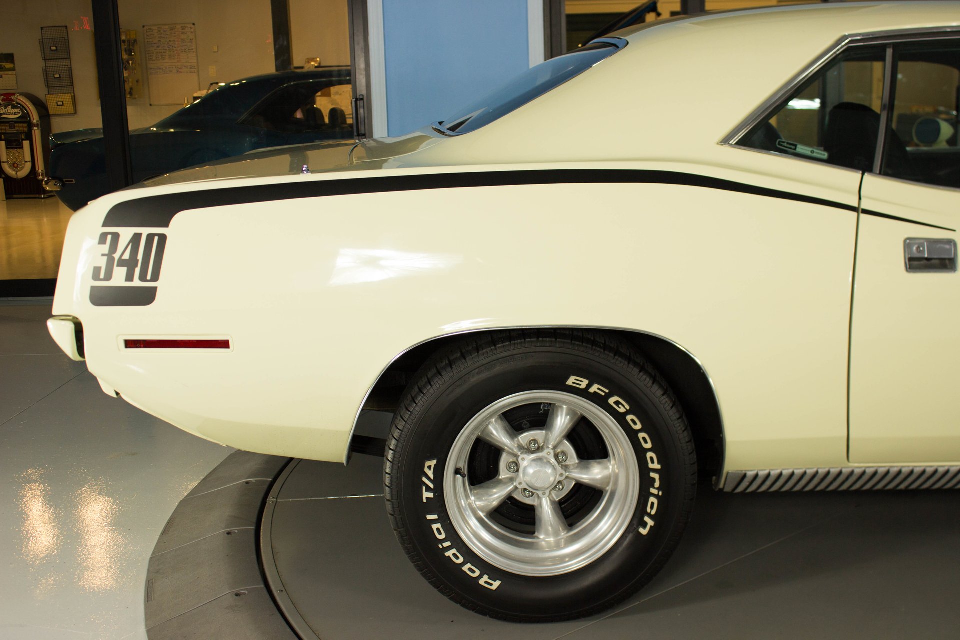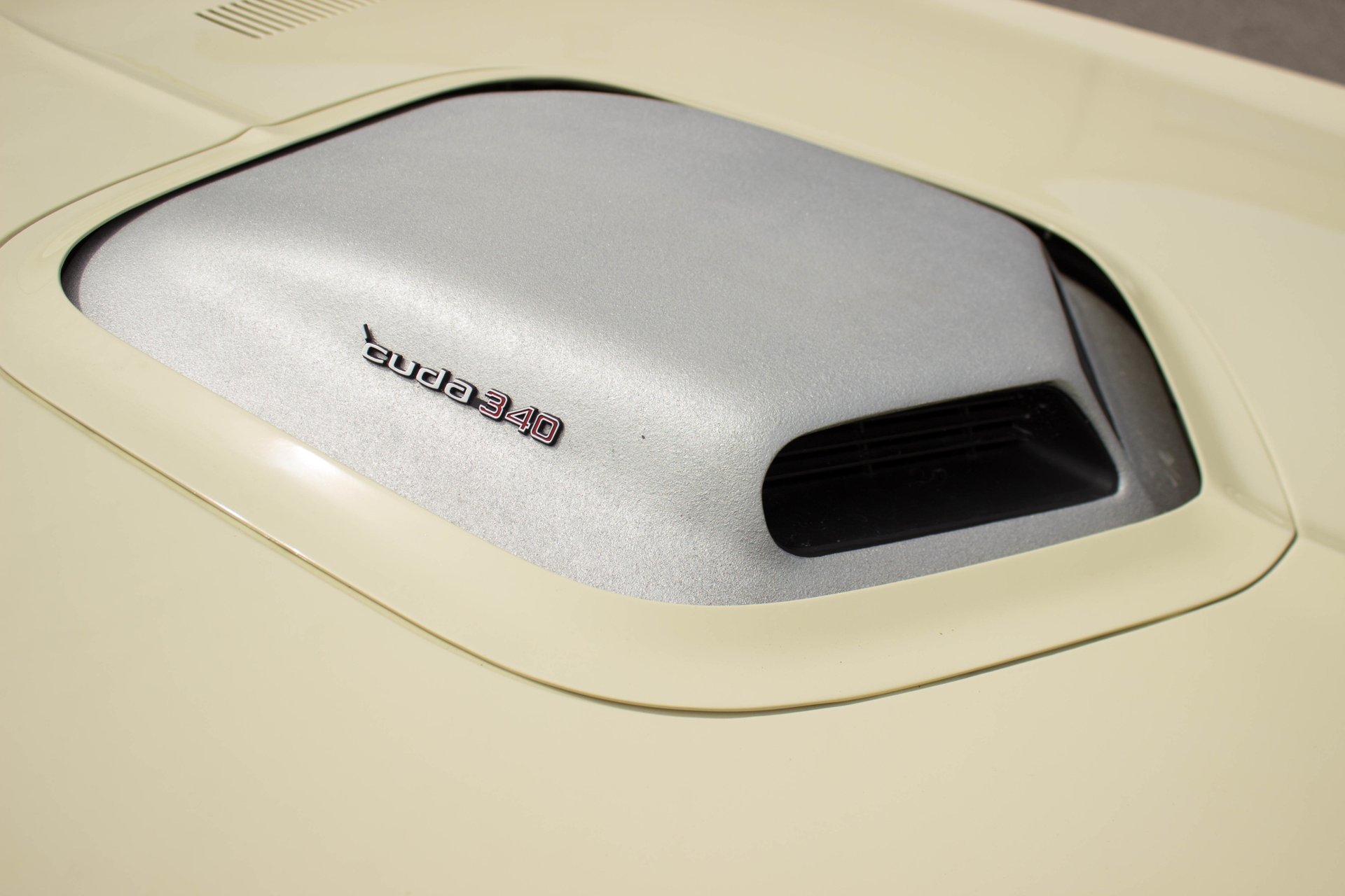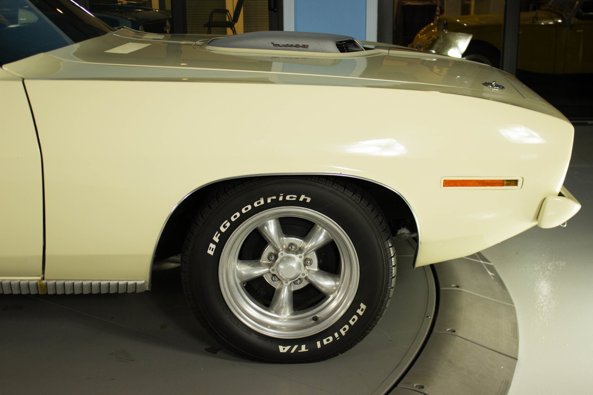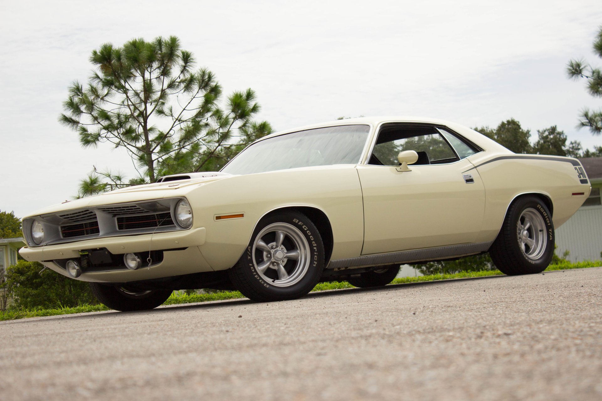 Cream paint with black ¼ panel stripes denoting the 340 engine really make this car pop. American Racing Torque Thrust wheels are wrapped in BF Goodrich Radial T/A tires for a modern touch. Fog lights accent the front end while providing additional lighting for night time and poor weather driving. These Cudas are low and long and have all the right curves.