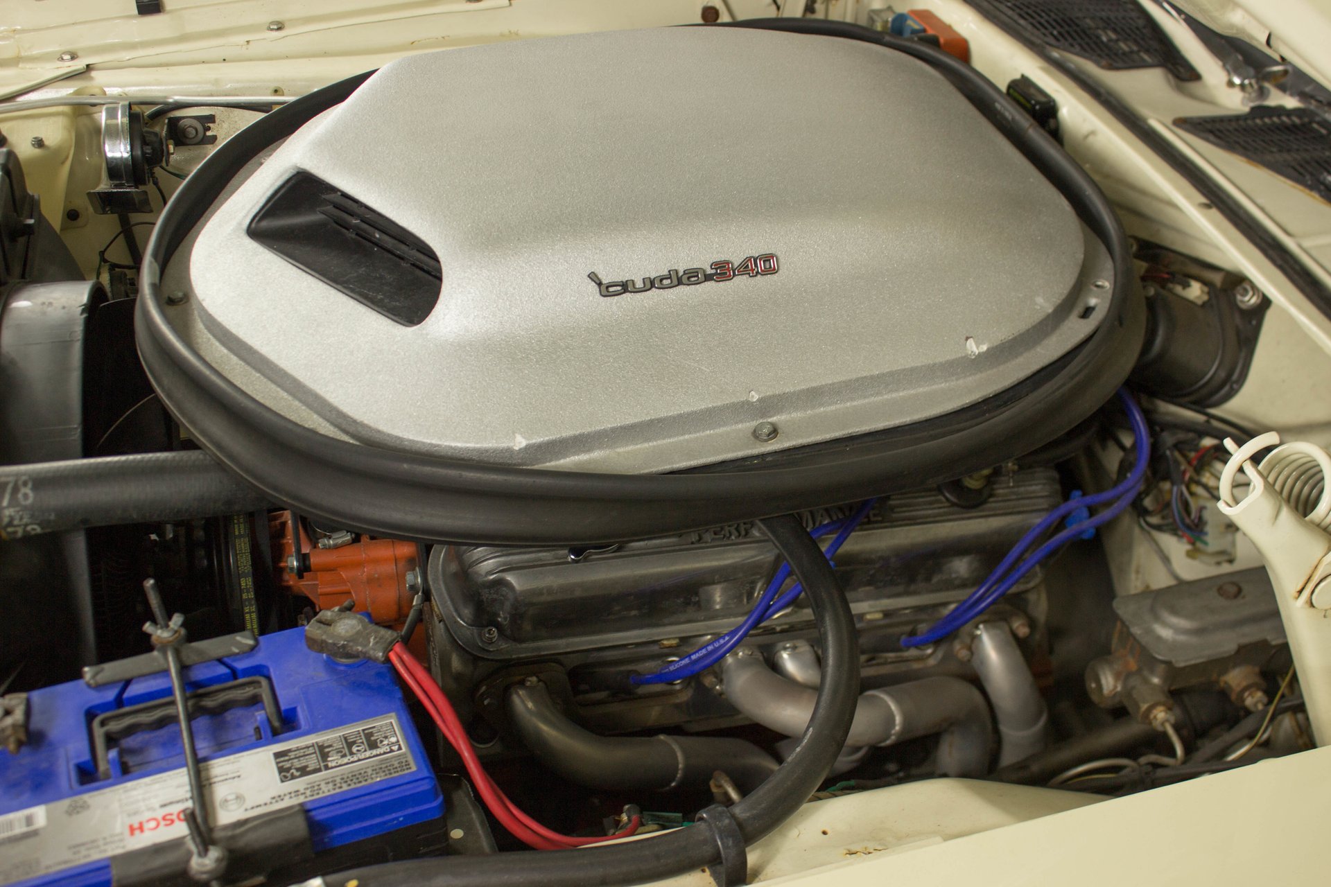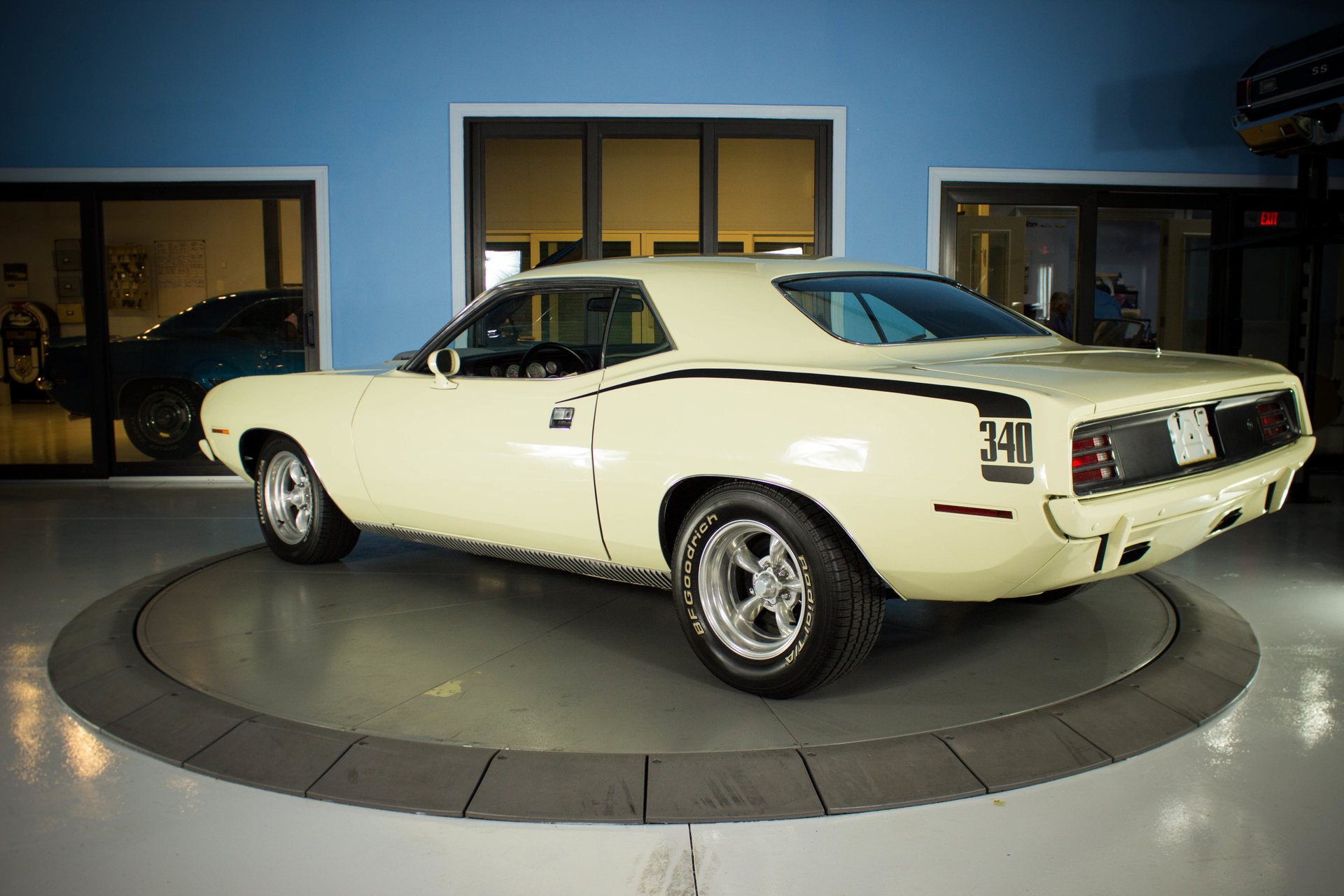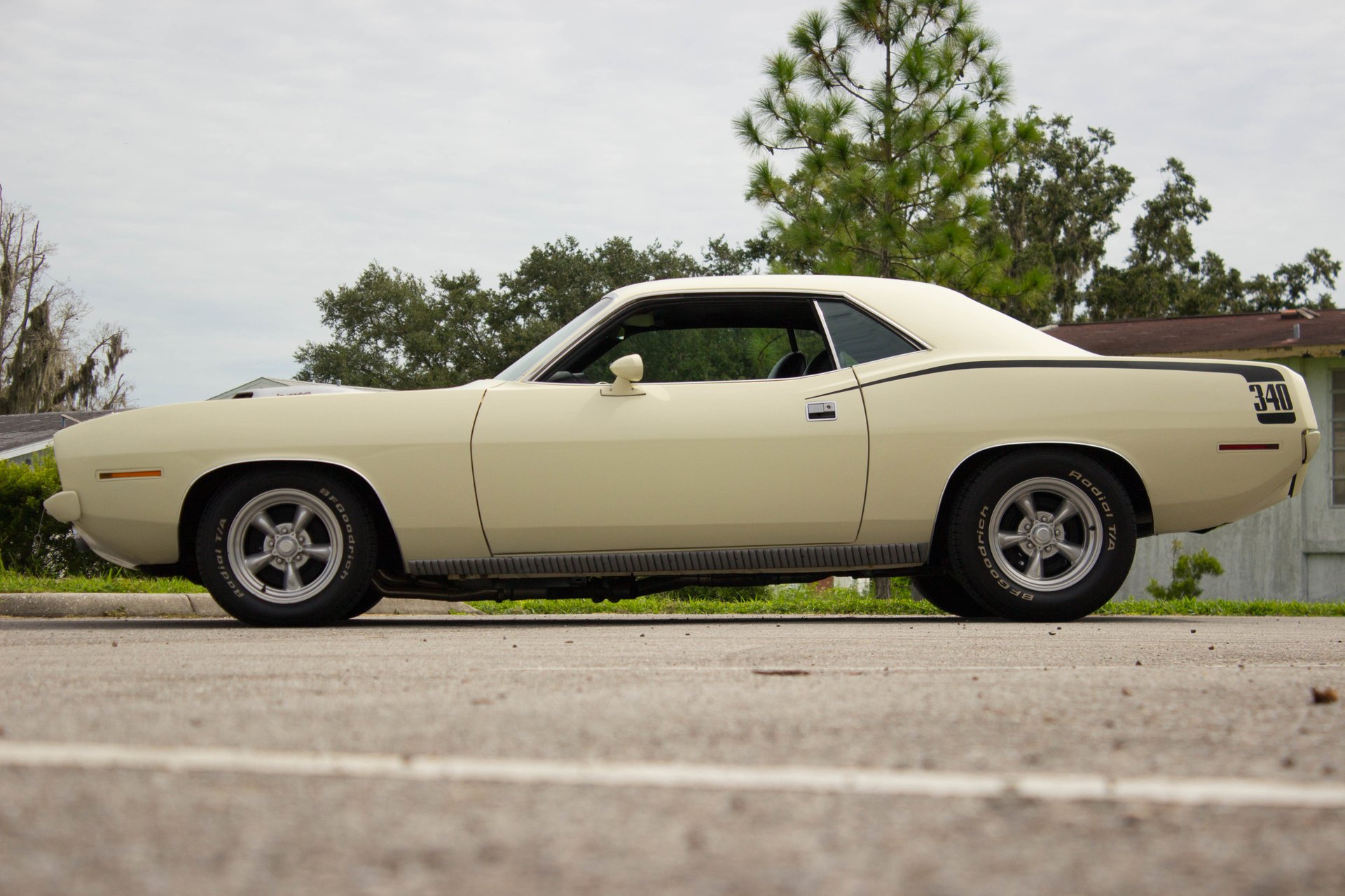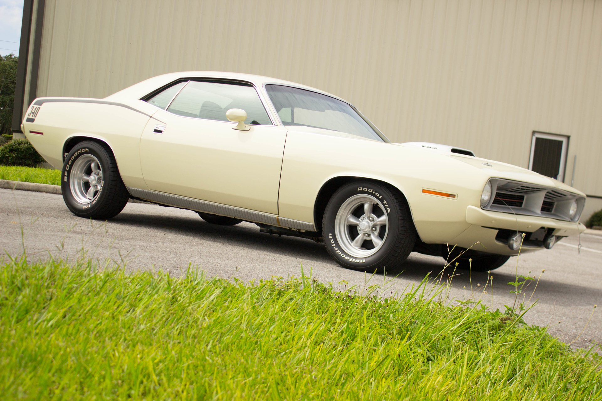 Cream paint with black ¼ panel stripes denoting the 340 engine really make this car pop. American Racing Torque Thrust wheels are wrapped in BF Goodrich Radial T/A tires for a modern touch. Fog lights accent the front end while providing additional lighting for night time and poor weather driving. These Cudas are low and long and have all the right curves.