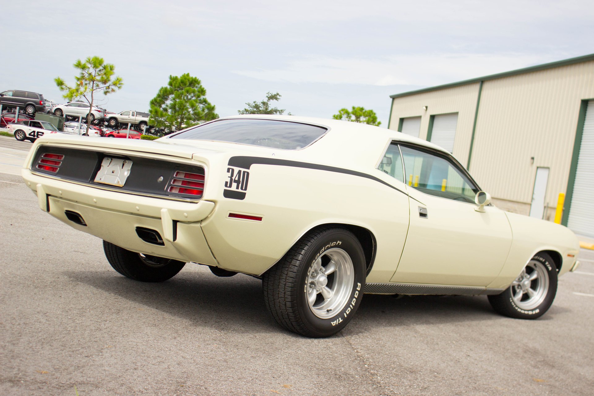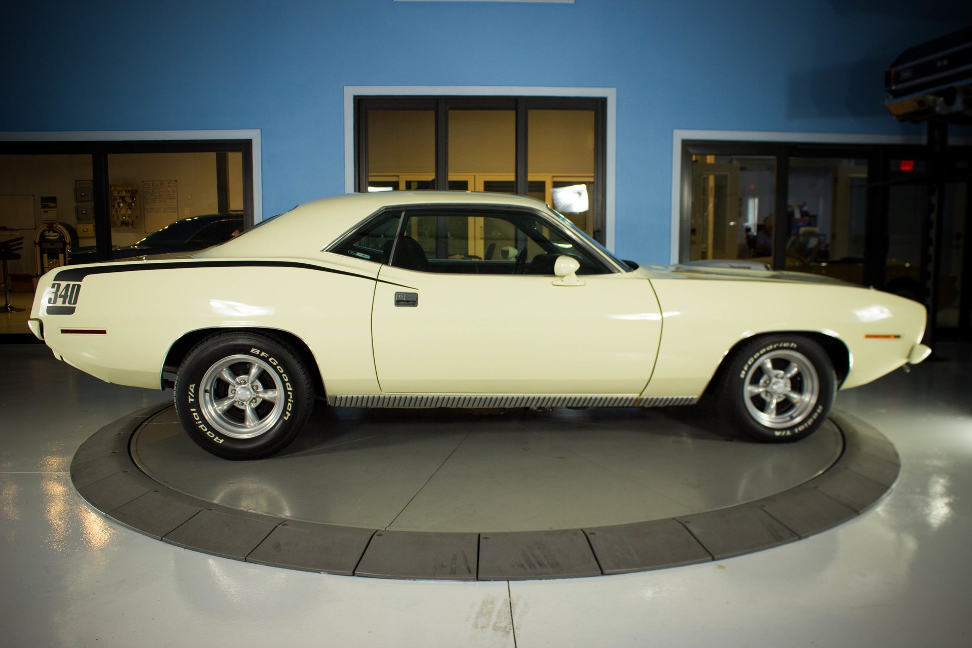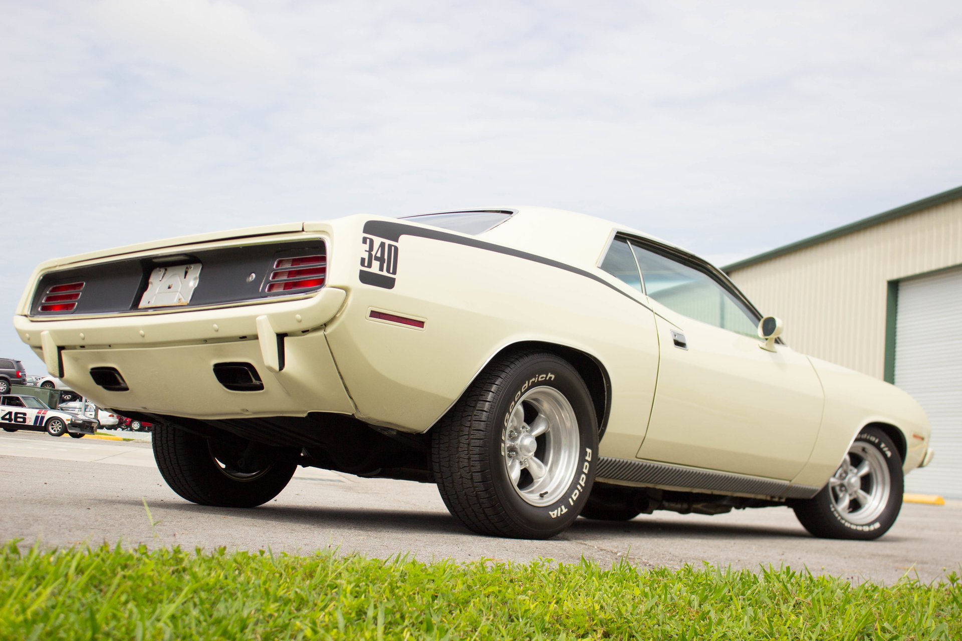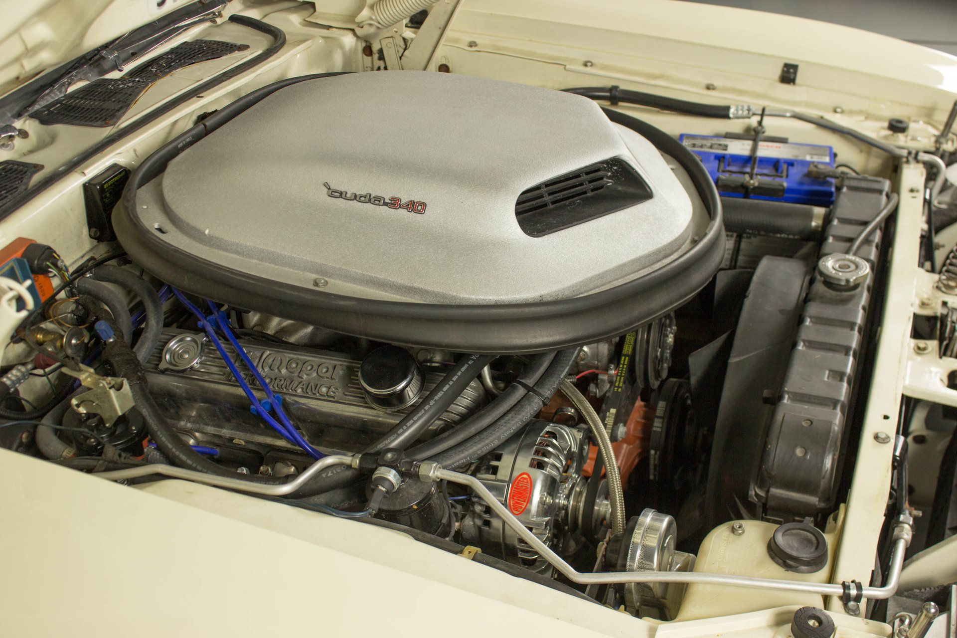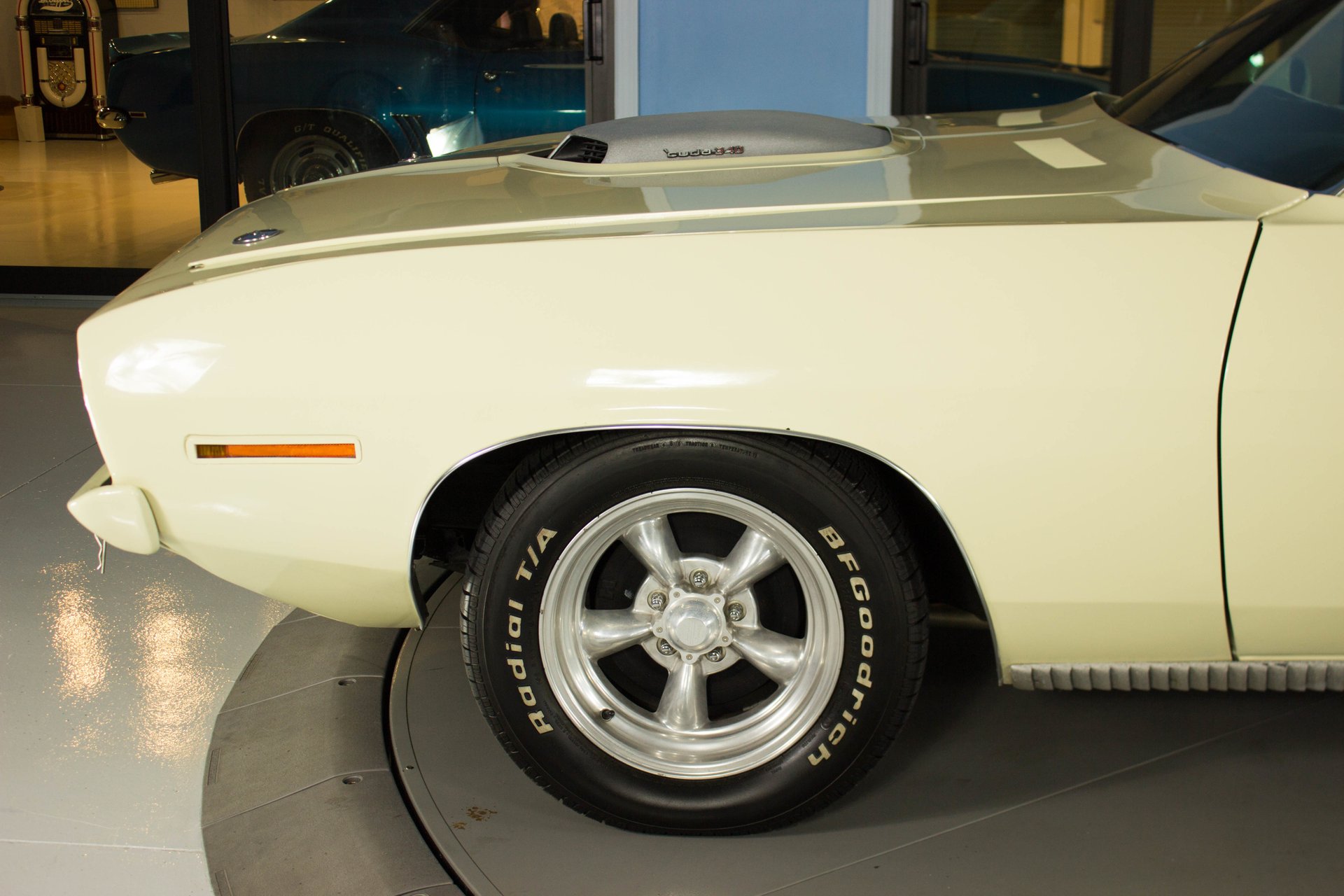 Cream paint with black ¼ panel stripes denoting the 340 engine really make this car pop. American Racing Torque Thrust wheels are wrapped in BF Goodrich Radial T/A tires for a modern touch. Fog lights accent the front end while providing additional lighting for night time and poor weather driving. These Cudas are low and long and have all the right curves.