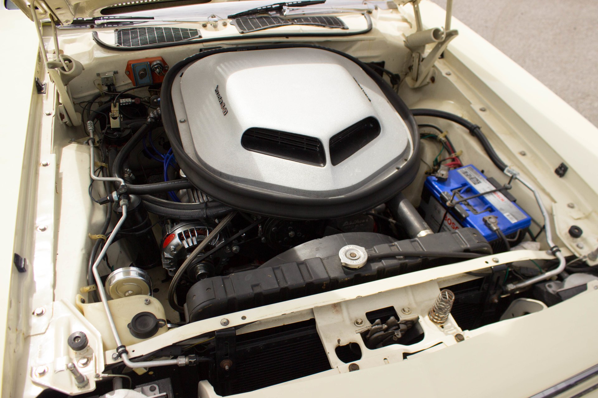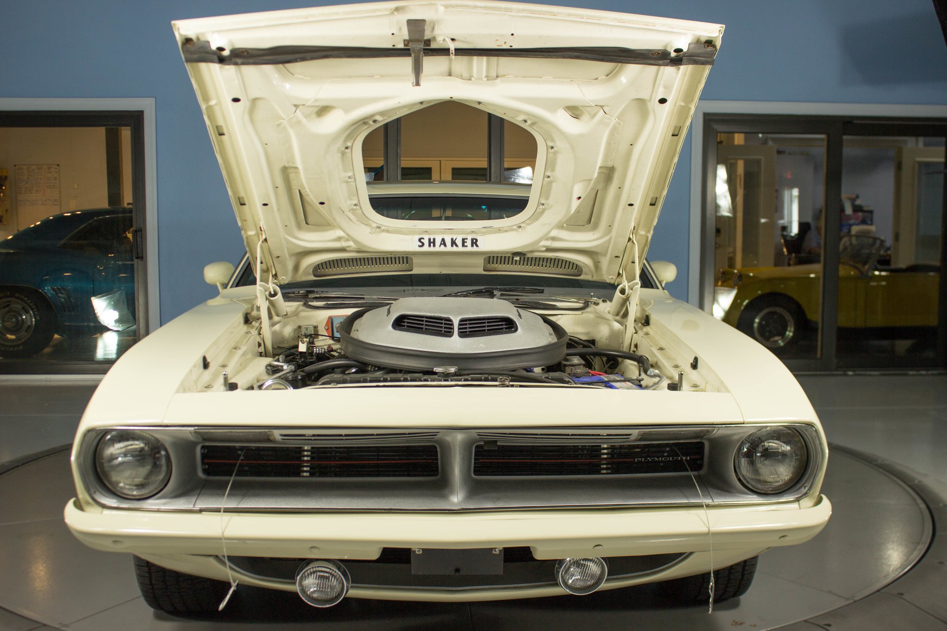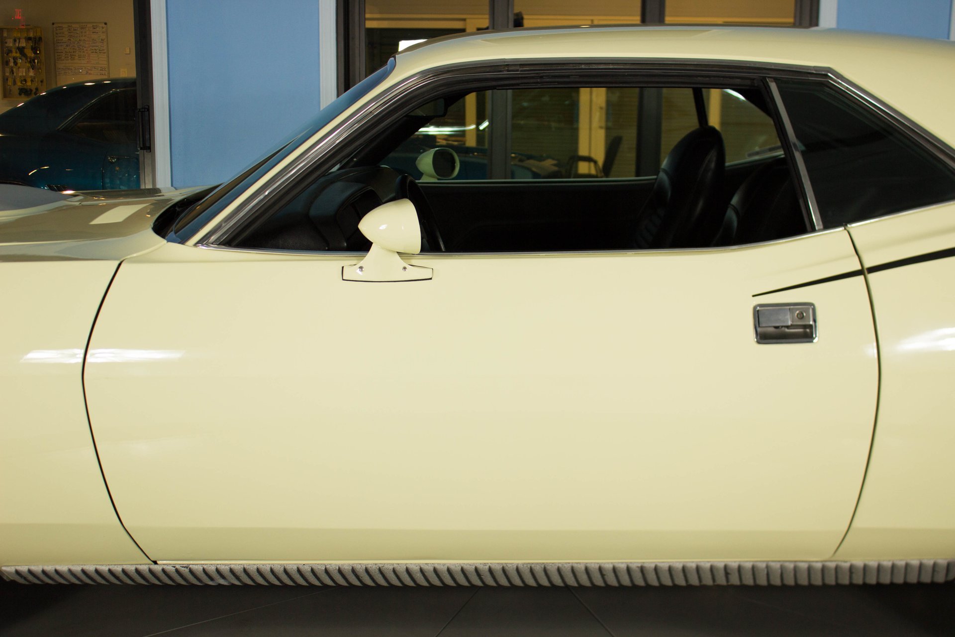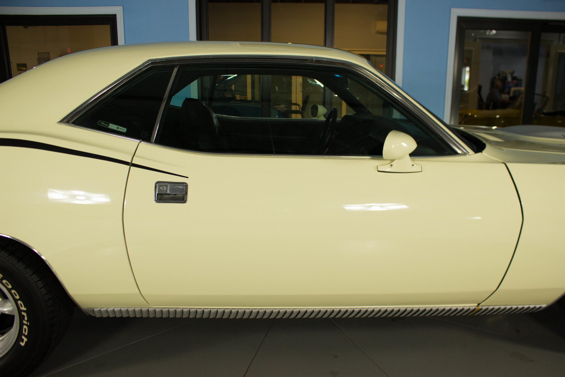Cream paint with black ¼ panel stripes denoting the 340 engine really make this car pop. American Racing Torque Thrust wheels are wrapped in BF Goodrich Radial T/A tires for a modern touch. Fog lights accent the front end while providing additional lighting for night time and poor weather driving. These Cudas are low and long and have all the right curves.