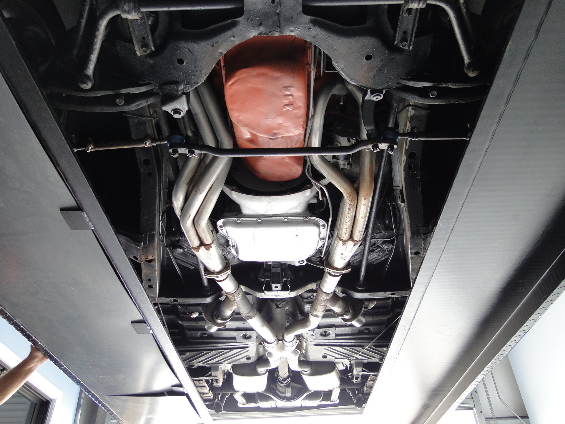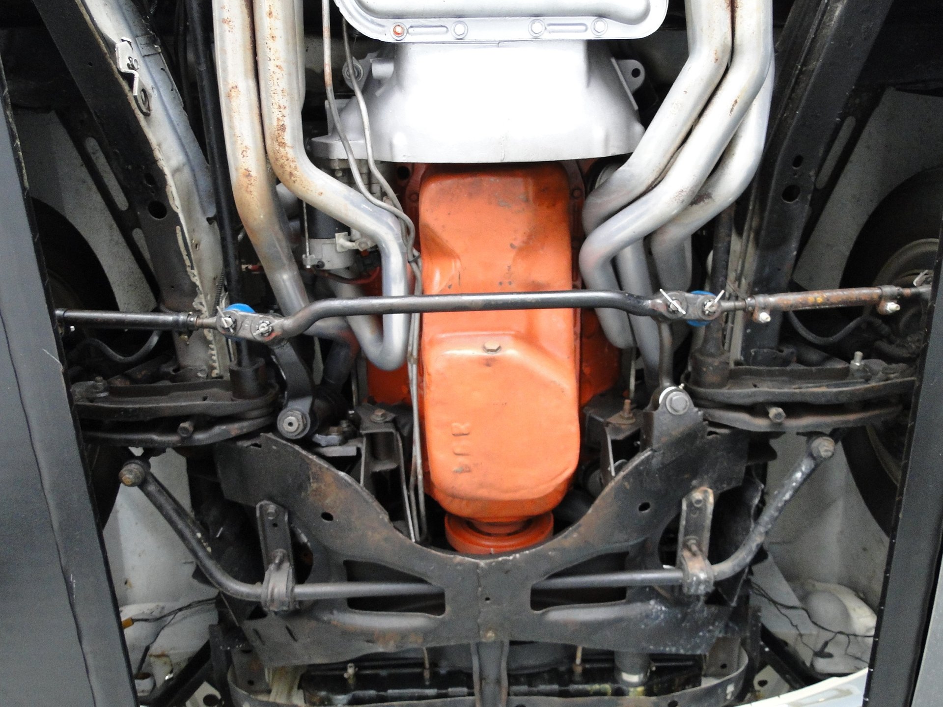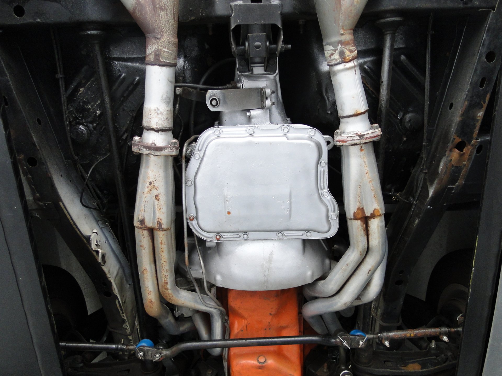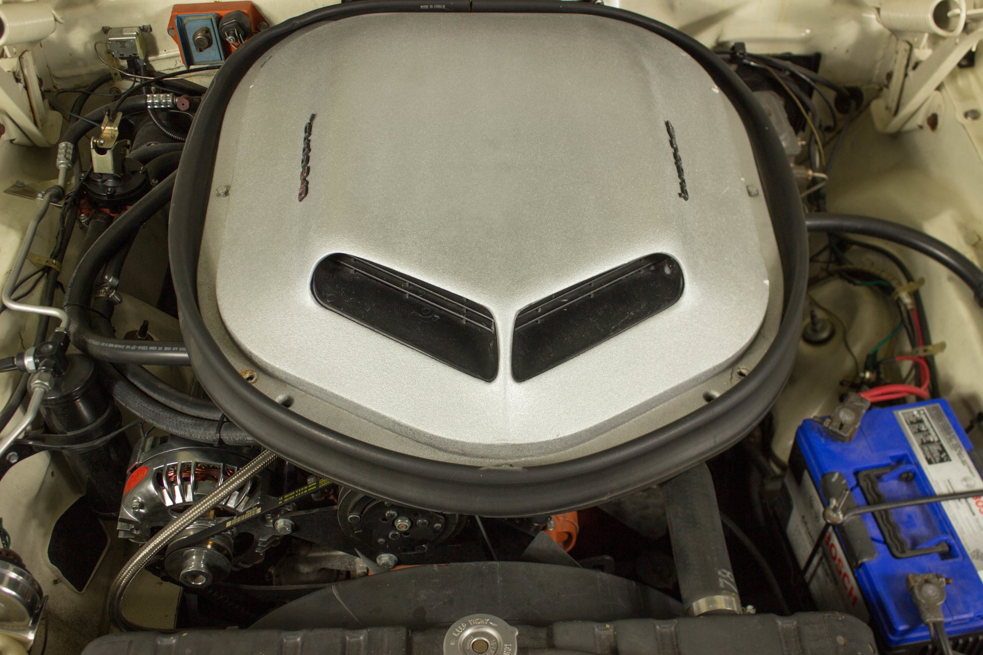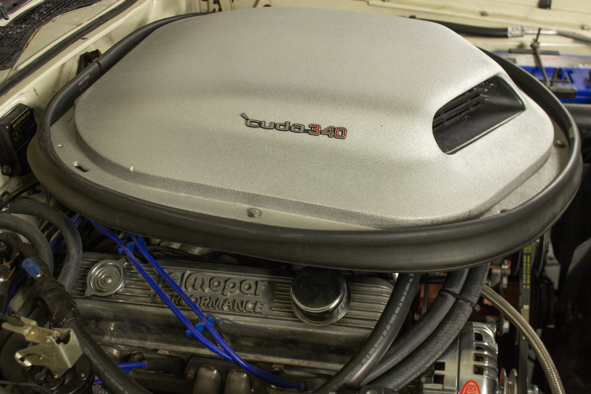 340 cubic inches of Mopar power has been built with Edelbrock Performer RPM aluminum heads, full length ceramic coated headers, Edelbrock Air Gap intake, Quick Fuel Technologies 4-barrel carburetor and topped off with the infamous Shaker hood scoop. This thing not only looks bad ass, but it is functional. It send that air that is rushing across your hood right into the intake for additional horsepower and a cooler air temperature. They call it a shaker for a reason, it shakes with the engine as that cam lopes over.