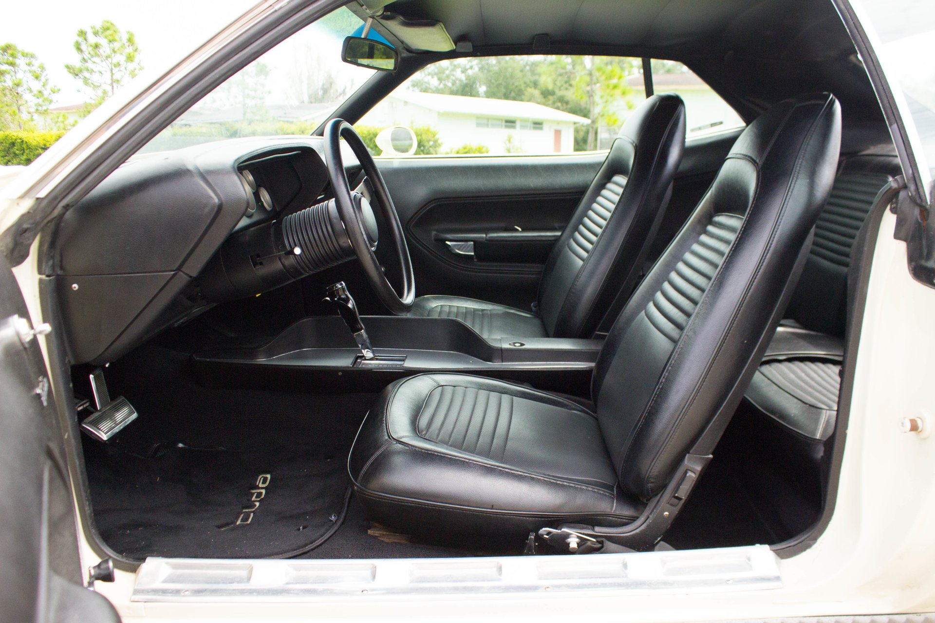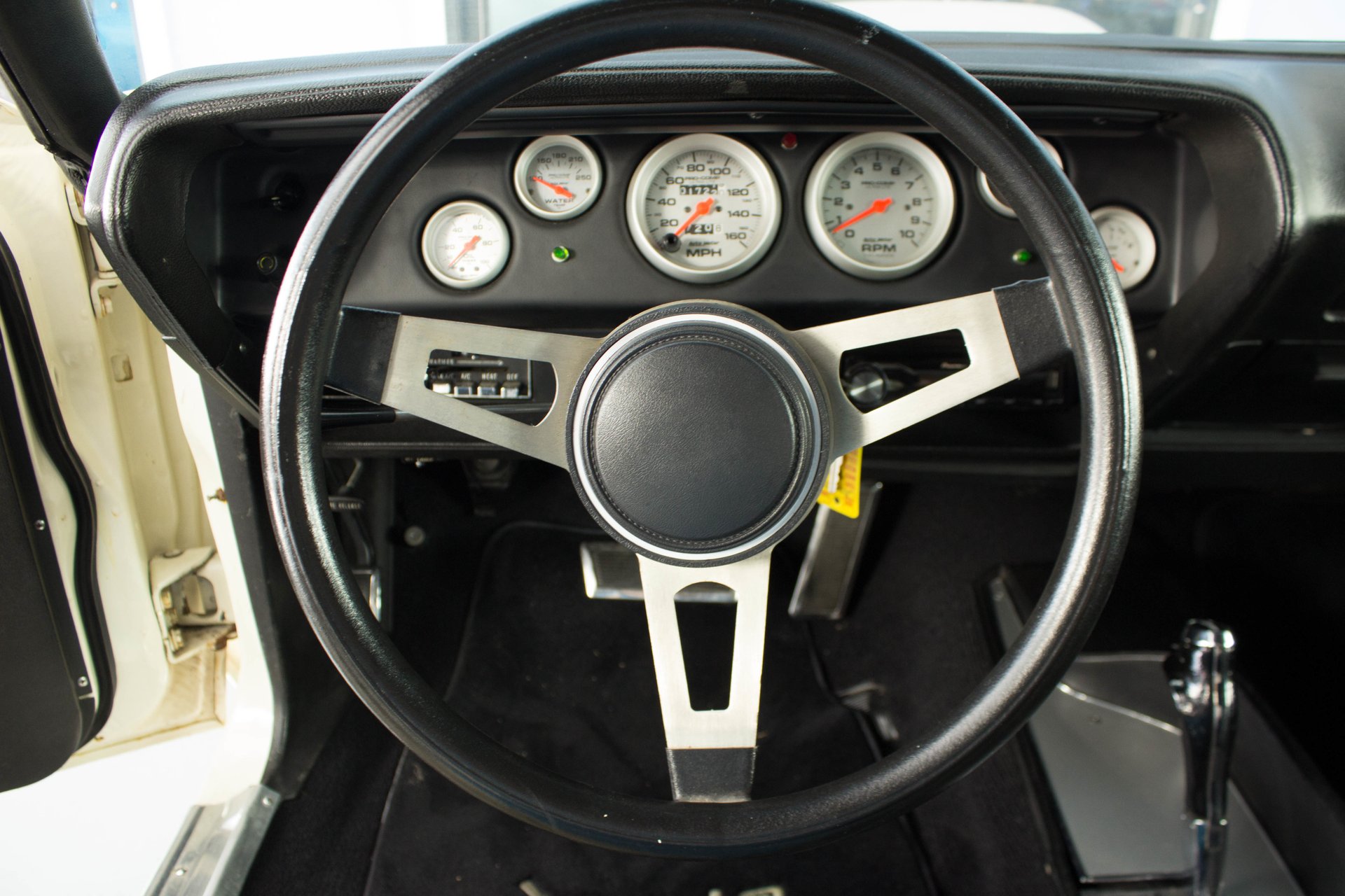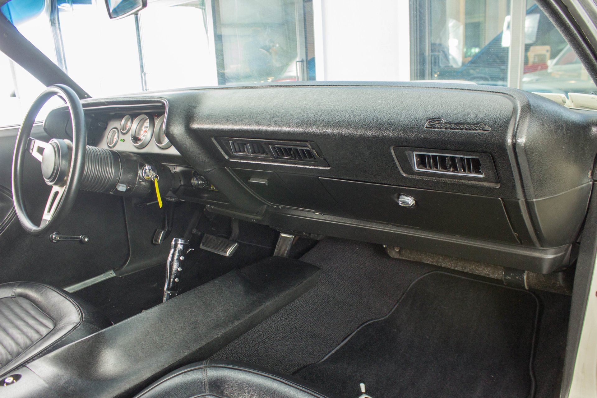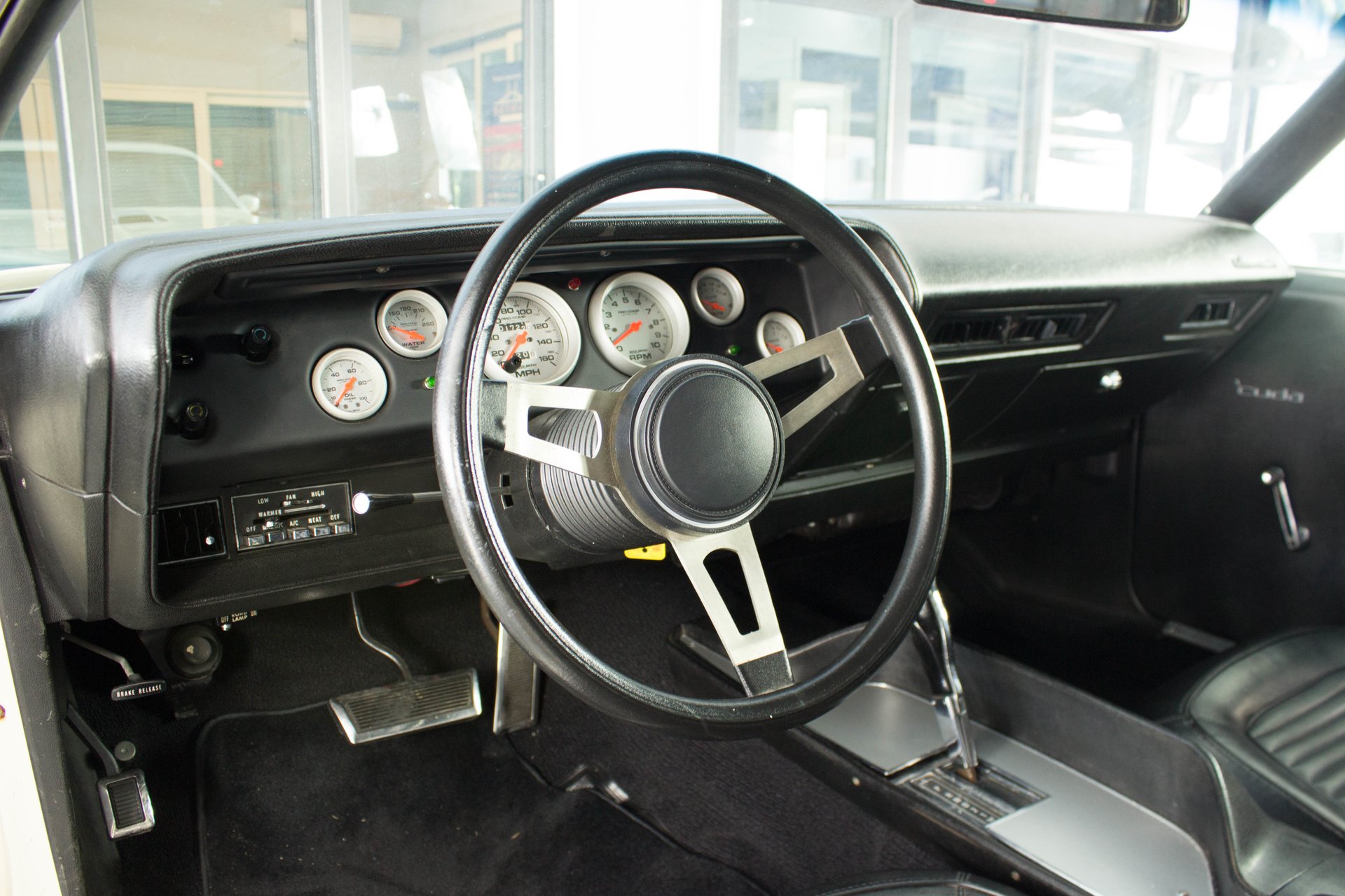 Black bucket seats and a center console are topped off with a cool Pistol Grip shifter. Everyone knows the Pistol Grip is a must have in a Mopar Muscle car, and this one has it despite being an automatic transmission. The gauges have been swapped out with modern Auto Meter gauges and a new AM/FM/CD/USB player has been installed cleanly in the dash. This Cuda has a modern A/C system to keep you cool on those hot summer cruise nights.