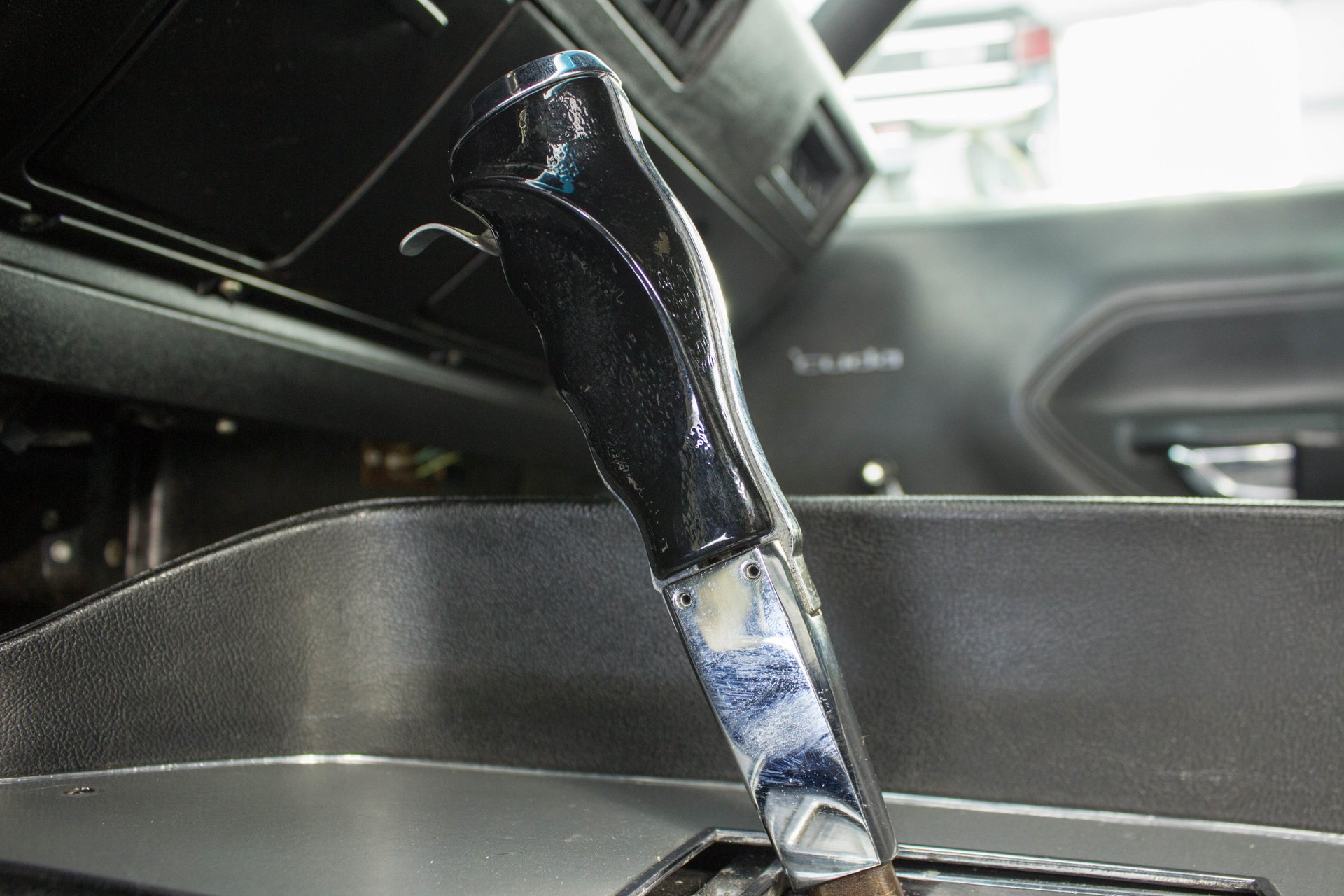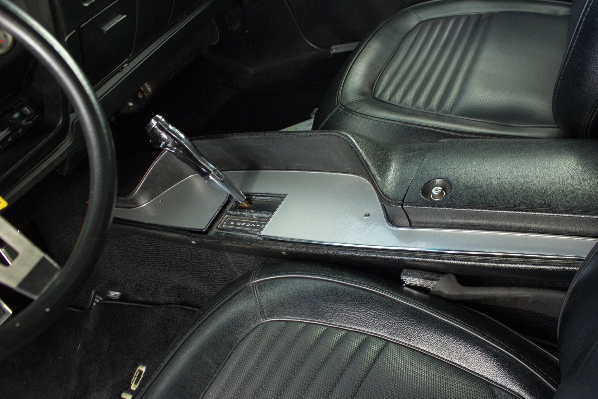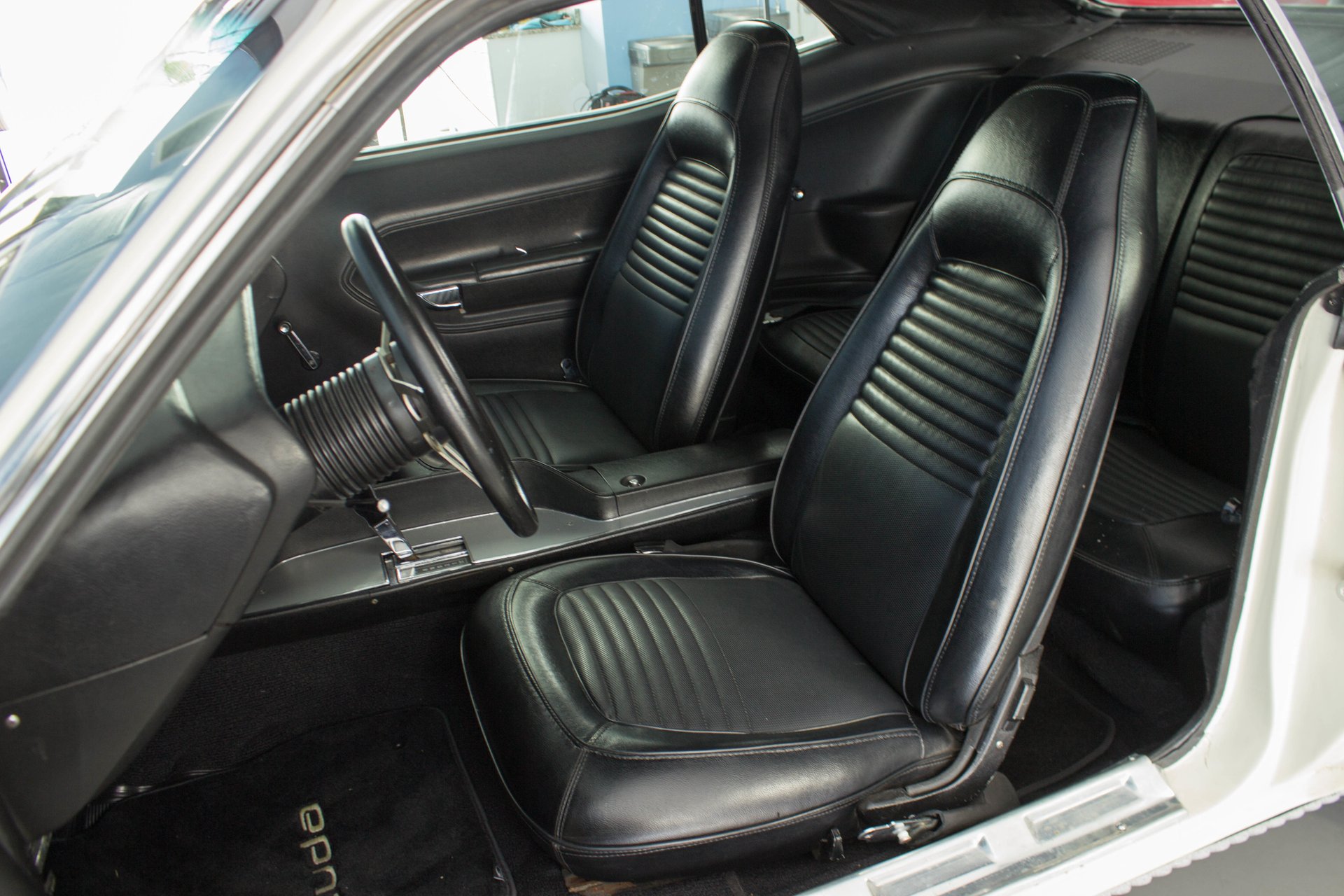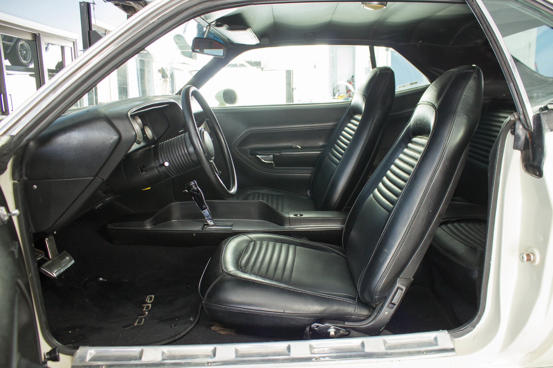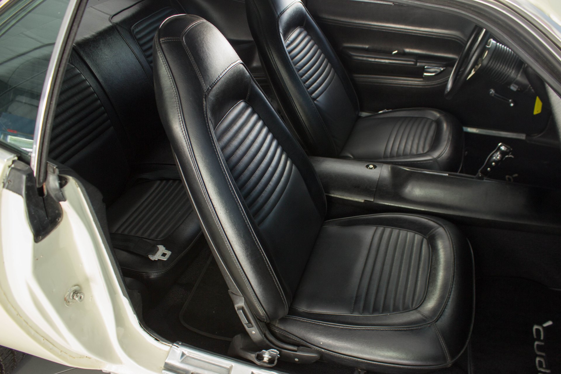 Black bucket seats and a center console are topped off with a cool Pistol Grip shifter. Everyone knows the Pistol Grip is a must have in a Mopar Muscle car, and this one has it despite being an automatic transmission. The gauges have been swapped out with modern Auto Meter gauges and a new AM/FM/CD/USB player has been installed cleanly in the dash. This Cuda has a modern A/C system to keep you cool on those hot summer cruise nights.