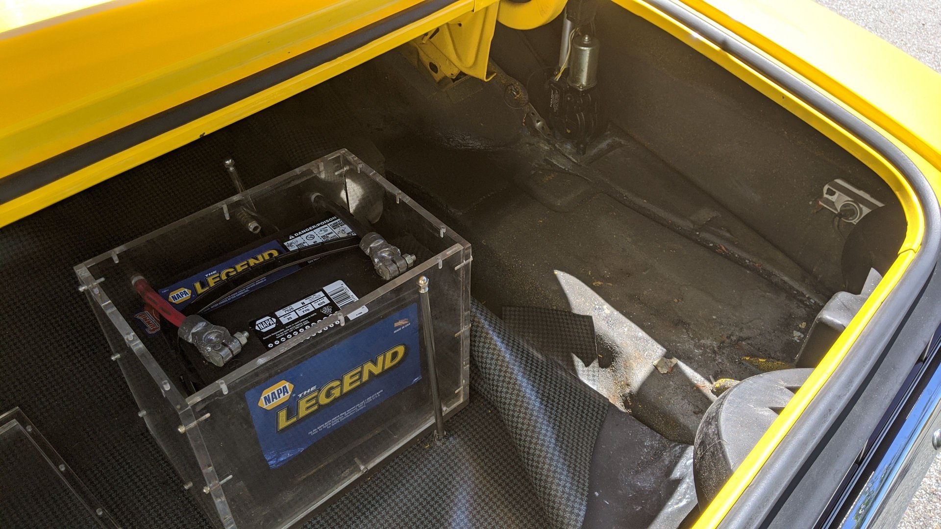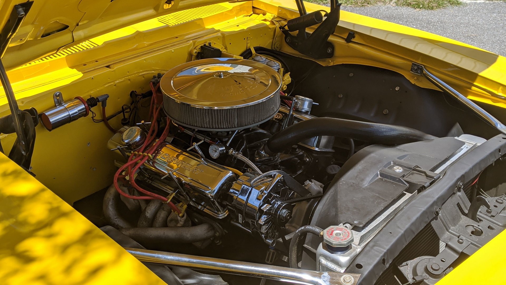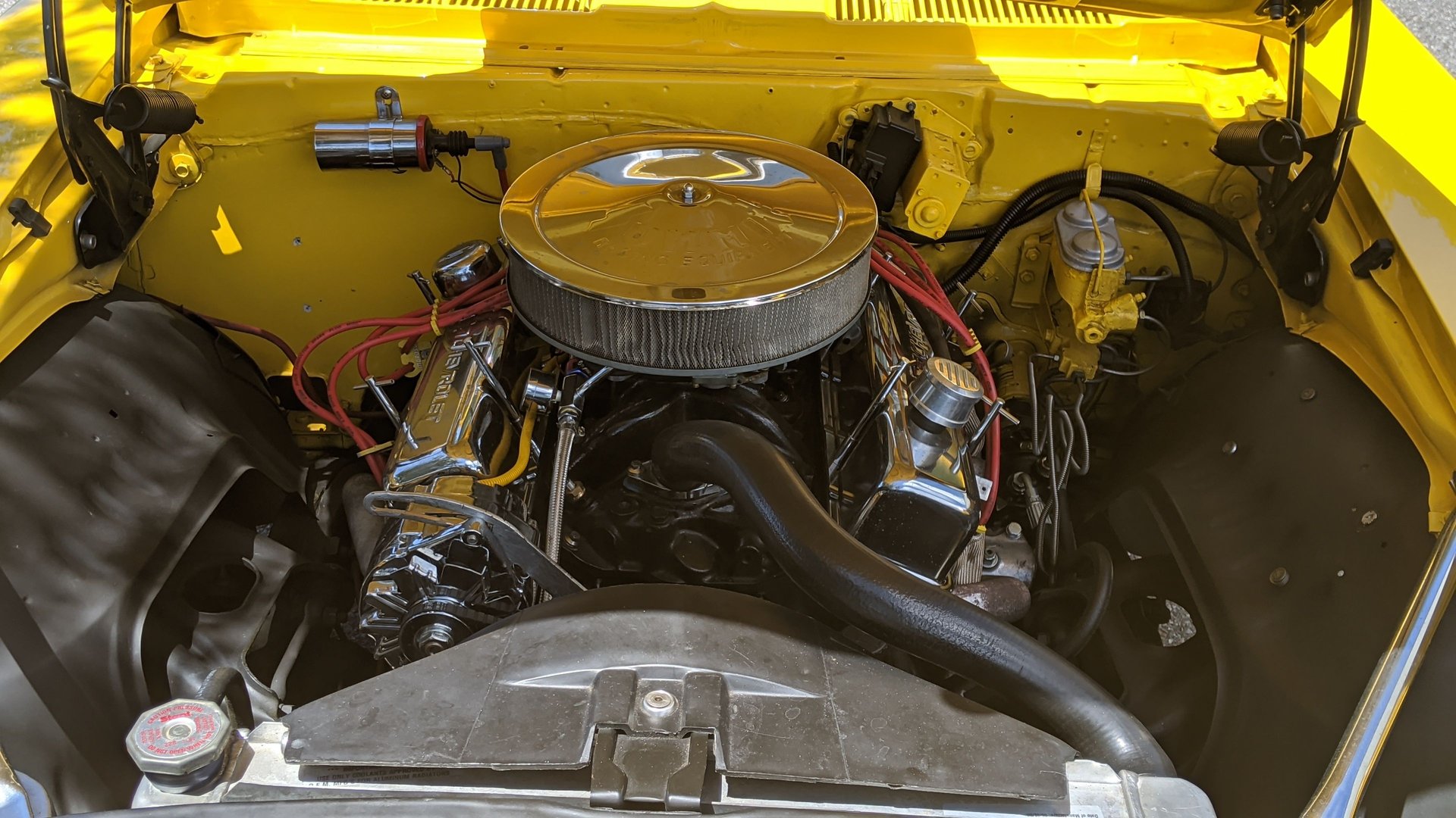 Our Camaro has a small block Chevy engine. It has a black painted block and intake, performance carb, headers, chrome valve covers and open element air cleaner, performance ignition system, performance spark plugs and wires, high-volume radiator and oil pan, and power brakes.
