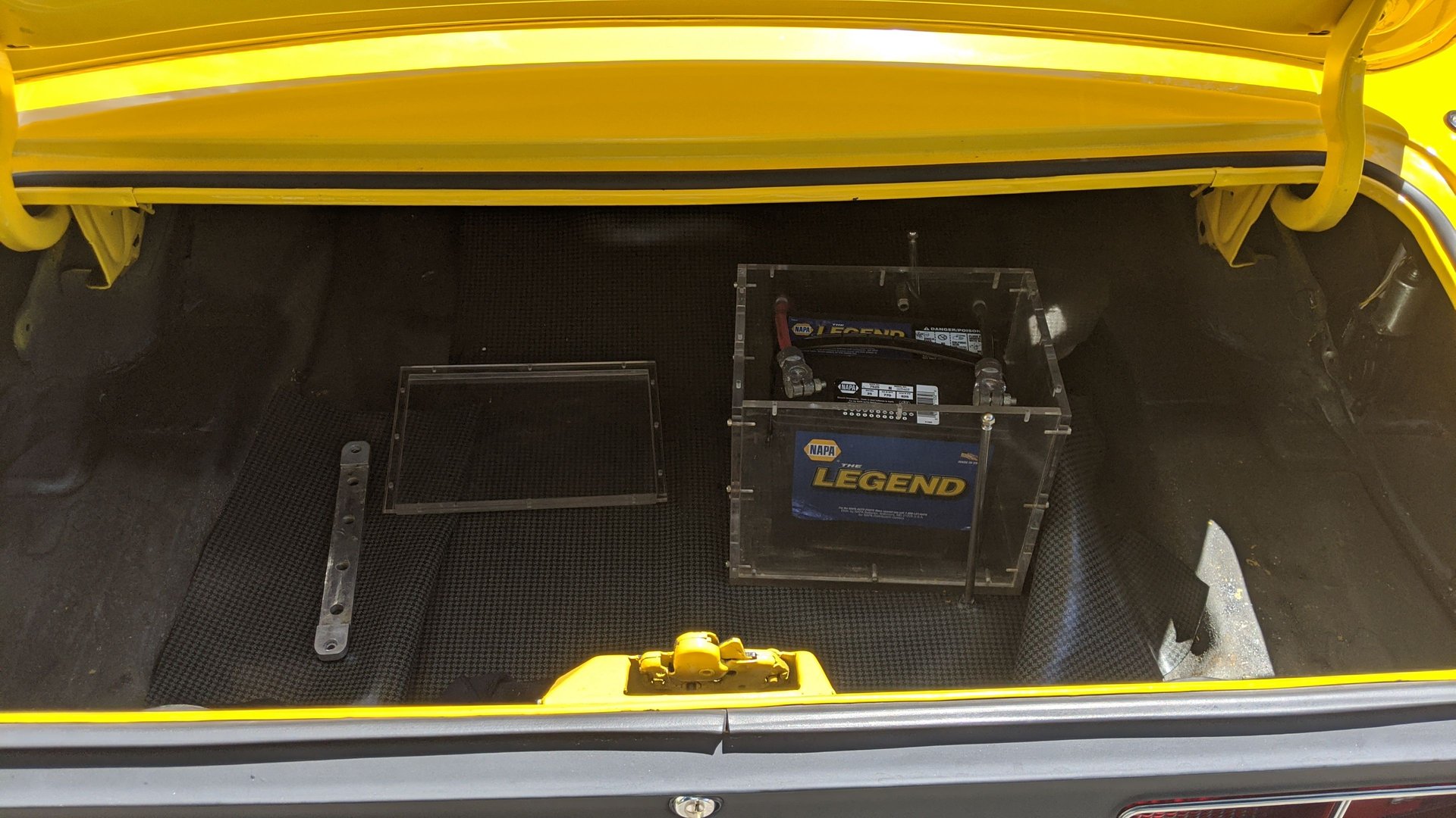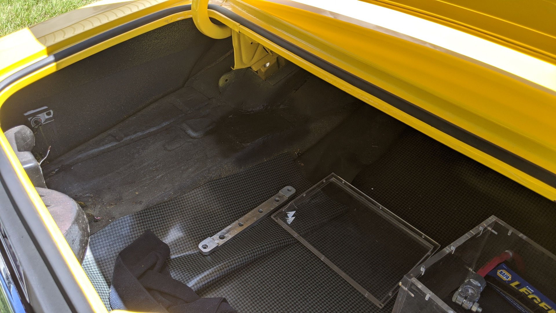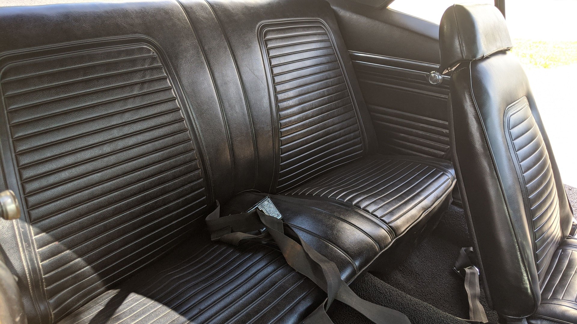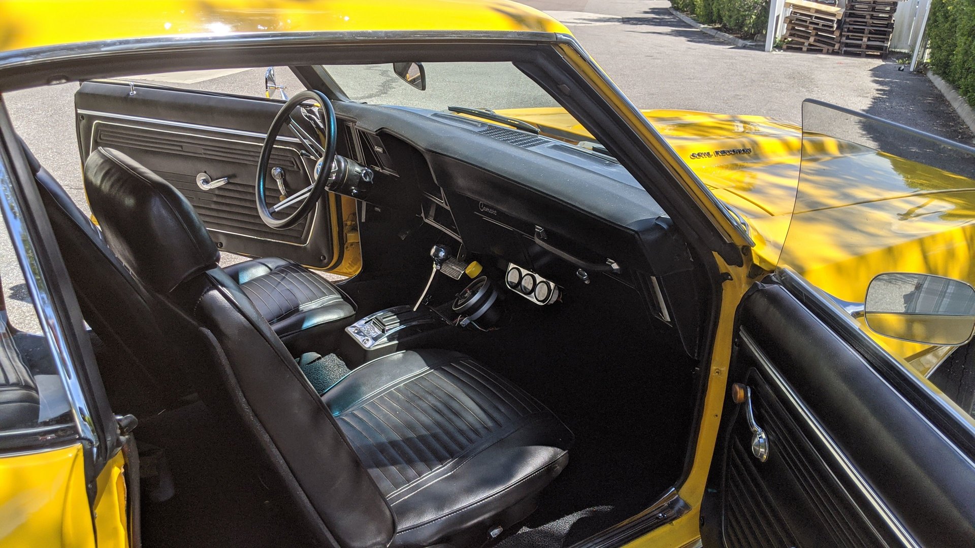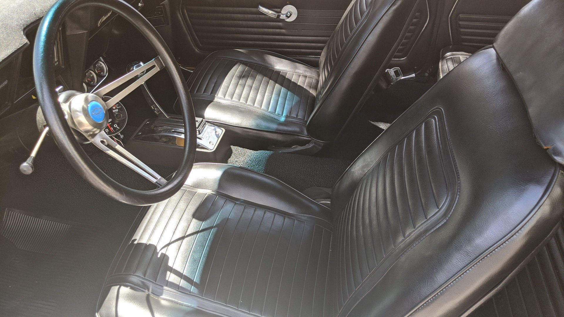 The black bucket seat interior looks all nice and close to like it left the factory with the addition of under the dash gauges, shift light, and tach, B&M aftermarket automatic shifter, factory dash and wood grain trim and the back seat matches the fronts. It has black carpet and all the factory trim and seat belts.