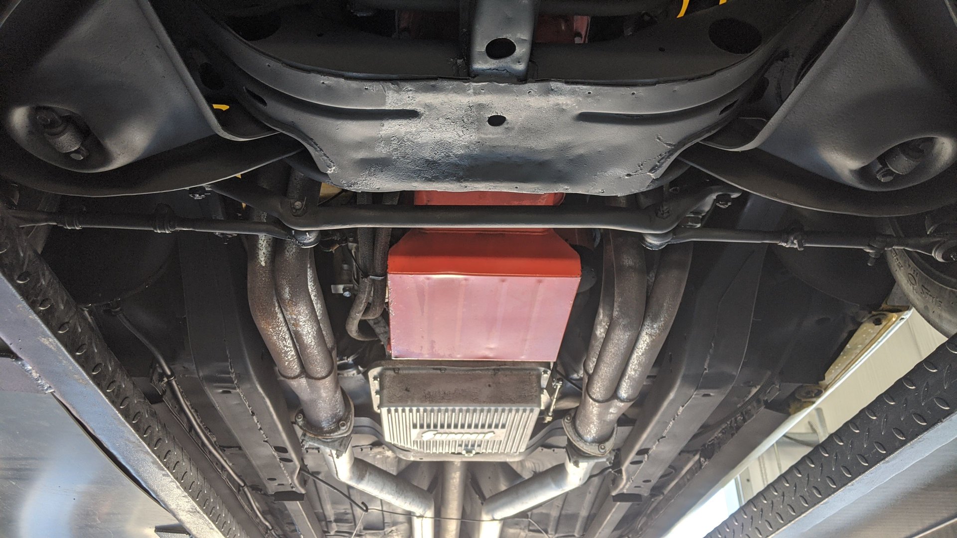 Our SS Camaro also has a Cowl Induction hood, rear spoiler, ladder bar traction bars, dual exhaust system, Rallye wheels with chrome trim rings, redline tires, and the GM 10-bolt rear end.