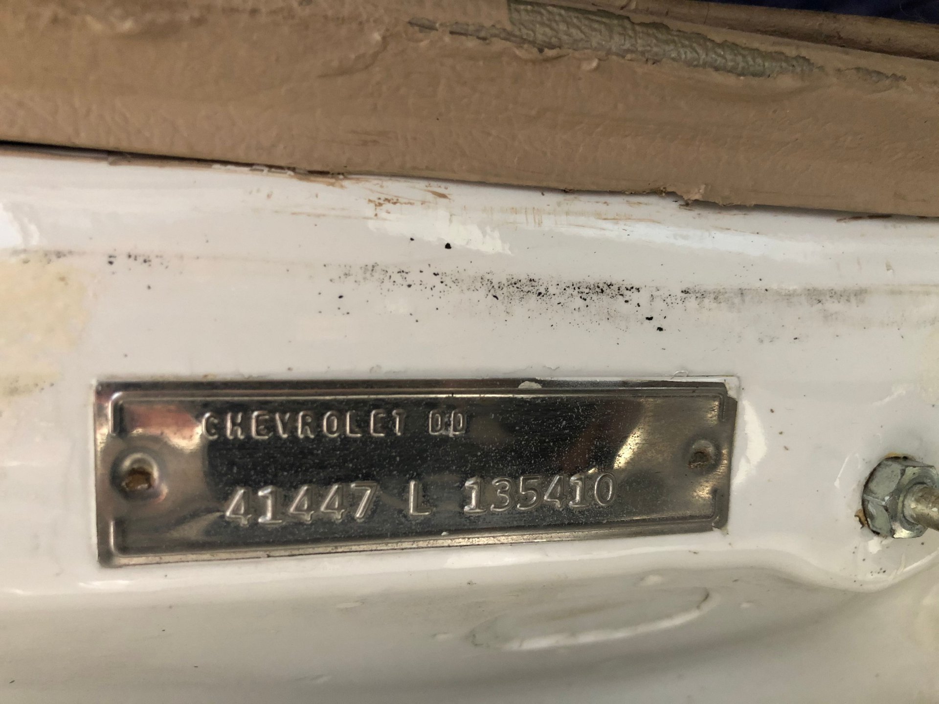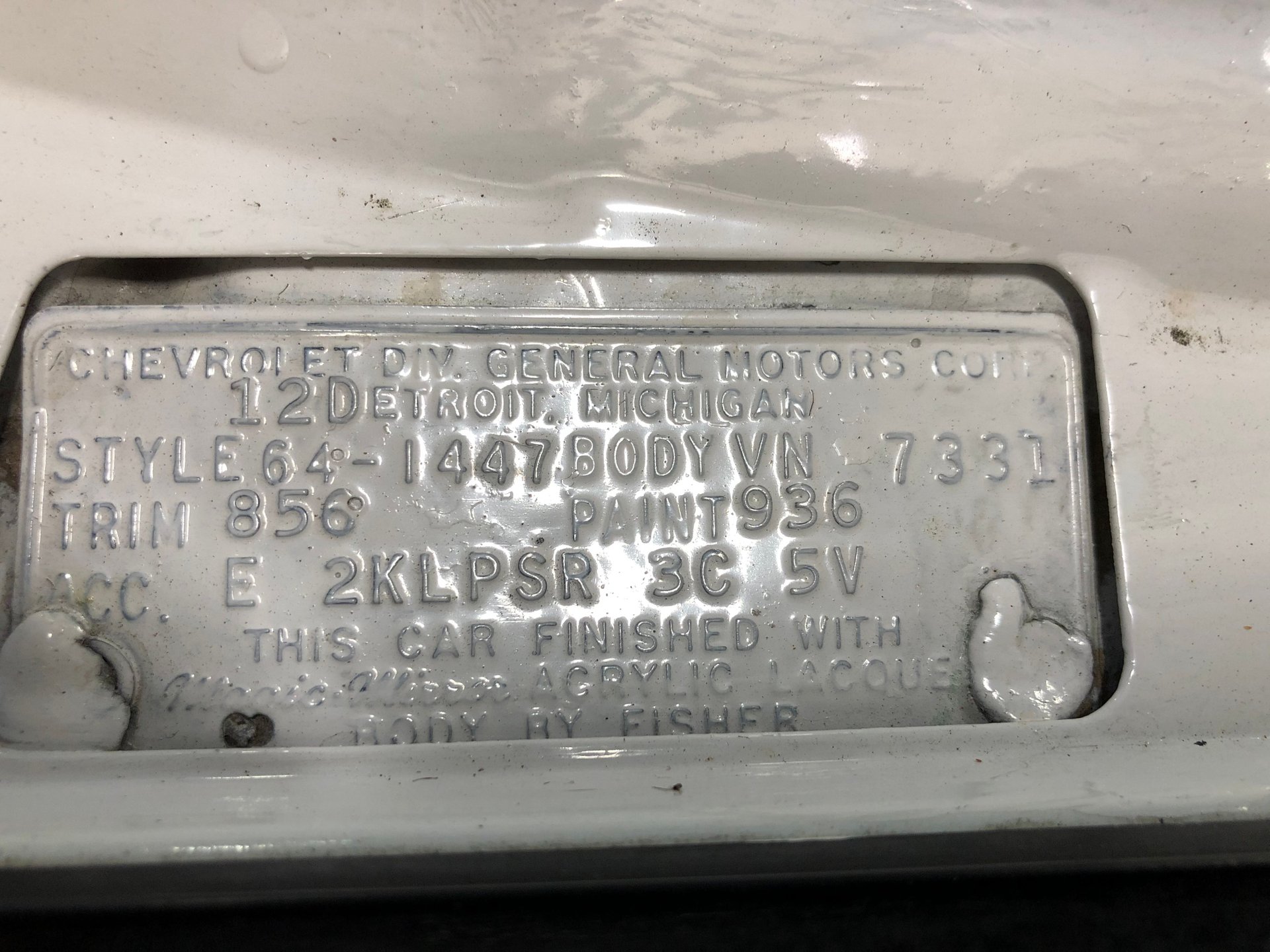 We have a real-deal, beautiful, completely worked over 1964 Chevy Impala SS here at Skyway Classics, verified with the Trim Tag showing it to be a Chevrolet Factory Code #1447 Impala SS painted the Color code # 936 exterior color of Ermine White and # 856 interior color of fawn.