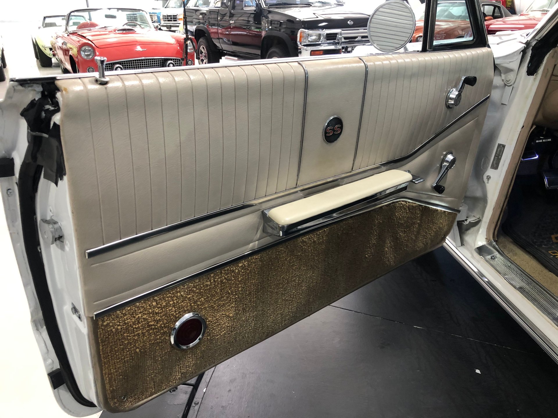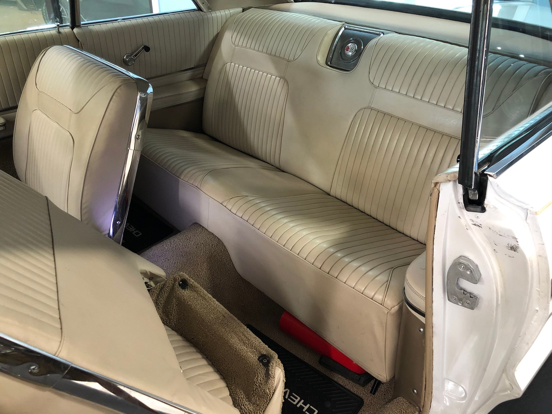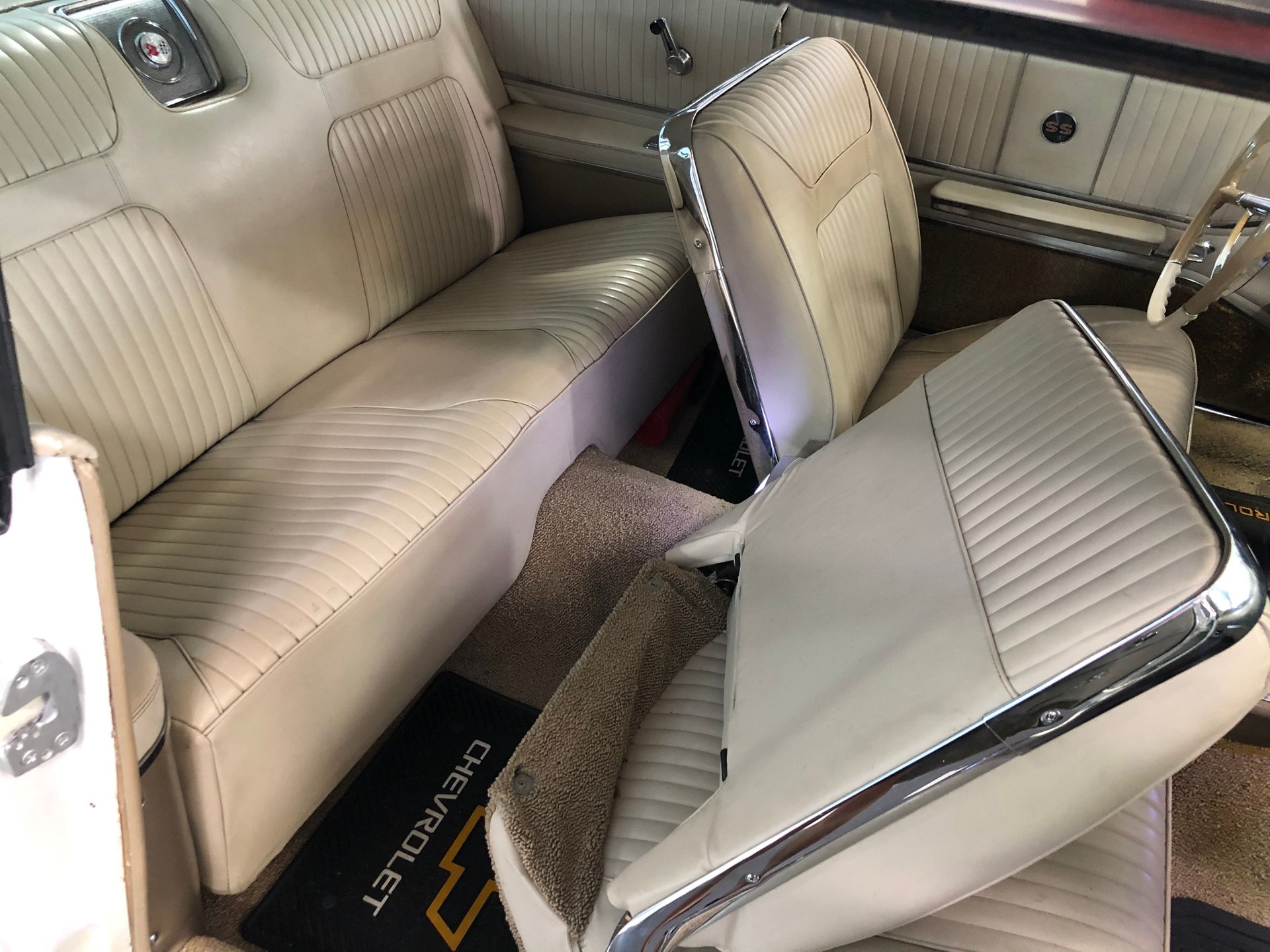 Restored and painted in painted the factory born with Color code of # 936 exterior color of Ermine White, this is a great looking Impala SS. The top has also been painted white to give it a very clean look as all the paint is in great shape as is the body with no issues and the outside looks fantastic.