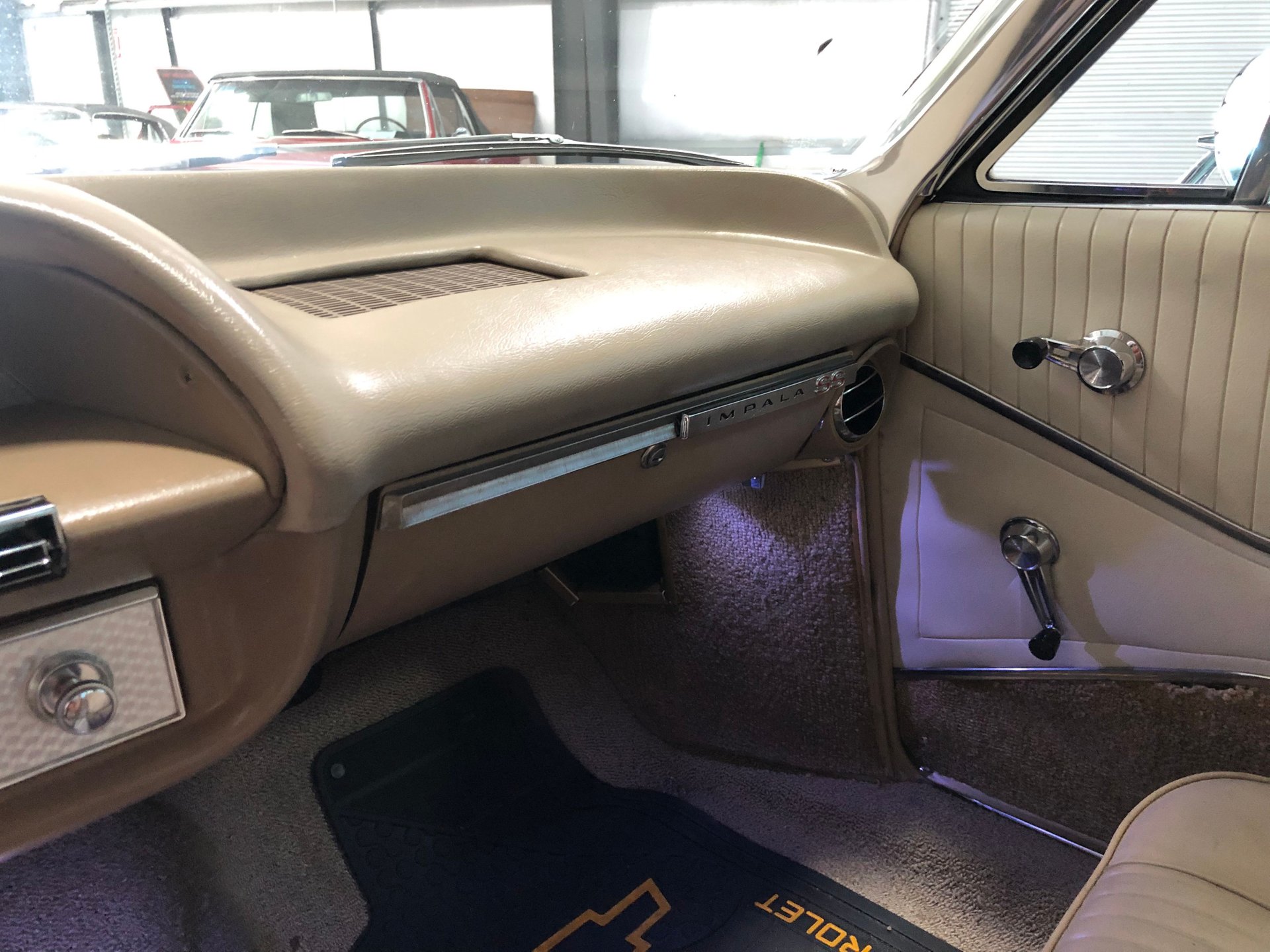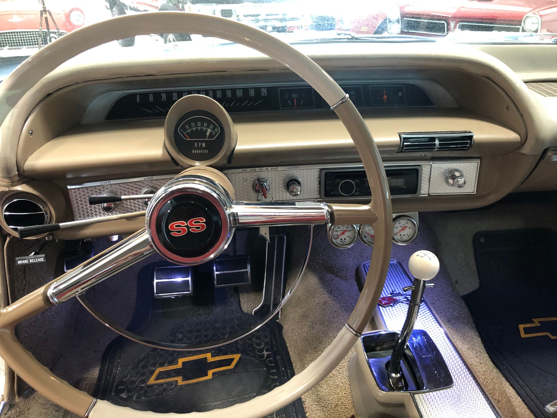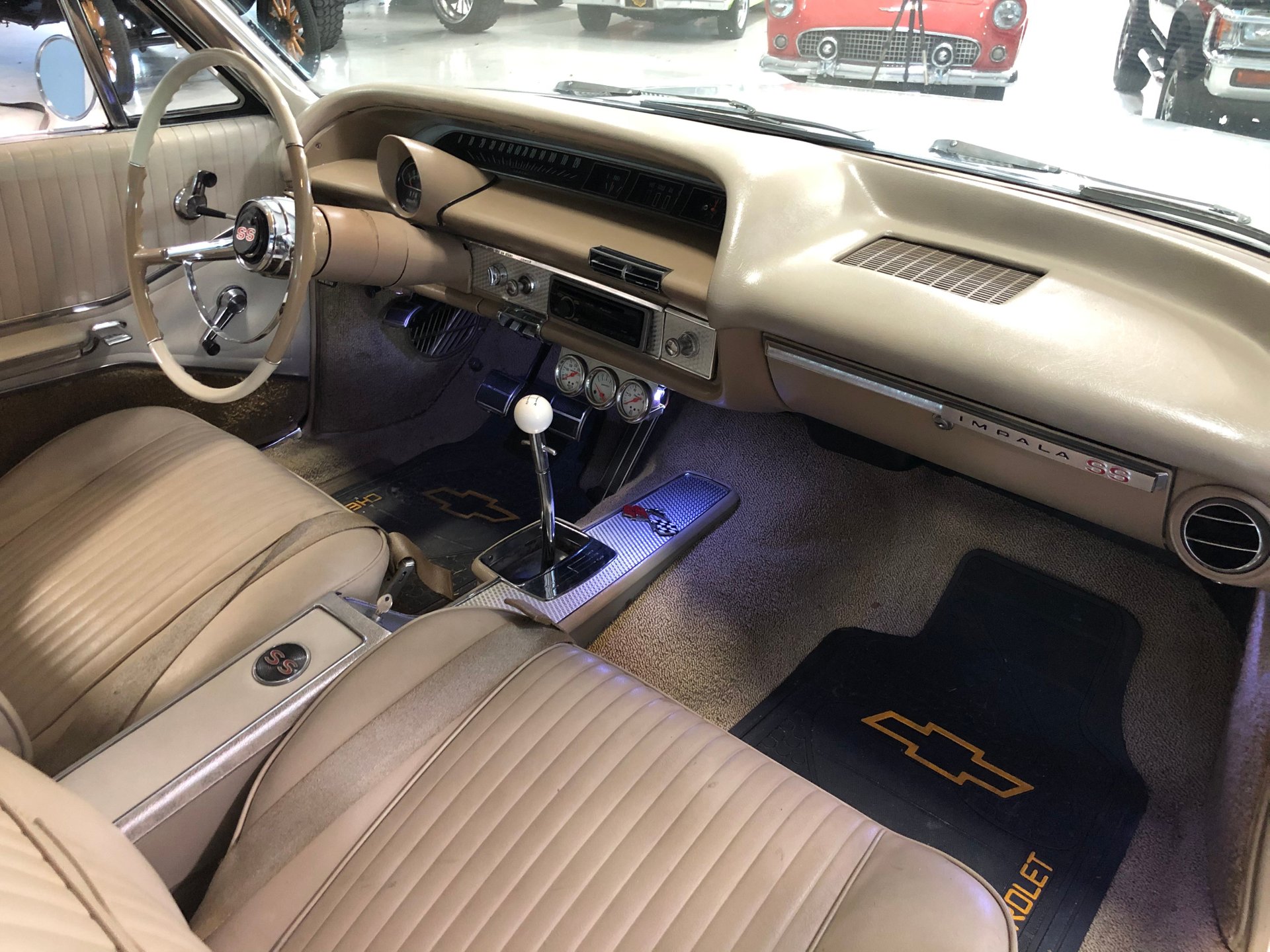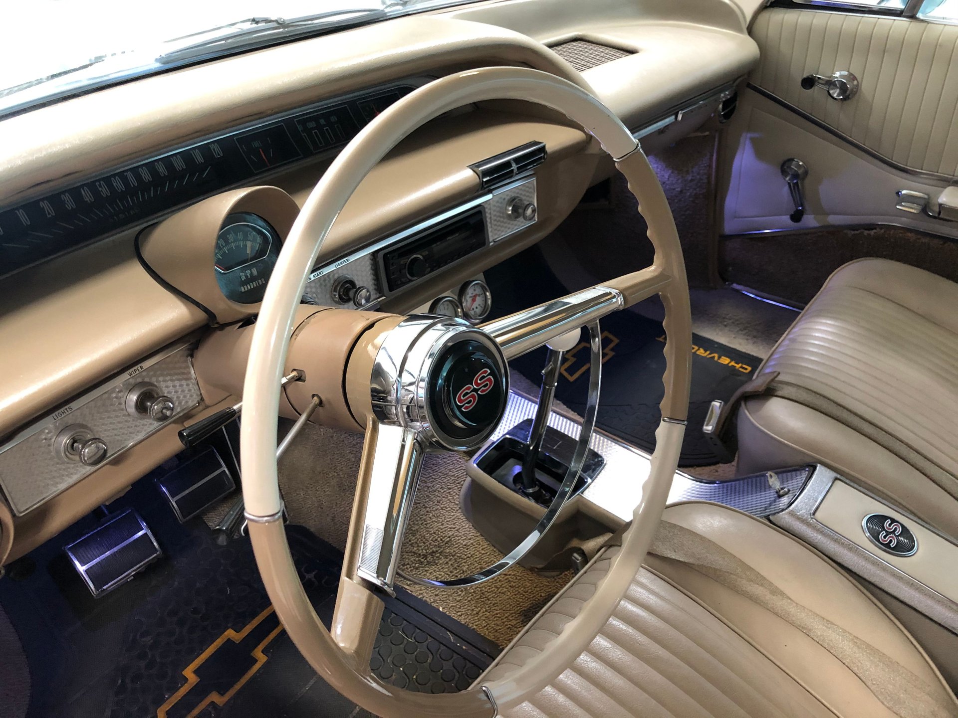 The interior is new fawn Deluxe vinyl on its bucket seats with chrome surrounds and matching rear seat that looks amazing! It has the middle factory console housing the chrome 4-spped shifter with white shifter ball, fawn colored carpet and door panels, SS emblems, plus the sharp Impala SS dash with the factory engine-turned plate and houses all the original gauges including a tachometer plus a set of aftermarket auxiliary gauges underneath.
